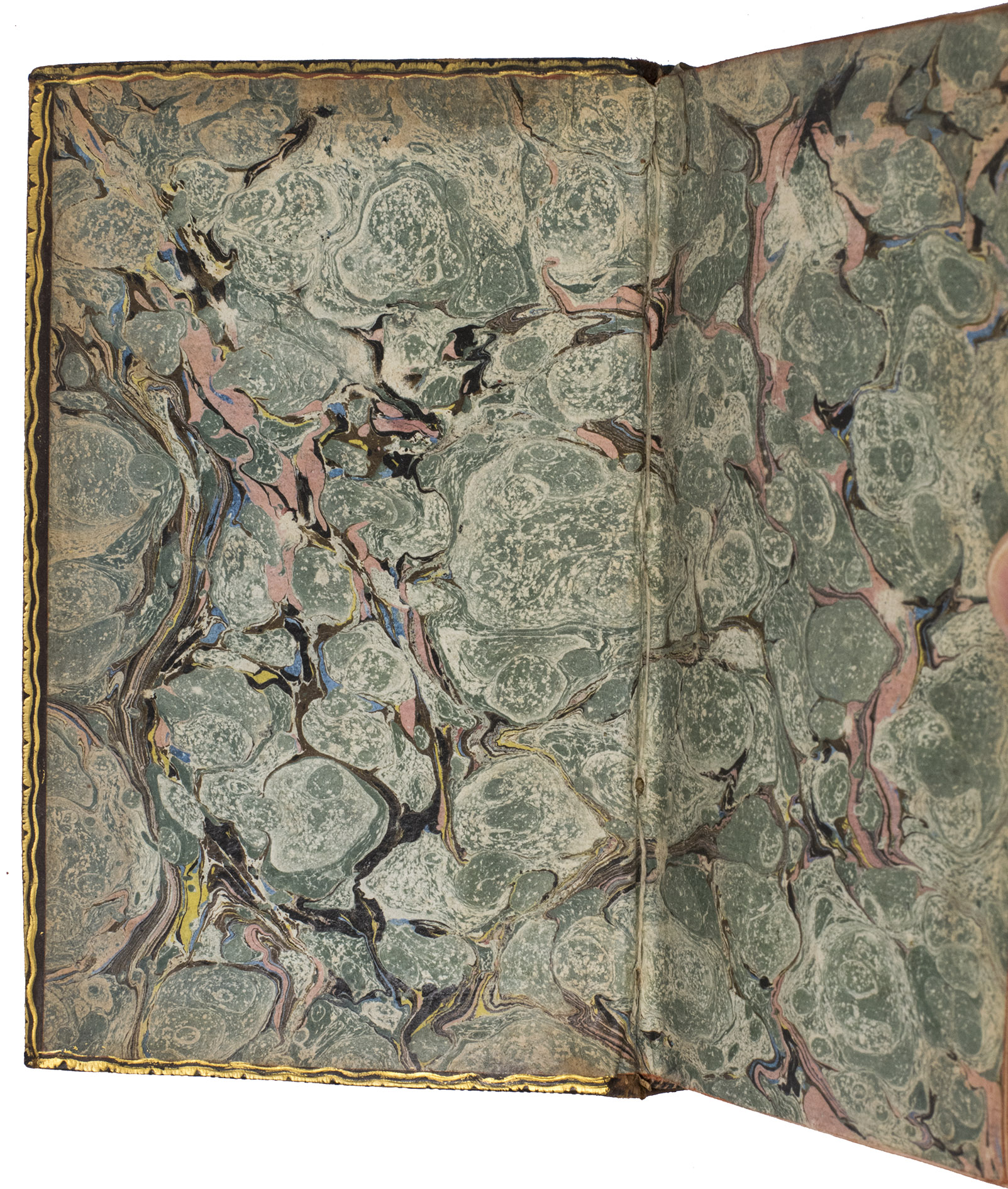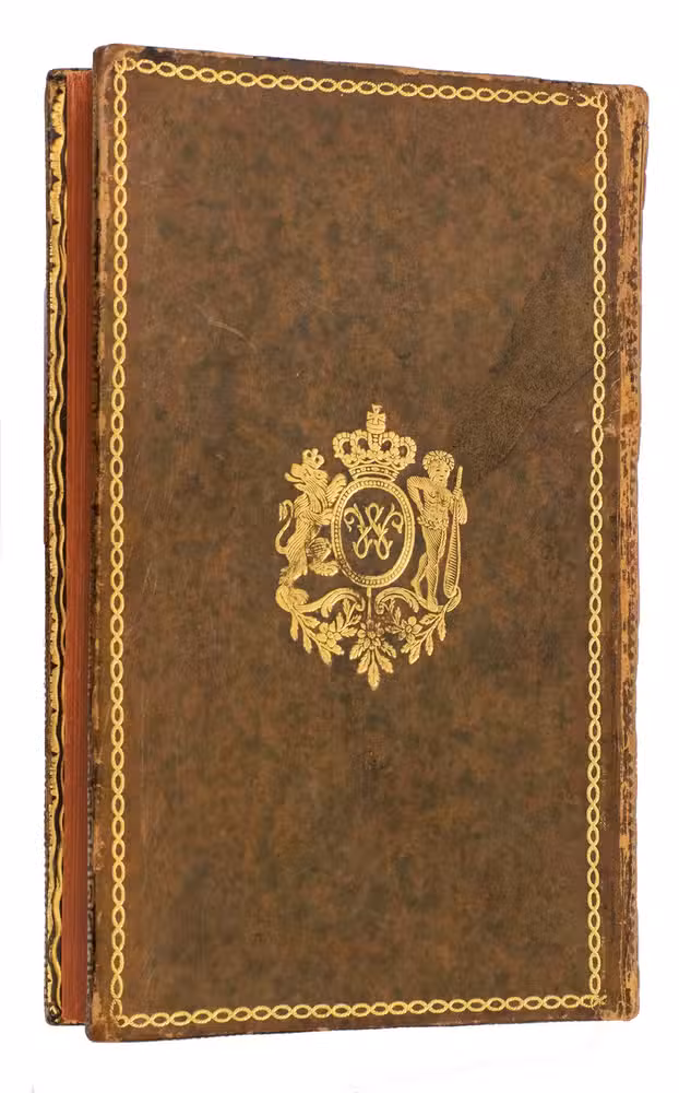 Amsterdam, Daniel Jean Changuion & Gabriel Dupour, 1791. 12mo. With a small tailpiece on the final page. Contemporary gold-tooled sprinkled calf, with a large gold-tooled centerpiece on both boards (a crowned shield with a "W", flanked by a crowned lion and a wild man with a club), with red morocco author and title labels lettered in gold on the spine, gold-tooled board edges and turn-ins, red edges, marbled endpapers. [1], [1 blank], [1], [1 blank], "328" [= 340] pp.