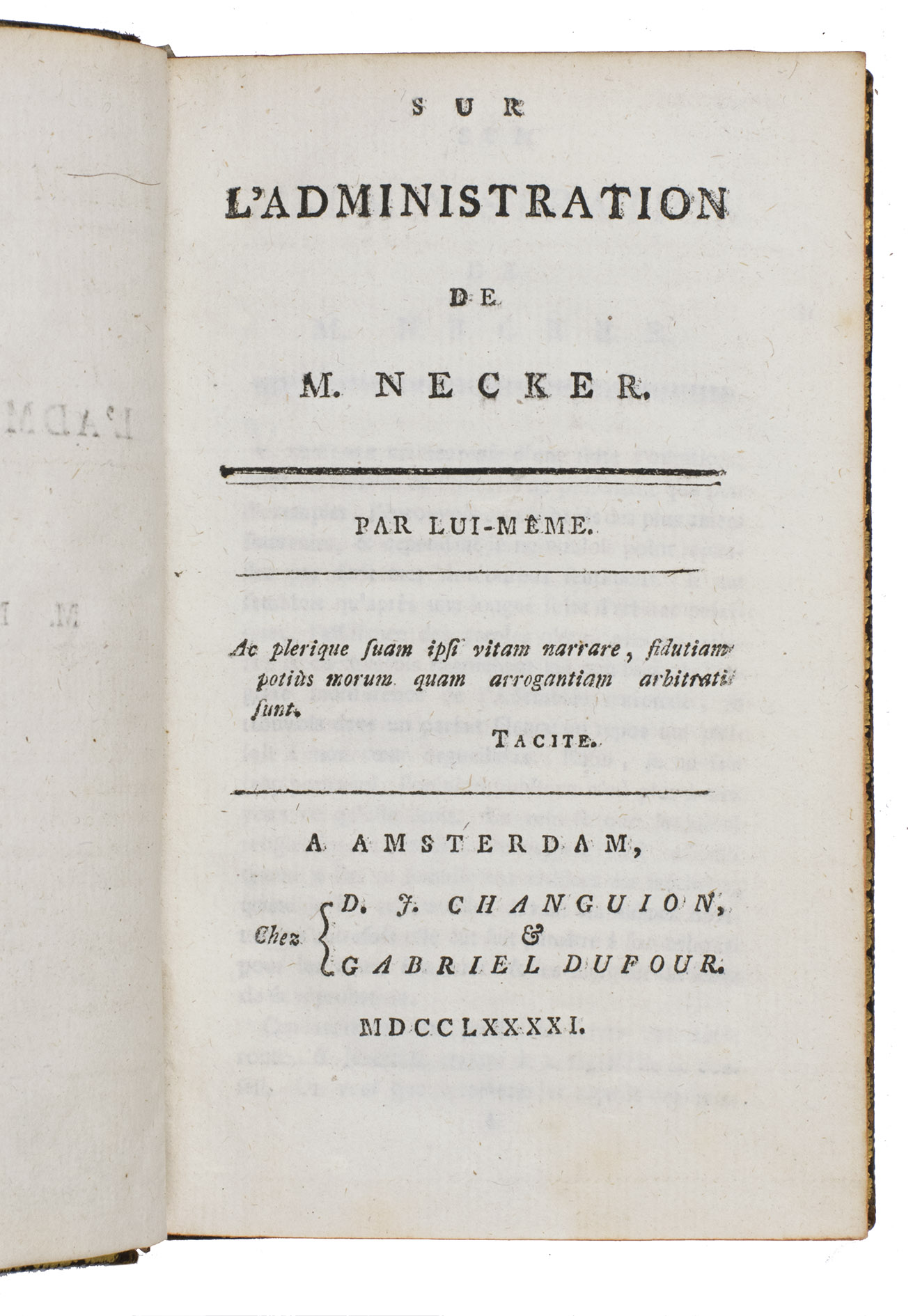 Very rare Amsterdam edition of the first edition of Necker's memoir, published in the same year: Paris, Hôtel Du Thou, 1791. The text is written by Jacques Necker (1732-1804), a Genevan banker who served from 1777 till 1781 as finance minister for King Louis XVI. He was a reformer but his innovations sometimes caused great discontent.