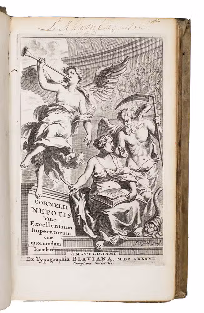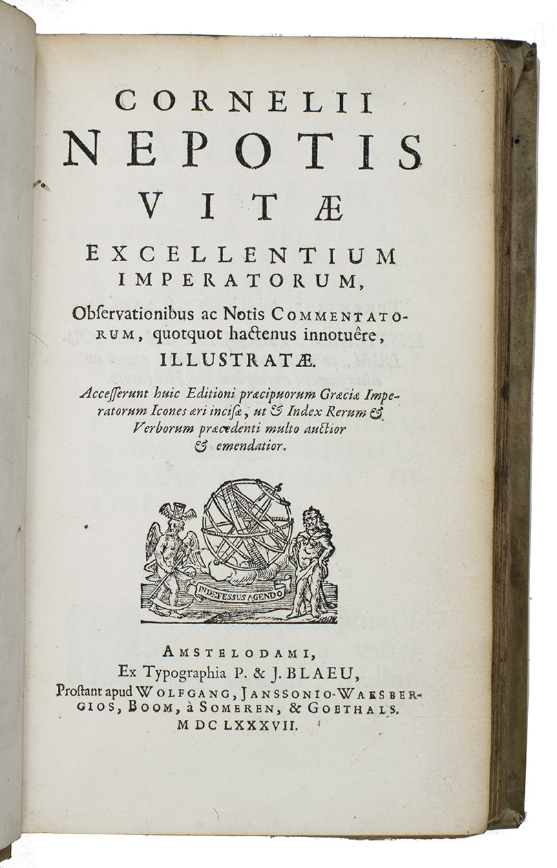 The anonymous editor of this 1675 edition seems to be Keuchenius, for the main body of Nepos work and his own notes have been preserved. In a short 'ad lectorem' (signed 'Keuchenius' in 1658, anonymous in 1675) the editor explains that he based his edition on those of Lambinus and Longolius. Our 1687 edition is a close verbatim, line by line reprint of this 1675 edition with the same lay-out and the same kind of typeface and with the very same frontispiece (with the address altered), this time published by the Blaeu brothers Pieter and Joan and a number of Amsterdam co-publishers.