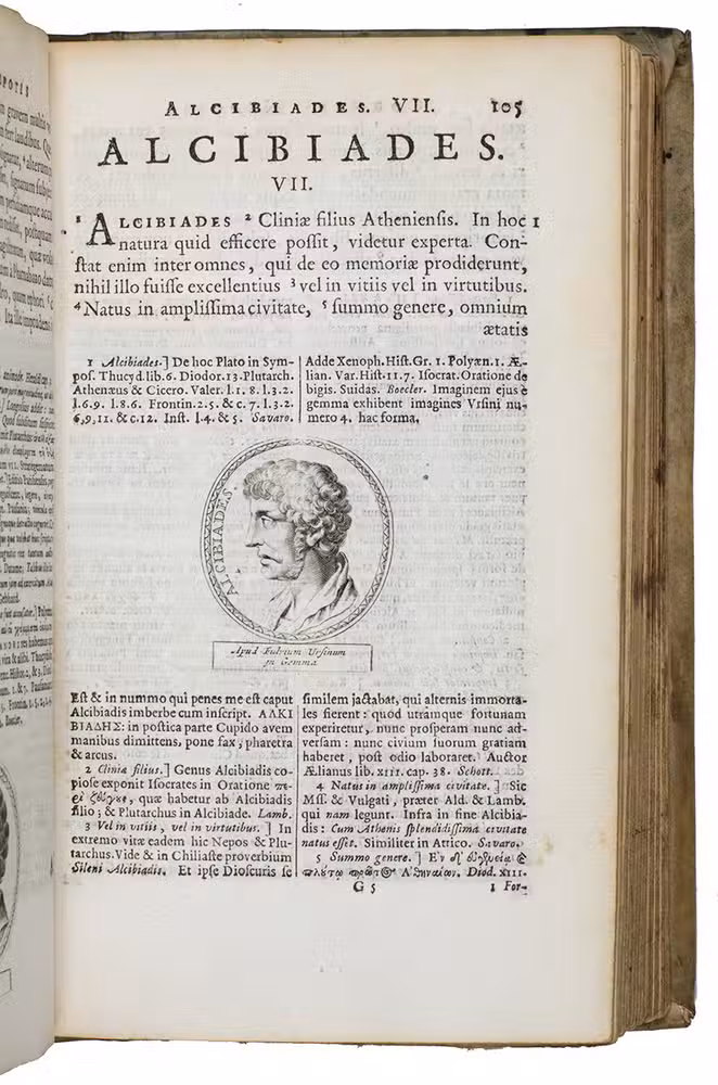 Amsterdam, Pieter and Joan Blaeu, prostant apud Abr. Wolfgang, Gillis & Joh. II Janssonio-Waesbergios, Widow Dirk & Henrik Boom, Widow Joh. à Someren, & Rembertus Goethals, 1687. 8vo. With an engraved frontispiece by Jan Visscher (Hollstein Dutch, 175-1(4)), 14 small engravings (mainly used as tailpieces), 11 depicting Greek and Carthaginian commanders in a medallion. Contemporary vellum, author's name written on the spine. [32], 439, [40] pp.