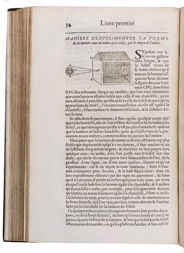 Mersenne was considered one of the foremost geometricians of the 17th century and maintained relationships with some of the leading scholars of Europe, including Galileo, as a correspondent and intermediary. He also developed principles related to the telescope and reflection well before Gregory and Newton wrote about them. In 1640, Mersenne embarked on a scientific journey to southern France and Italy, followed by a second trip to Italy in 1641, and a third in 1644-1645. His Optique, consists of 31 propositions published in French, rather than Latin, with a focus on practical application, although it likely held less value than Niceron's Perspective, with which it was paired. The Catoptrique consists of 16 propositions, refers to the study of reflections, reflecting surfaces, and mirrors in optics.