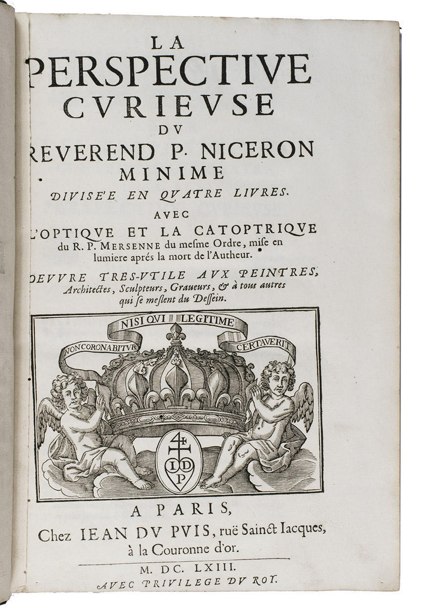 La perspective curieuse du reverend P. Niceron. Minime divisee en quatre livres. Loptique et la catoptrique du R. P. Mersenne du meseme ordre, mise en lumiere aprés la mort de lautheur. Oeuvre tres-utile aux peintres, architects, sculpteurs graveurs, & à tous autres qui se meslent du dessein.