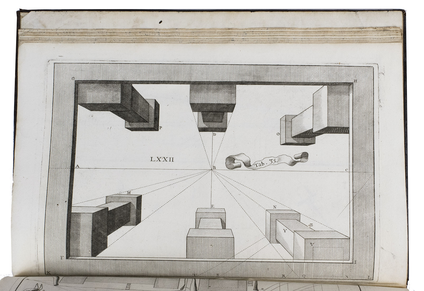 With an owner's inscription on the front paste-down "N. Krogstius[?] No 3" and four manuscript annotations - referring to the number of the corresponding plate or elaborating on the text - in the margins of pp. 97, 98, 157 and 167, one in ink and three in pencil. The binding shows signs of wear, front hinge cracked, small worm holes in the boards. Some (near) contemporary waste paper visible in the gutters of the first and last flyleaves showing a cursive manuscript text in brown ink. The leaves are cut slightly short, barely affecting any text, slightly browned throughout (varying from quire to quire). Plates 49 and 50 are bound upside down and thus placing plate 49 after plate 50. Otherwise in good condition. Caillet, 7972; Cicognara, 849 (1638 edition); DSB, X, pp. 103; Hofer, Baroque book illustration, 41; The Millard architectural collection, French 124.
