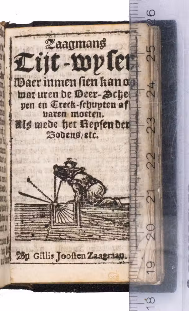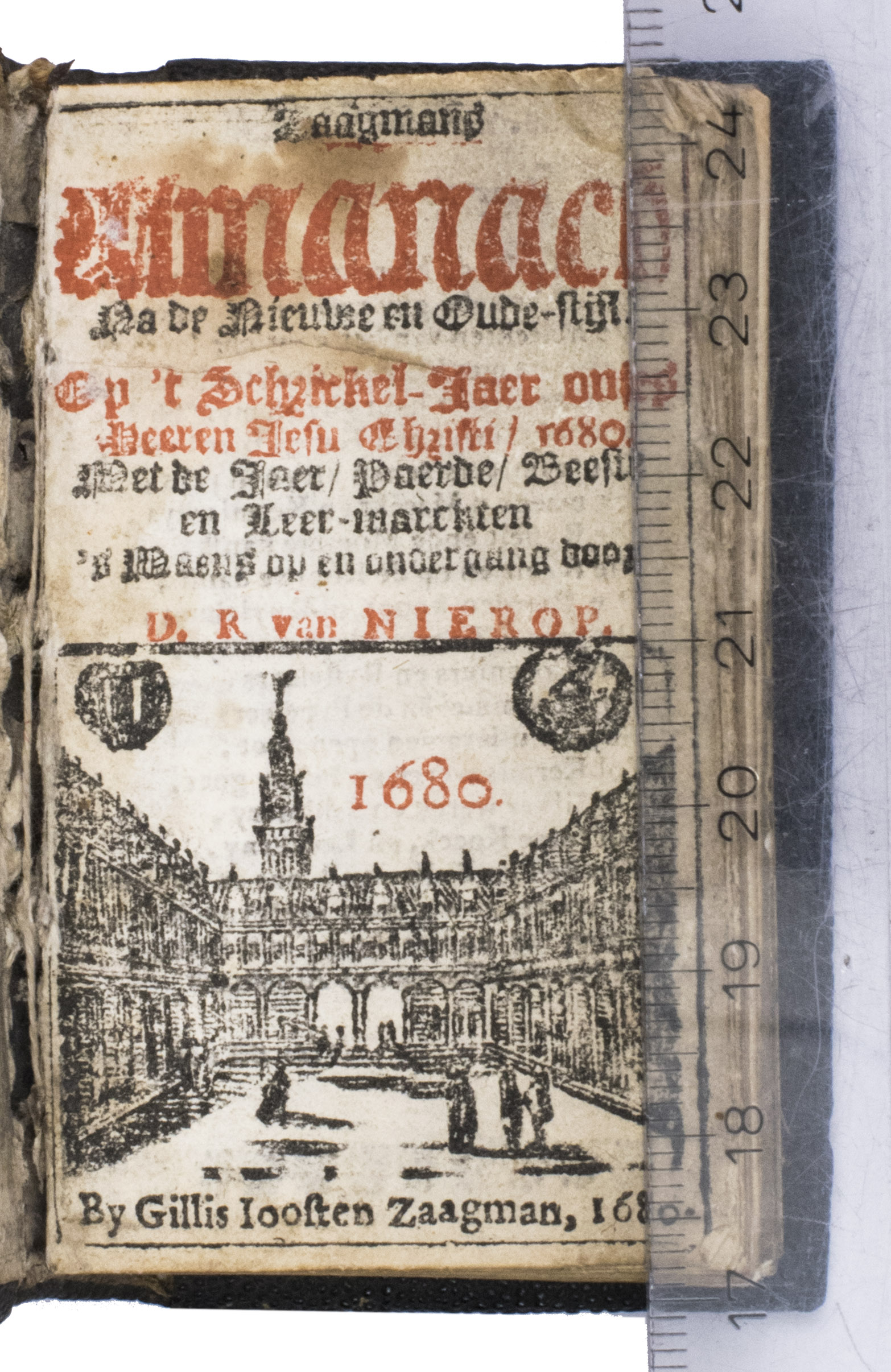 Unrecorded issue of the 1680 edition of the popular Amsterdam almanac, compiled by Dirck Rembrantsz. van Nierop (1610-1682) and published by Gilles Joosten Zaagman, often spelled Saeghman, a famous publisher of almanacs, popular books and prints, active at Amsterdam between 1642 and 1702. Although the present almanac was very popular and published for many years, the present issue has not been recorded anywhere. We have only been able to find one copy of an almanac published by Zaagmans for the same year and with the same title, but with a different woodcut vignette on the title page.