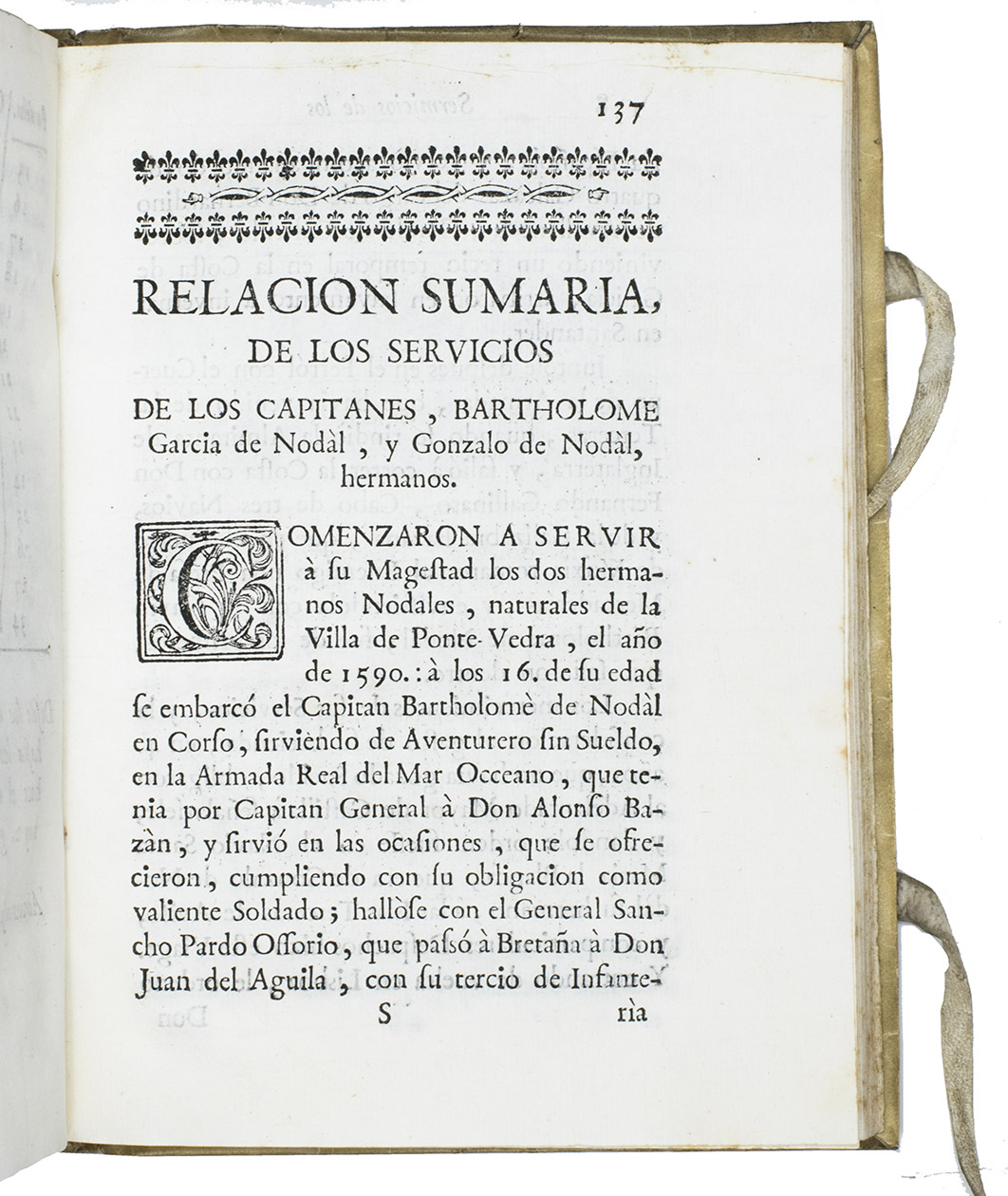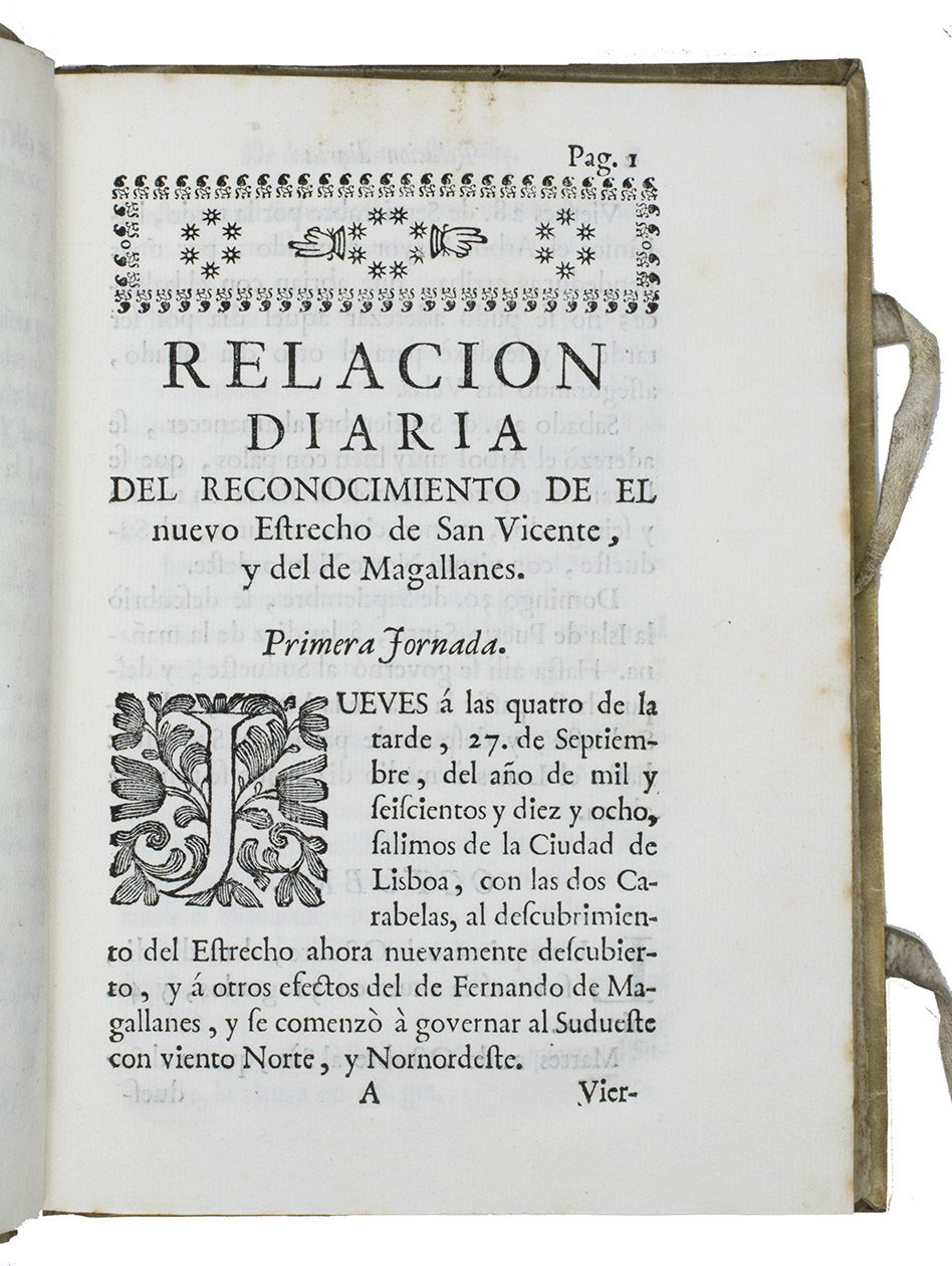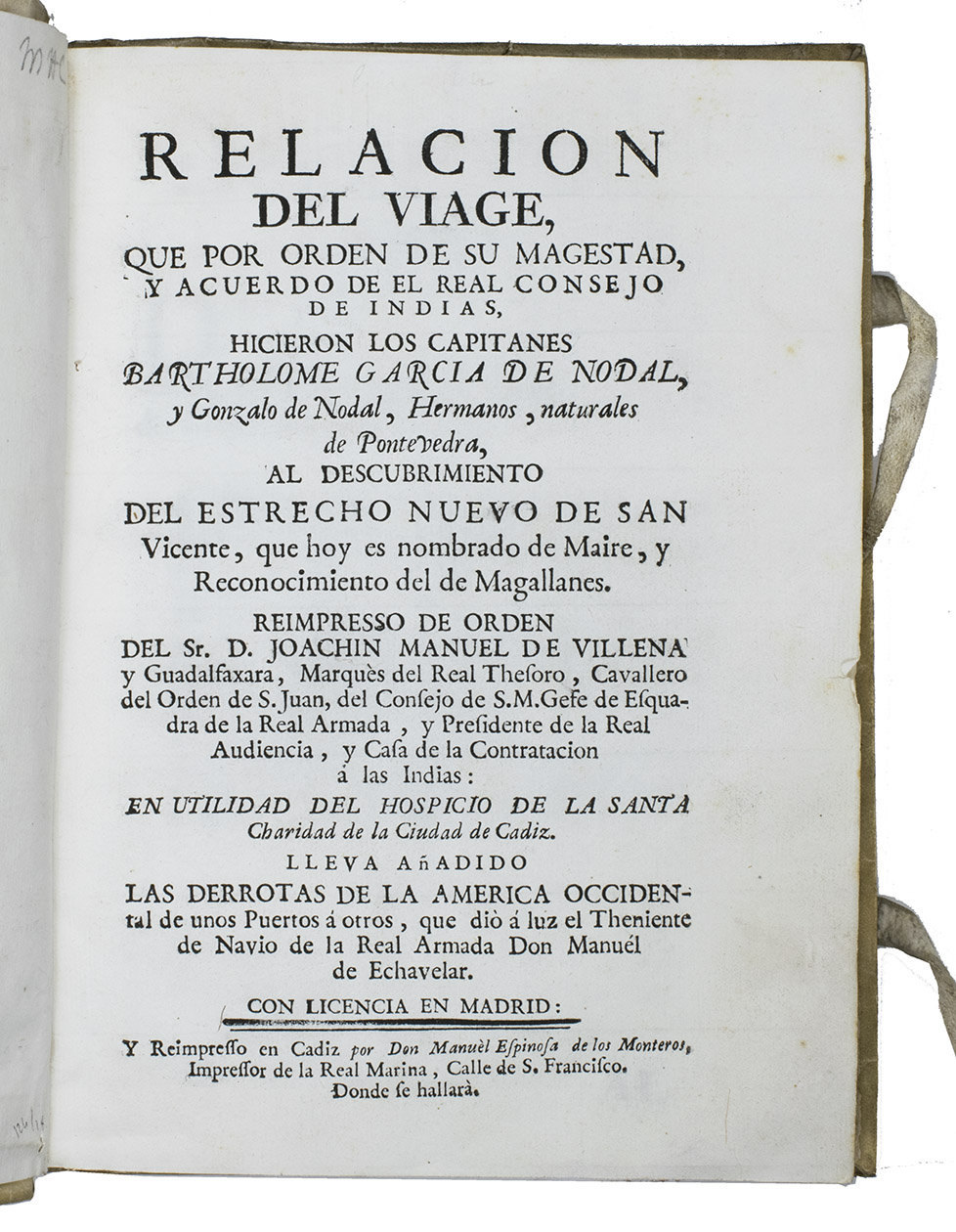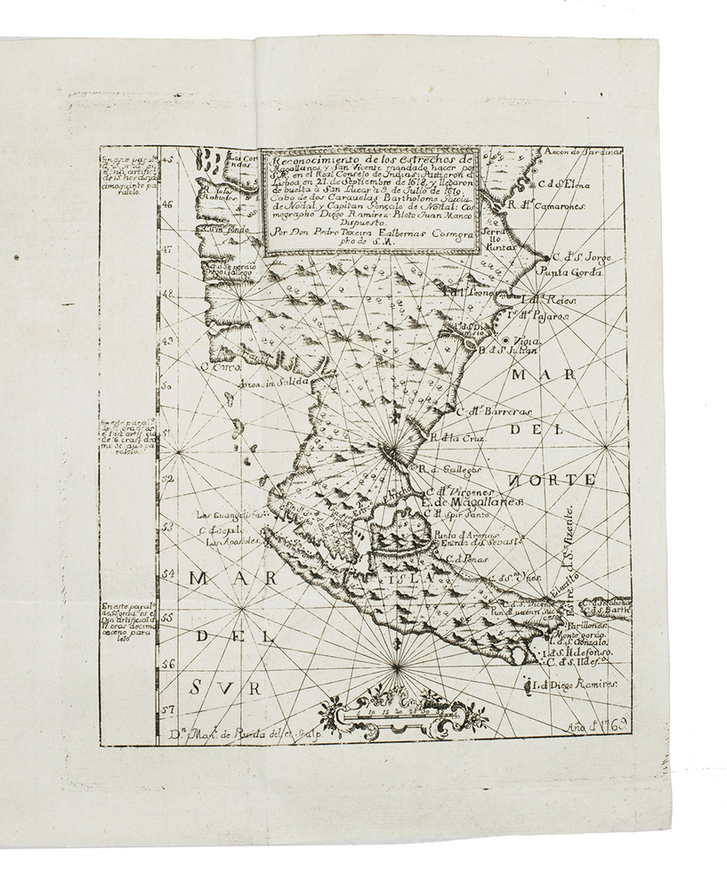 Second edition of an account of the voyage to the Strait of Magellan and Strait of Le Maire (which they named Strait of San Vicente) and the first extensive exploration of the latter and its surroundings, by the brothers, Captains Bartolome Garcia (1574-1619) and Gonzalo (1578-1622) De Nodal. Philip III commissioned them to investigate the passage into the Pacific to the south of Tierra del Fuego in 1618 and they gained fame as the first to circumnavigate Tierra del Fuego in 1618-1619. The Dutch navigator Jacob Le Maire had discovered the strait 1615-1617, shortly before the Nodal brothers, and it is still known by his name. The De Nodals' map is more detailed than Le Maire's.