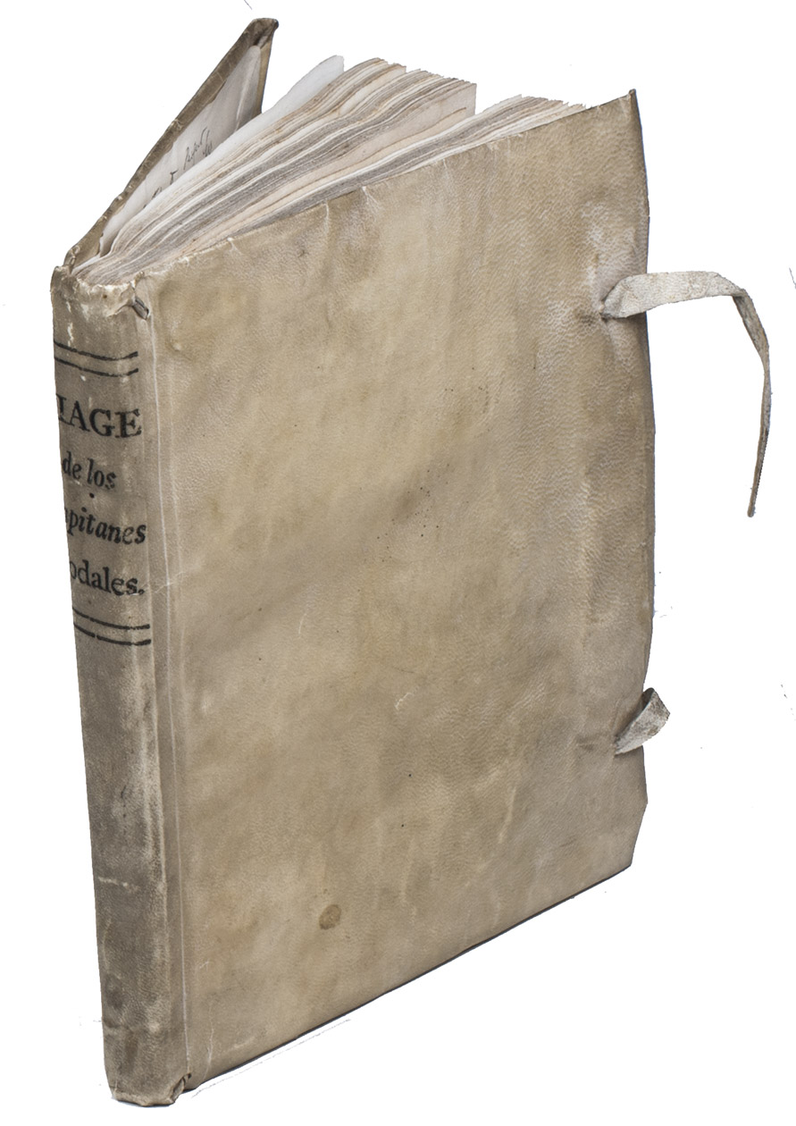 Cadiz, Don Manuel Espinosa de los Monteros, Impressor de la Real Marina, [1766?-1769]. 4to. With a folding map of the Strait of Magellan drawn and engraved by D.M. de Rueda, dated 1769. 2 parts in 1 volume. 4to. Contemporary limp sheepskin parchment by the Cadiz printing office's own bindery. [18], [2 blank], "162" [= 164], [2], [2 blank]; 41, [2], [1 blank] pp.