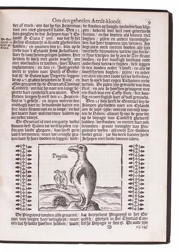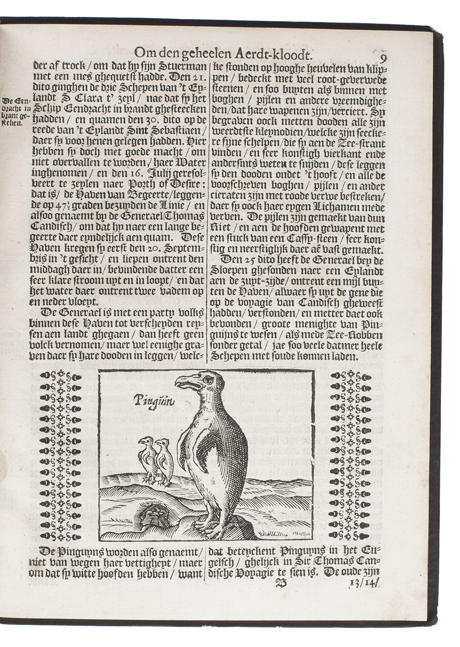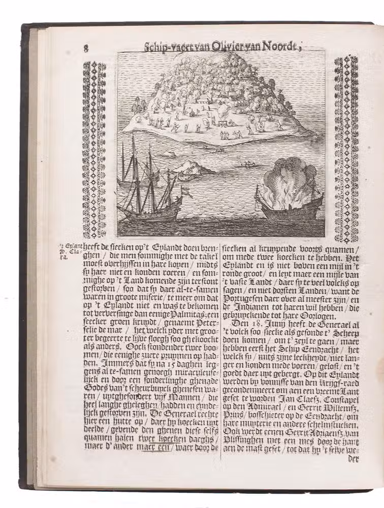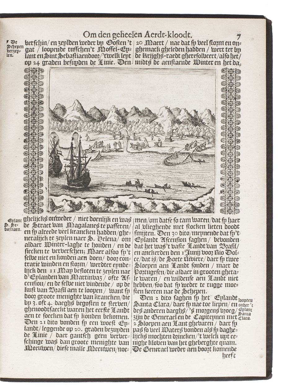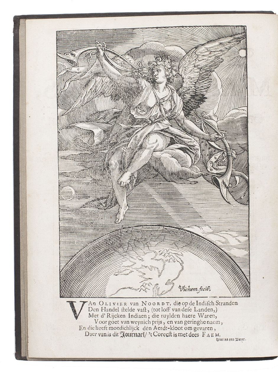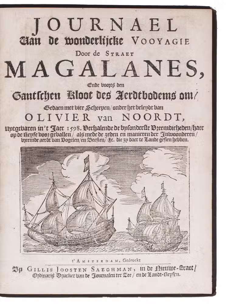 Rare edition of the famous account of the circumnavigation by Olivier van Noort (1559-1627) in the years 1598 to 1601. Van Noort was the fourth to circumnavigate the globe and the first Dutchman to do so. His predecessors were Magellan, Drake and Cavendish. He left Holland in 1598 with four ships and orders to attack the Spanish and Portuguese and harass them in any way possible. After many adventures Van Noort returned in 1601 with only one ship and only a few dozen of his crew. Those few had survived numerous skirmishes with the Portuguese and Spanish, and attacks by natives at Puerto Deseada and Tierra del Fuego, the former described here as "zeer groot van gestalte" (very large in stature) leading to tales of giants. They suffered from scurvy and survived on penguin meat and ostrich eggs. Van Noort's story was extremely popular and as the first Dutchman to sail round the world he was revered out of national pride, even though his voyage accomplished little.