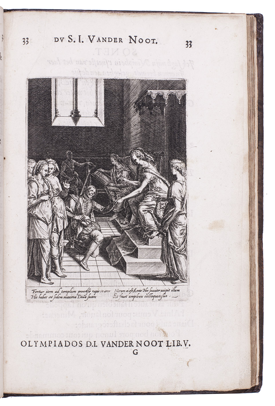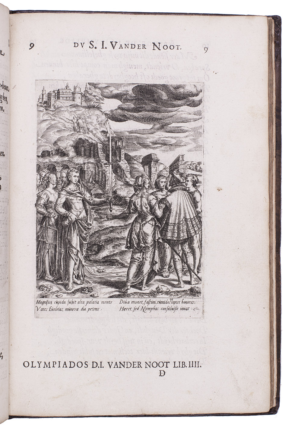 The 17 finely engraved illustrations show episodes from the 12 books of the poem. Two bear the signature of the engraver Dirck Volkertsz. Coornhert, the latter, depicting Van der Noot's conversation with Theude, dated 1571. This shows that Van der Noot was already working on his Olympia epics by that time and that Coornhert, Hendrick Goltzius's master, engraved the plates while living in exile in the German Rhineland. The work was probably largely finished at that time. The woodcut with the allegorical obelisk with "hieroglyphs" (pictorial images in a wholly Western style) is one of the earliest examples of mystical interest in ancient Egypt.