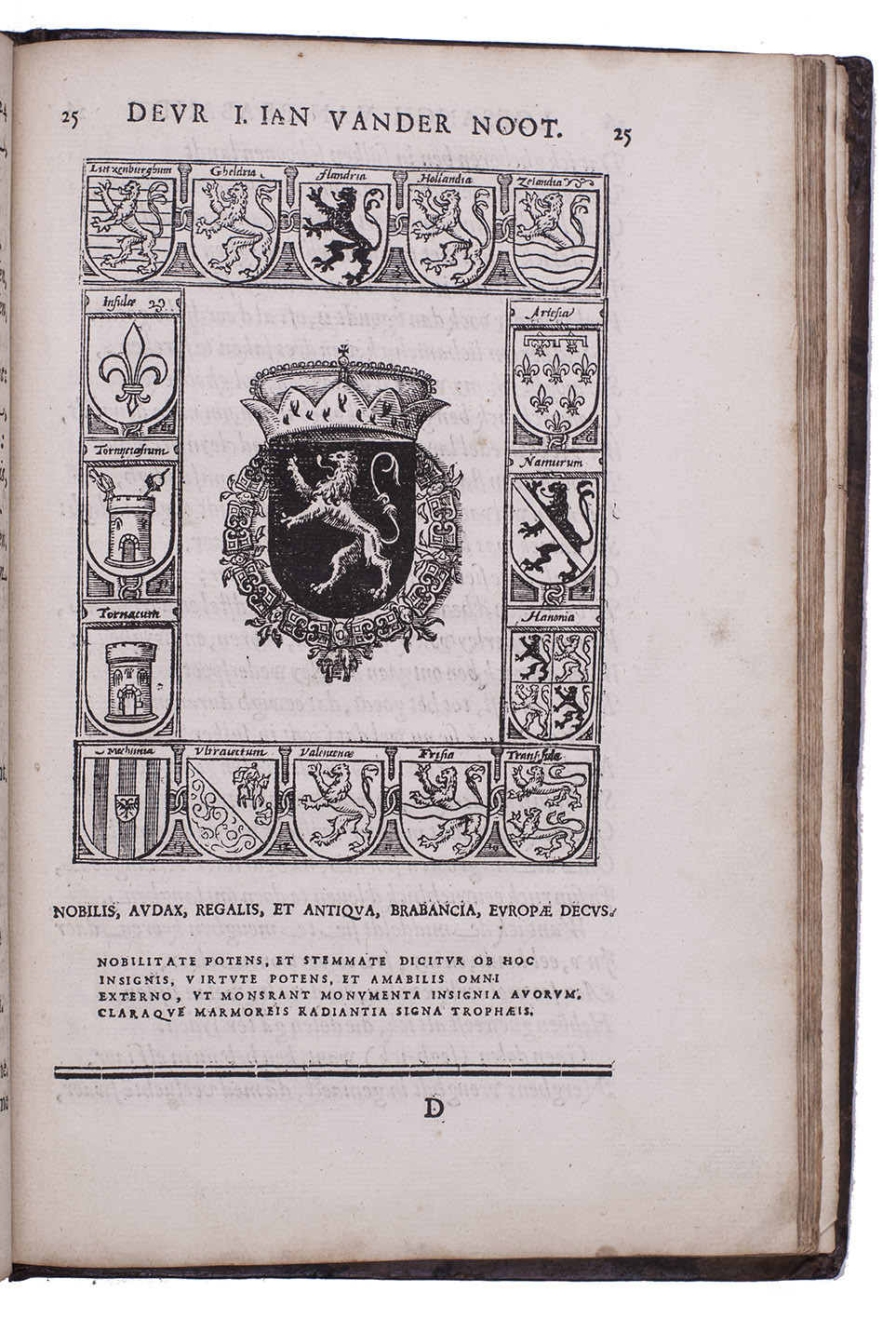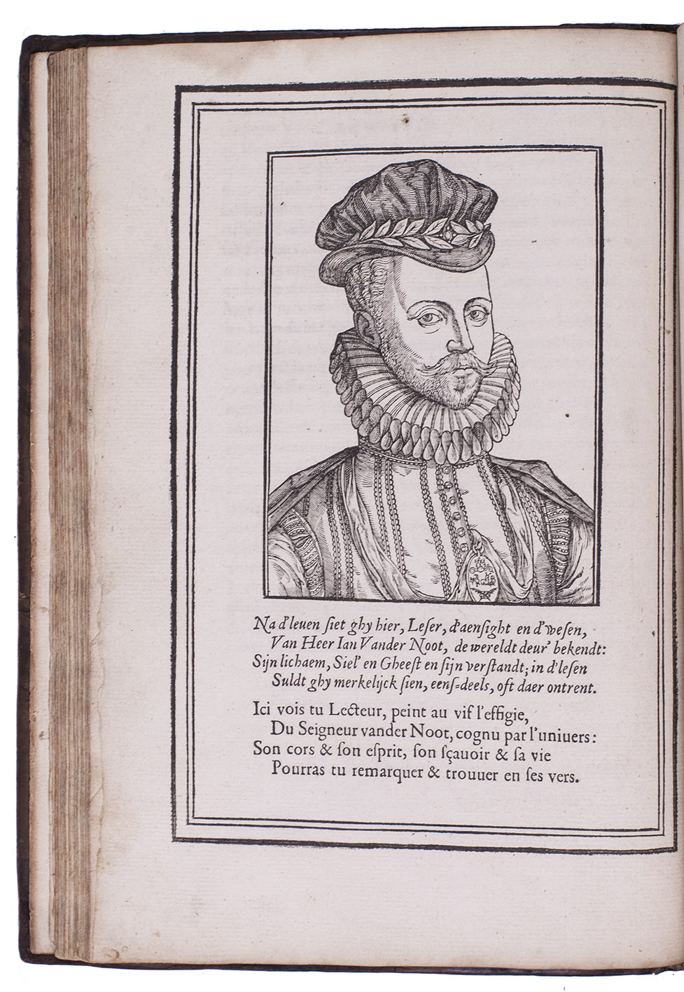 Some occasional minor thumbing, a few spots and a couple small waterstains in the upper margin, otherwise in very good condition. Binding slightly rubbed along the extremities, spine professionally restored, and otherwise good. Belg. Typ. 4625 (ad 1), 4626 (ad 2); 4632 (ad 3); Funck, p. 369 (ad 1); Hollstein (Dutch and Flemish) IV, p. 231, 260-76 (ad 1); Vermeylen, Leven en werken van Jonker Jan van der Noot, pp. 63-72, 87 ff. & bibliography: p. 147, III, A. 1 (ad 1); IV (ad 2); V, B. 22 (ad 3); Werner Waterschoot, ''Rond een convoluut van Jonker Jan van der Noot'', in: E Codicibis Impressisque. Opstellen voor Elly Cockx-Indestege (2004), vol. II, pp. 425-36.