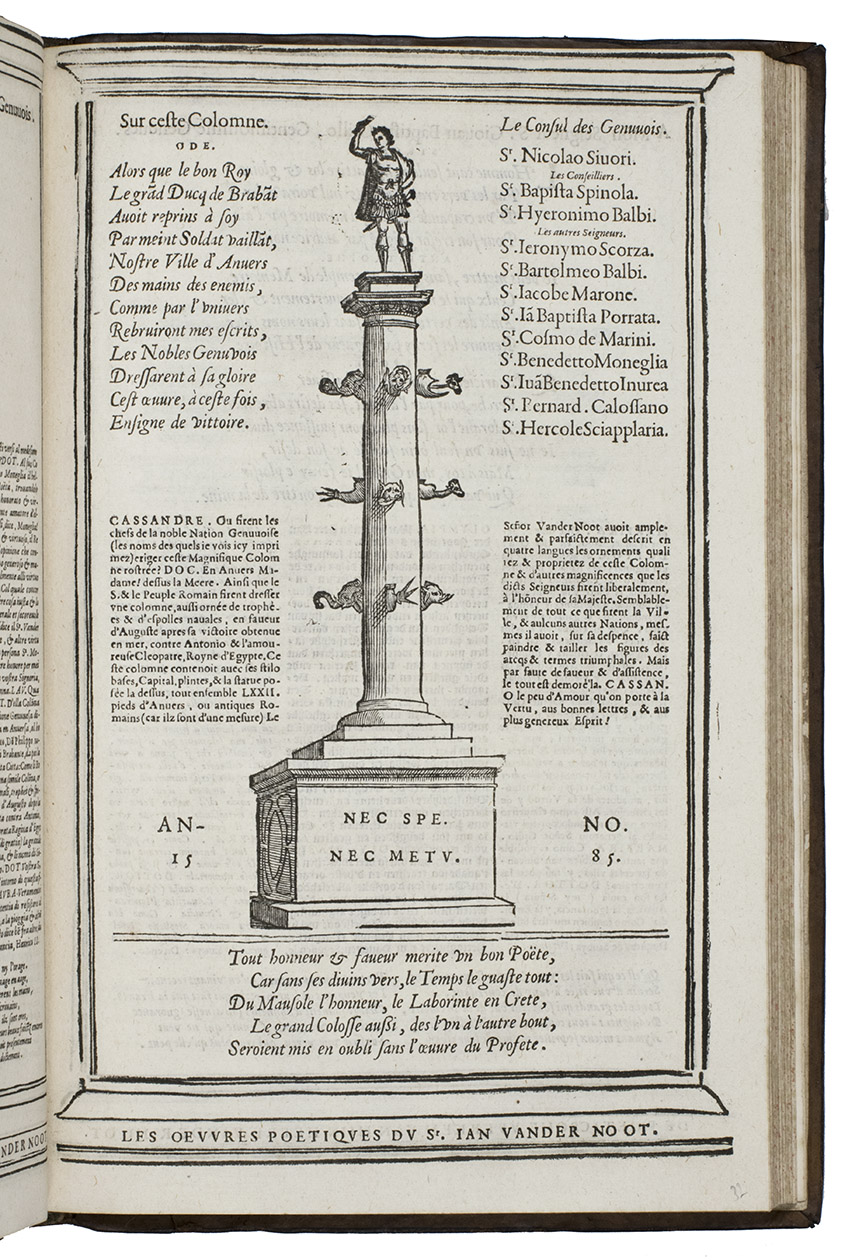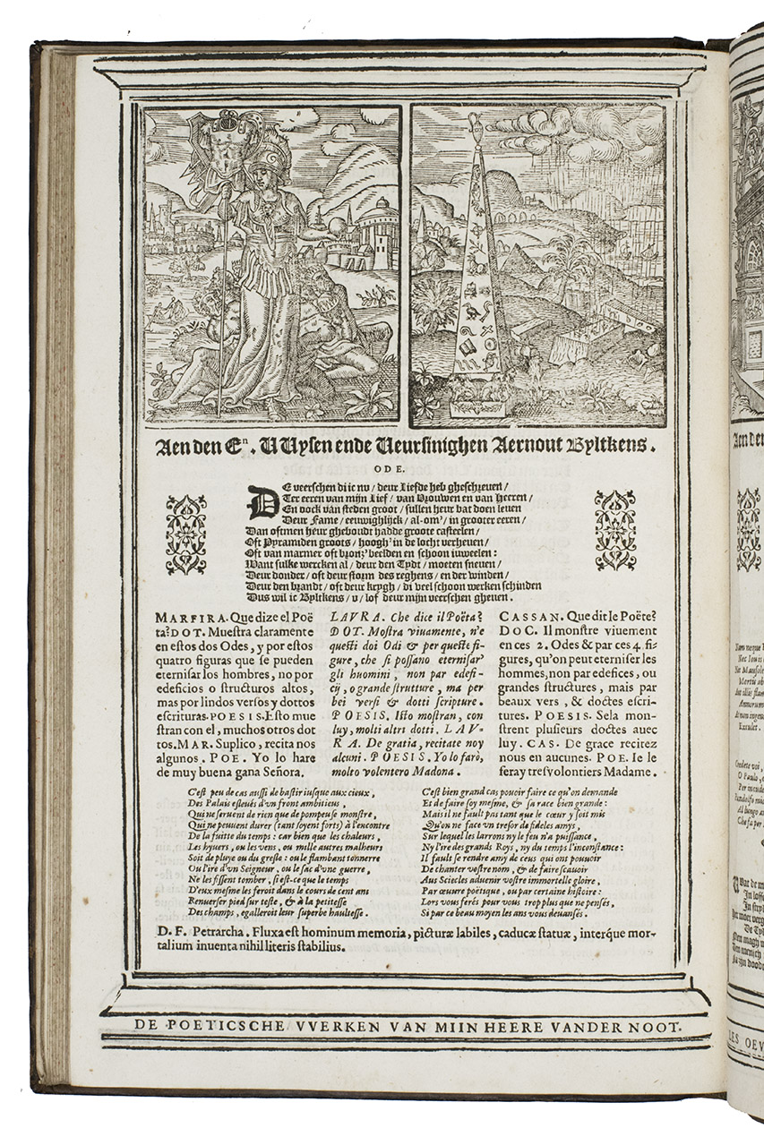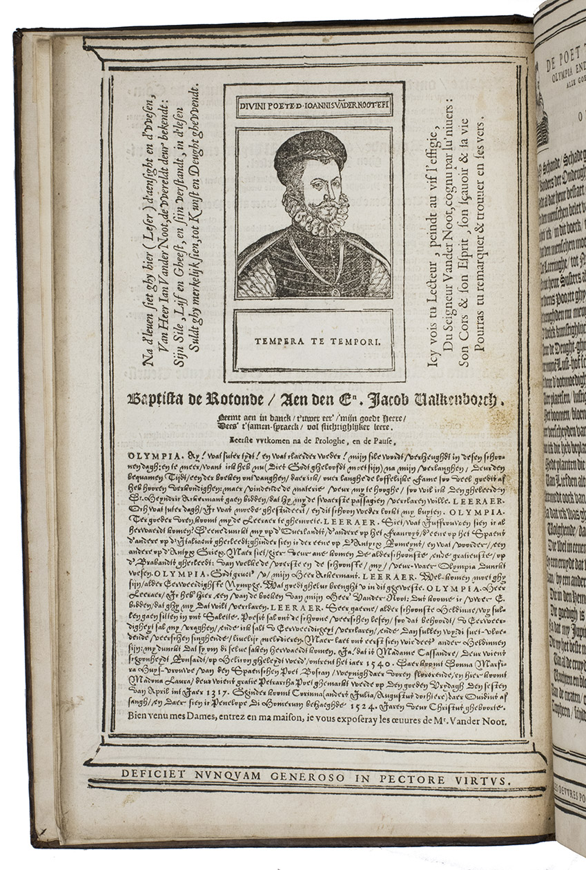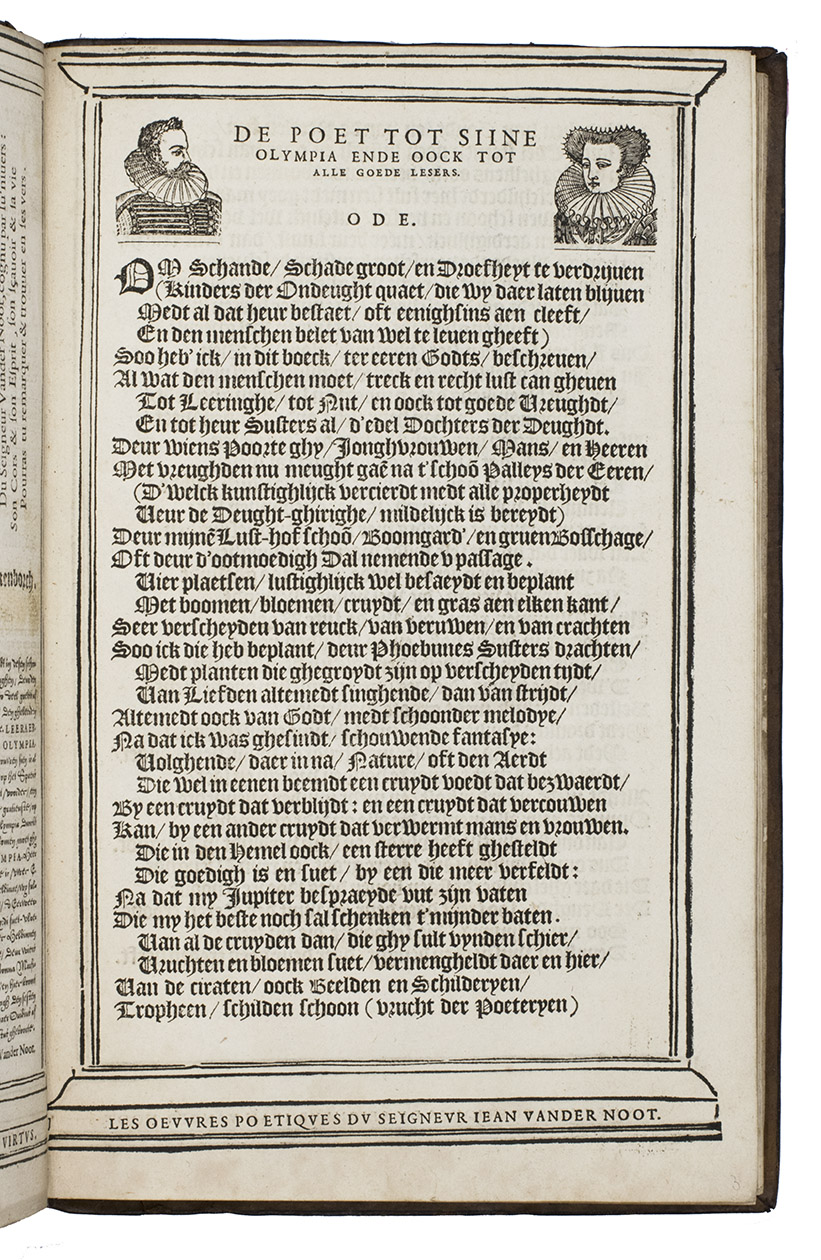 The most complete set known of the extremely rare series of laudatory poems - in Dutch, French, Italian, Spanish, German and Latin - written by the Dutch Renaissance poet Jan Baptista van der Noot (1539-post 1595). Van der Noot had each of his poems in the Poeticsche werken printed as a 4-page folio, so a single bifolium per poem (with one exception that required two bifolia). The author himself assembled these in different collections as circumstance, opportunity and his own interest dictated, issuing them with a preliminary bifolium that included a dated title page and sometimes a second preliminary bifolium. As a result, no two copies are the same. Larger collections, like ours, were most likely compiled for and/or commissioned by very wealthy bibliophiles. They were interested not only in the contents of the poems - which serve primarily to praise them and/or their relatives and prominent acquaintances and at the same time show off the authors stylistic and rhetorical skill - but also in the decorative aspects of the work, which explains the wide variety of highly decorative pages including many woodcut illustrations.