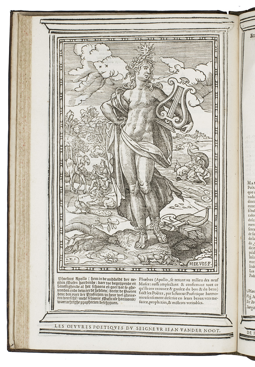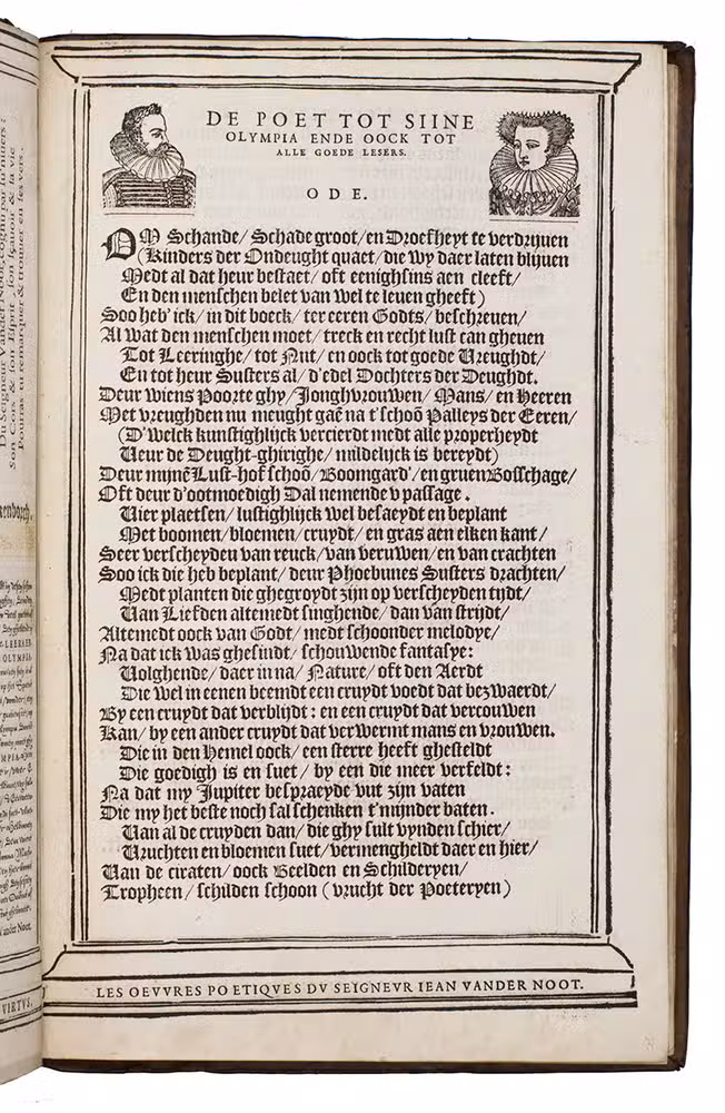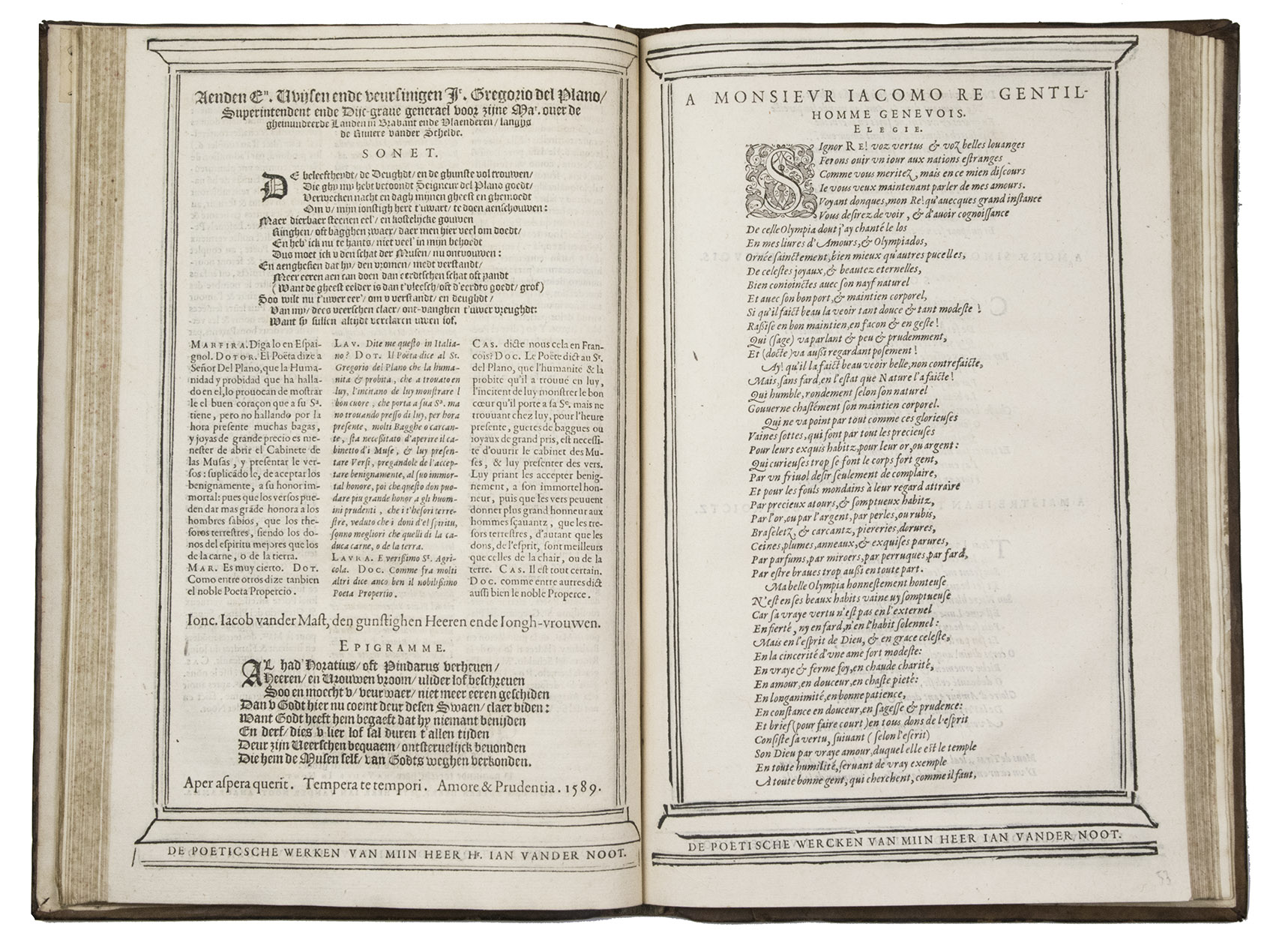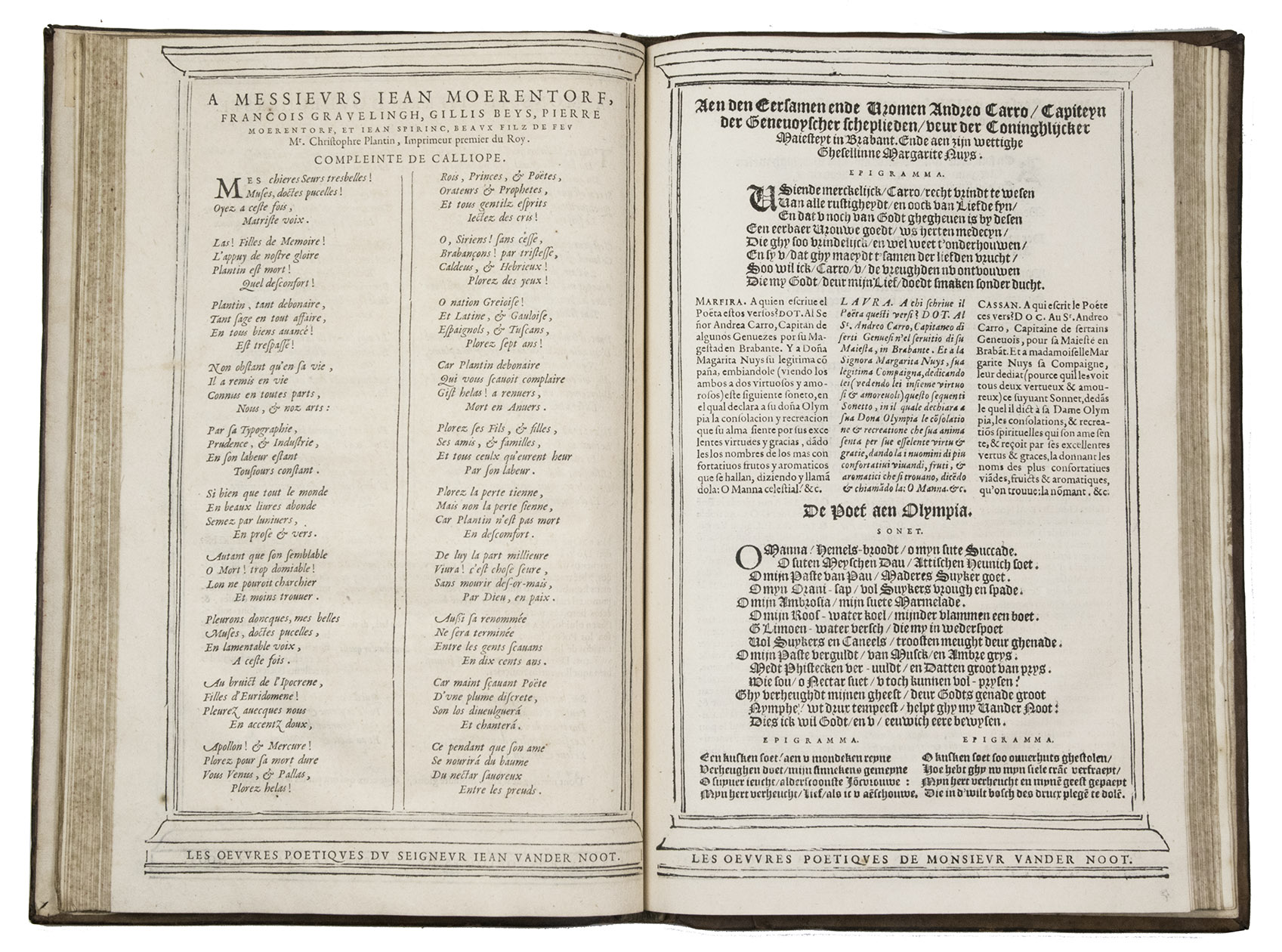 The most complete set known of the extremely rare series of laudatory poems - in Dutch, French, Italian, Spanish, German and Latin - written by the Dutch Renaissance poet Jan Baptista van der Noot (1539-post 1595). Van der Noot had each of his poems in the Poeticsche werken printed as a 4-page folio, so a single bifolium per poem (with one exception that required two bifolia). The author himself assembled these in different collections as circumstance, opportunity and his own interest dictated, issuing them with a preliminary bifolium that included a dated title page and sometimes a second preliminary bifolium. As a result, no two copies are the same. Larger collections, like ours, were most likely compiled for and/or commissioned by very wealthy bibliophiles. They were interested not only in the contents of the poems - which serve primarily to praise them and/or their relatives and prominent acquaintances and at the same time show off the authors stylistic and rhetorical skill - but also in the decorative aspects of the work, which explains the wide variety of highly decorative pages including many woodcut illustrations.