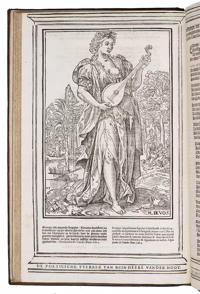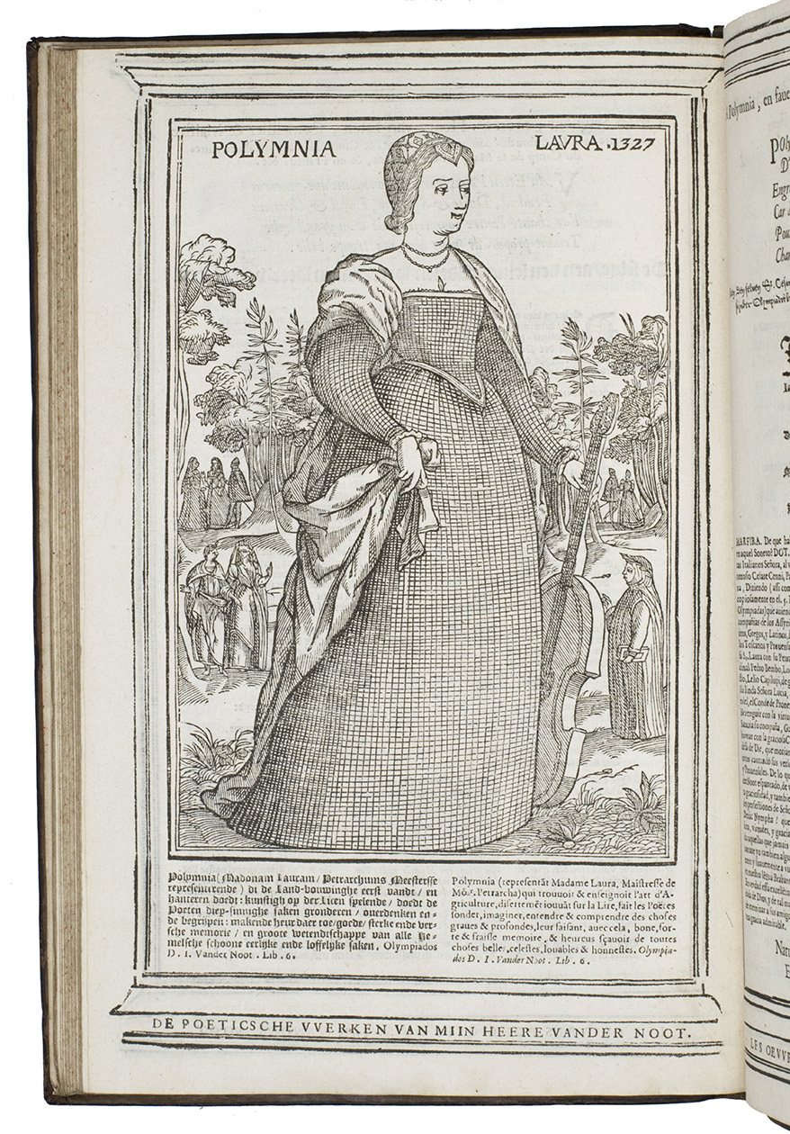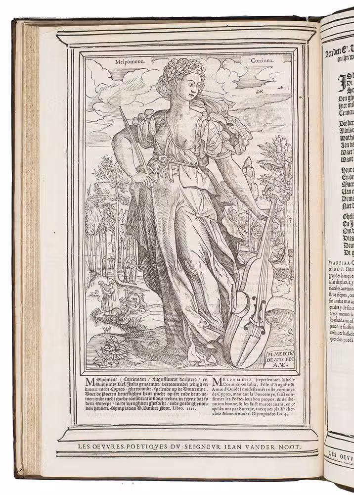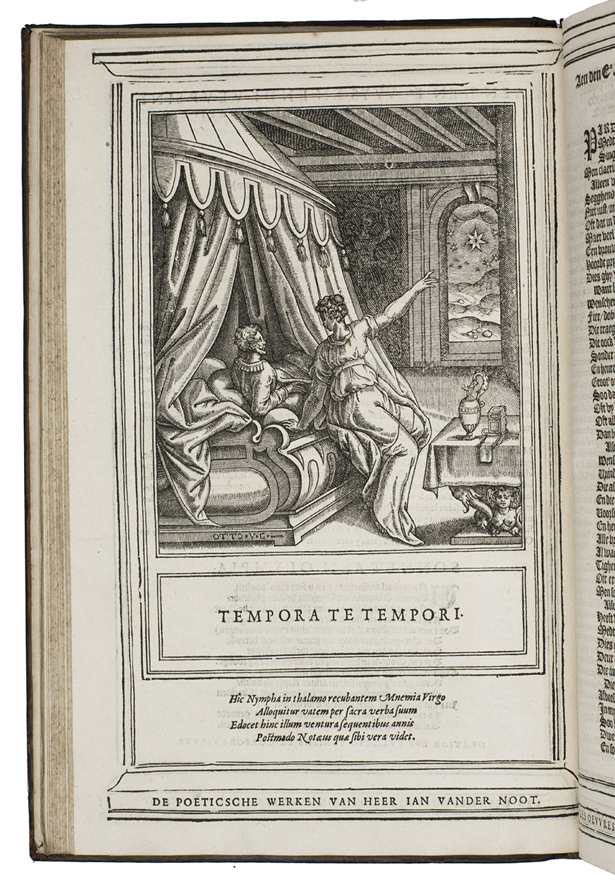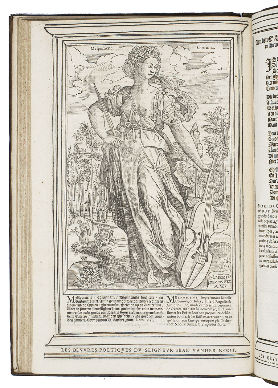 The most complete set known of the extremely rare series of laudatory poems - in Dutch, French, Italian, Spanish, German and Latin - written by the Dutch Renaissance poet Jan Baptista van der Noot (1539-post 1595). Van der Noot had each of his poems in the Poeticsche werken printed as a 4-page folio, so a single bifolium per poem (with one exception that required two bifolia). The author himself assembled these in different collections as circumstance, opportunity and his own interest dictated, issuing them with a preliminary bifolium that included a dated title page and sometimes a second preliminary bifolium. As a result, no two copies are the same. Larger collections, like ours, were most likely compiled for and/or commissioned by very wealthy bibliophiles. They were interested not only in the contents of the poems - which serve primarily to praise them and/or their relatives and prominent acquaintances and at the same time show off the authors stylistic and rhetorical skill - but also in the decorative aspects of the work, which explains the wide variety of highly decorative pages including many woodcut illustrations.