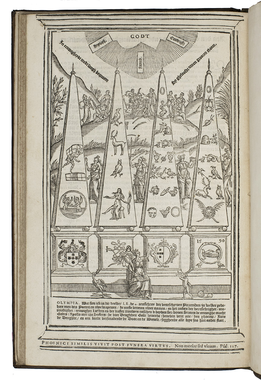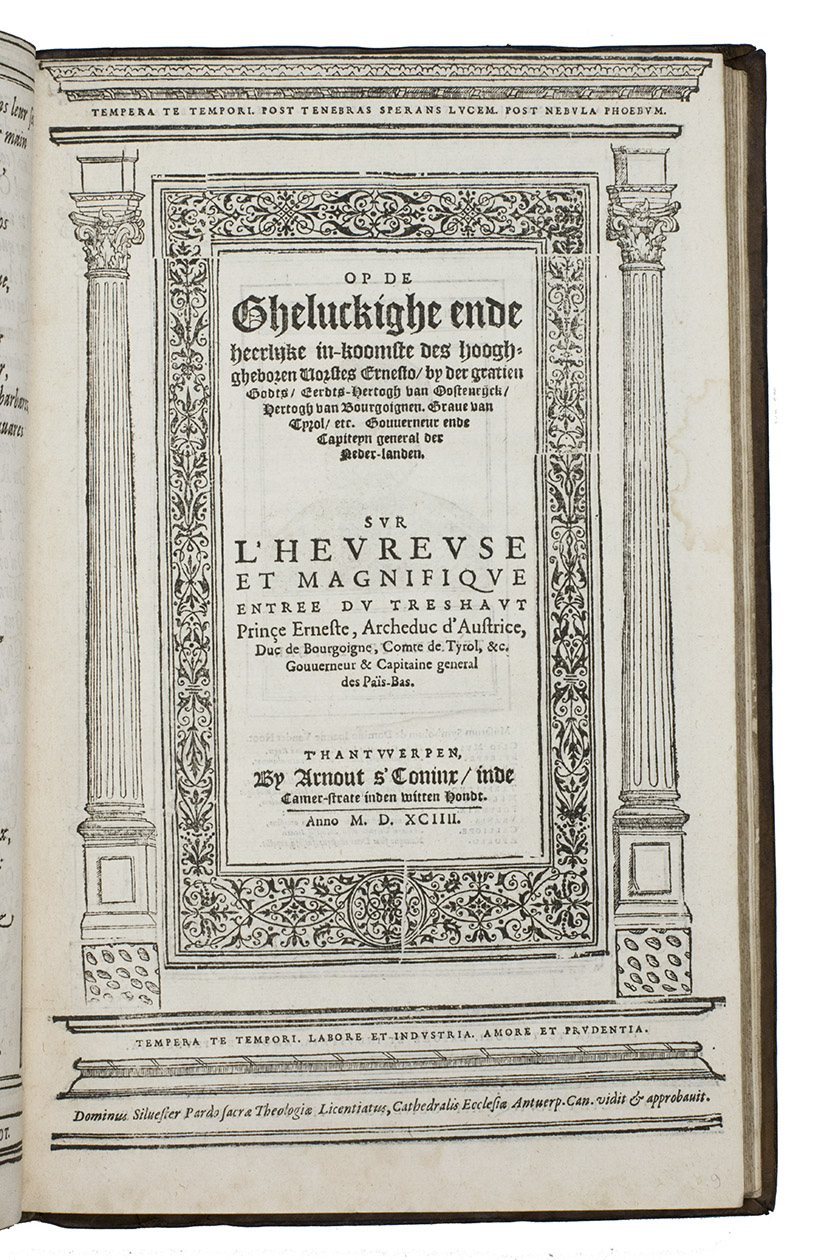 Antwerp, Daniel Vervliet and Arnout Coninx (shared printing), "1594" [=1588-1595]. Folio. With the general title page bearing Vervliets 1594 imprint, the only part-title (for the Inkomste bifolium) bearing sConincxs 1594 imprint, 7 small bust portraits, 2 portraits of the author, 10 small rectangular illustrations, 2 medium illustrations, and 8 full-page illustrations (on integral leaves), all woodcut, some (and the 2 title pages) in architectural and/or arabesque woodcut frames. The text is variously set in 1, 2 or 3 columns, sometimes even mixing them on one page, each page in a frame (made partly from rules) and with the running titles in Dutch and French at the foot of the page. An occasional bifolium includes a woodcut decorated initial. The text, in Dutch, French, Spanish, Italian, German, Latin, and Greek, is set in dozens of roman, italic, textura, civilité, fraktur and Greek printing types plus interlaced typographic capitals and arabesque typographic ornaments. Blind-tooled calf (ca. 1725/30?) by the so-called "Minnewit" bindery in Amsterdam. [102] ll.