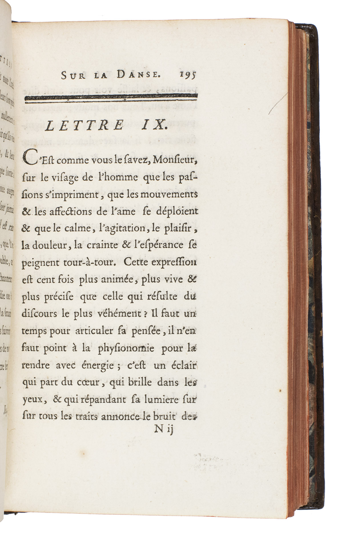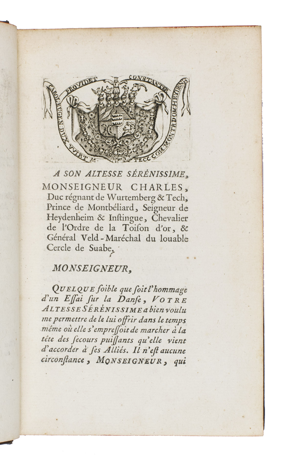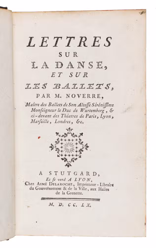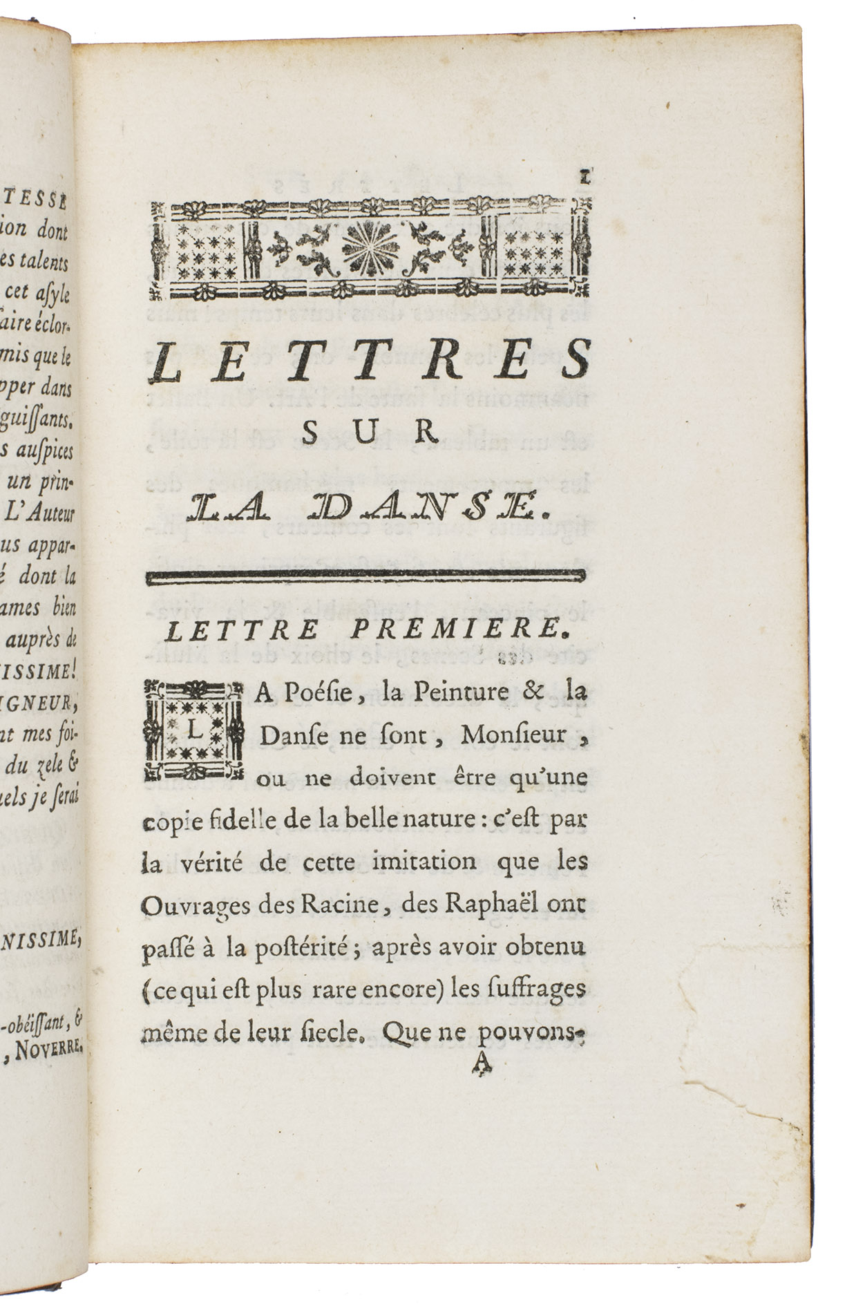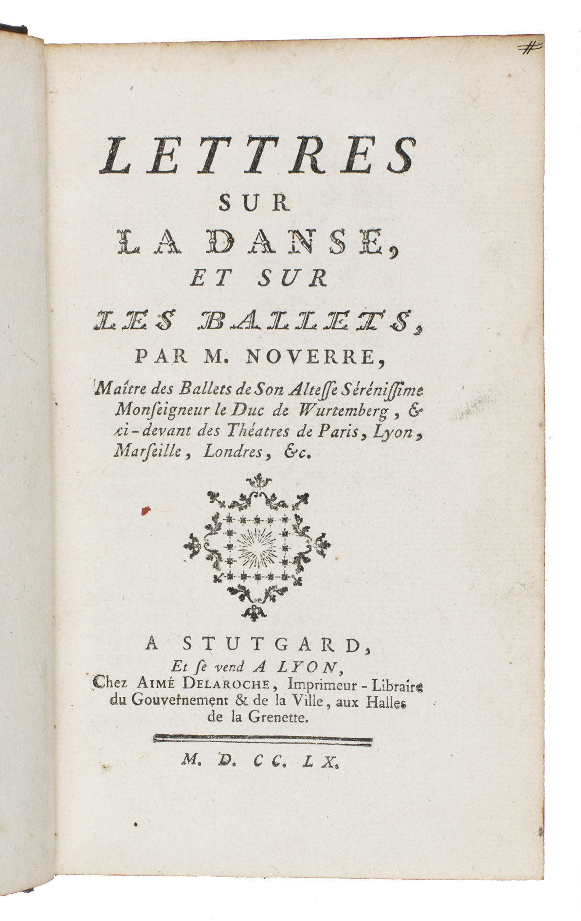 First edition of the letters on dancing and ballet by Jean Georges Noverre (1727-1810), a famous dancing master, called in praise "the Shakespeare of the Dance". On the title of the present work he introduced himself as: "Ballet master of the Duke of Wurtemberg and before that ballet master of theatres in Paris, Lyon, Marseille, London, etc." The book is written in the form of letters, in which the author exposes his ideas on dancing, ballet, mime, choreography, etc. The book is dedicated to the Duke of Wurtemberg.