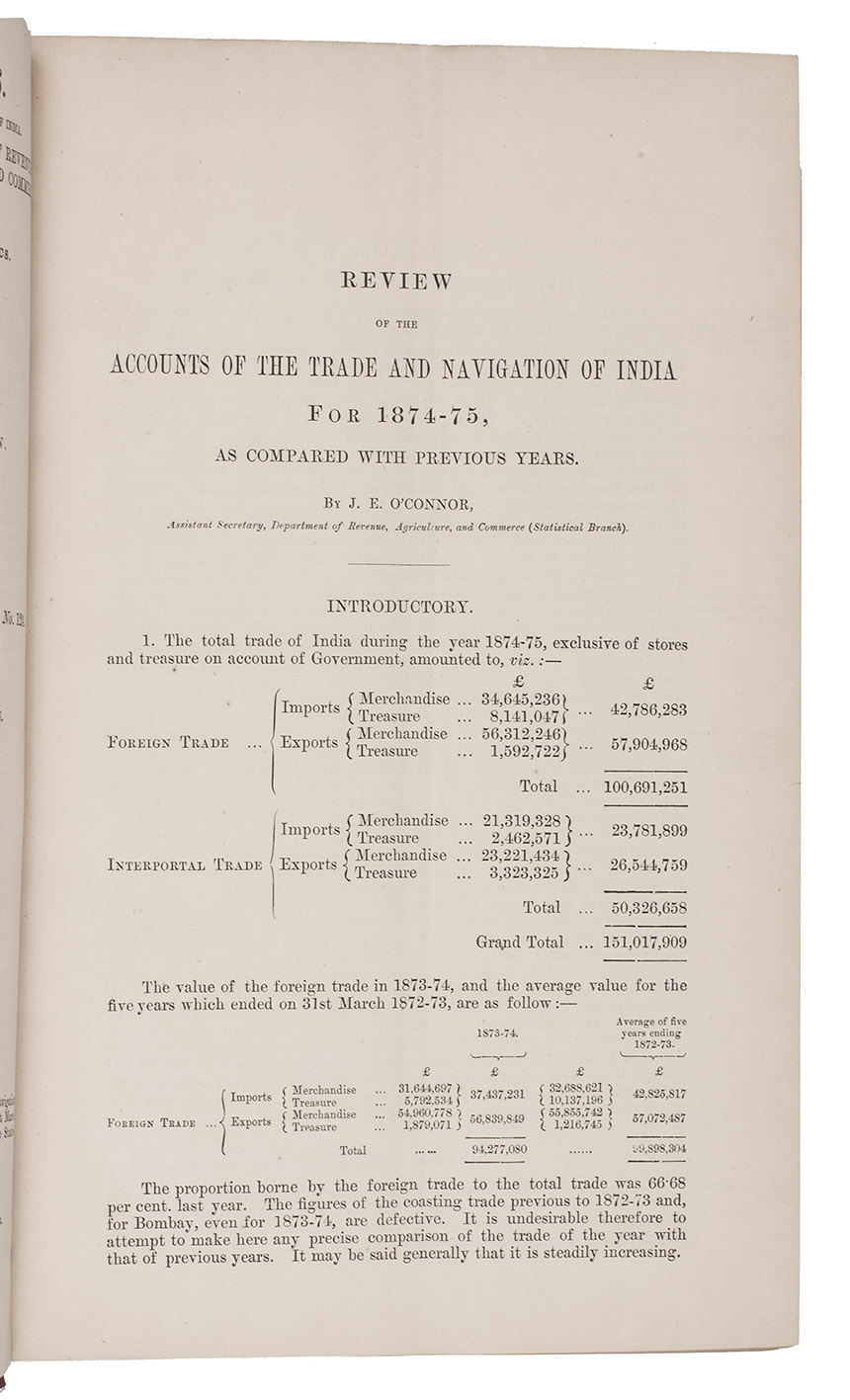 First editions of the official yearly accounts of the trade between British India and other countries, all compiled by the British administrator James Edward O'Conor (d. 1917). Included are the reviews of the years from 1874 to 1884, only lacking the official year 1877-1878. Listed are the amount of trade with foreign countries (including Aden, Turkey and countries surrounding the Persian Gulf and the Red Sea), government transactions, customs revenues, foreign import and export products, listing numerous products and materials together with the amount that has been imported or exported and the costs. "The two most important items from Arabia are dates and pearls. ... Gums, fishmaws and sharkfins, and salt are the most prominent of the other articles imported" (ad 9, p.24). The section on export is divided between foreign products and products of Indian manufacture that are being exported from India. Also included is a brief section on provincial trade.
