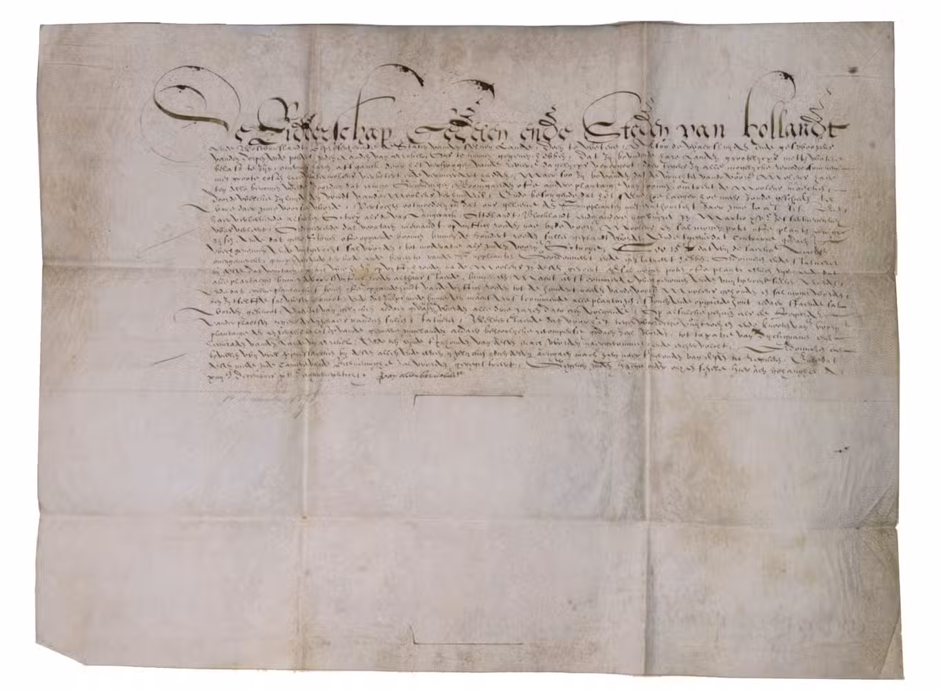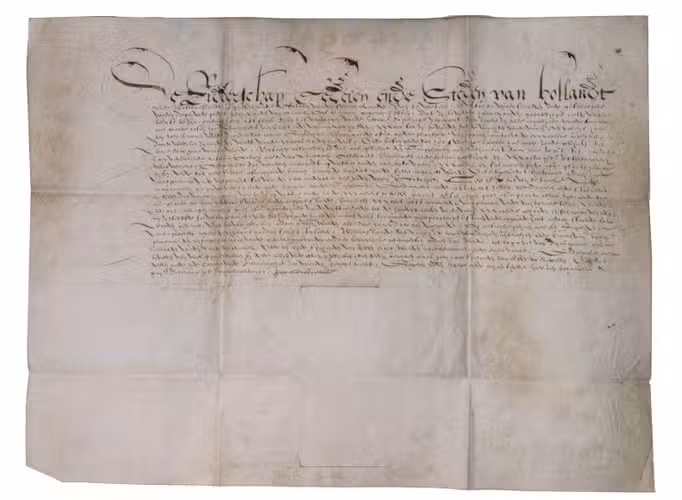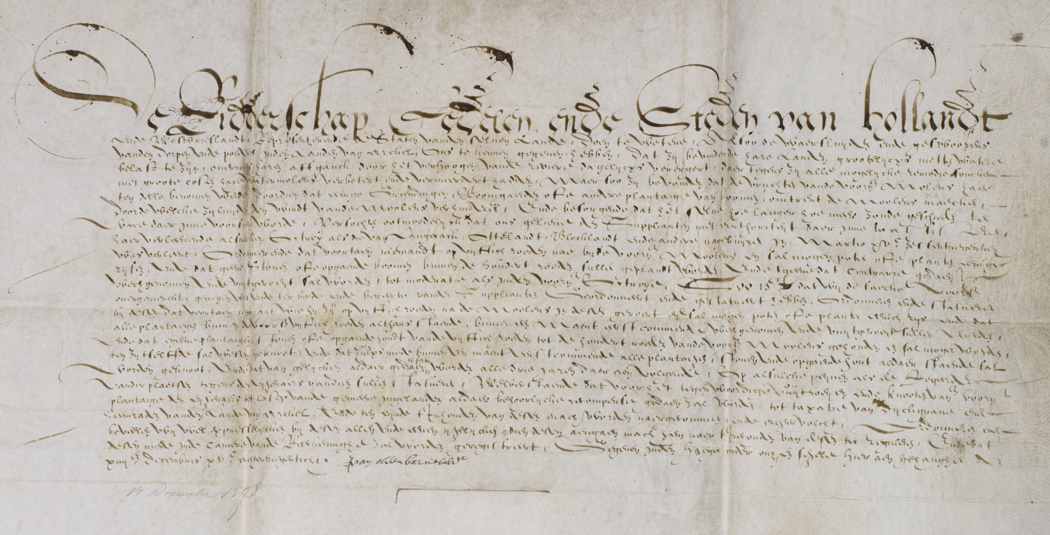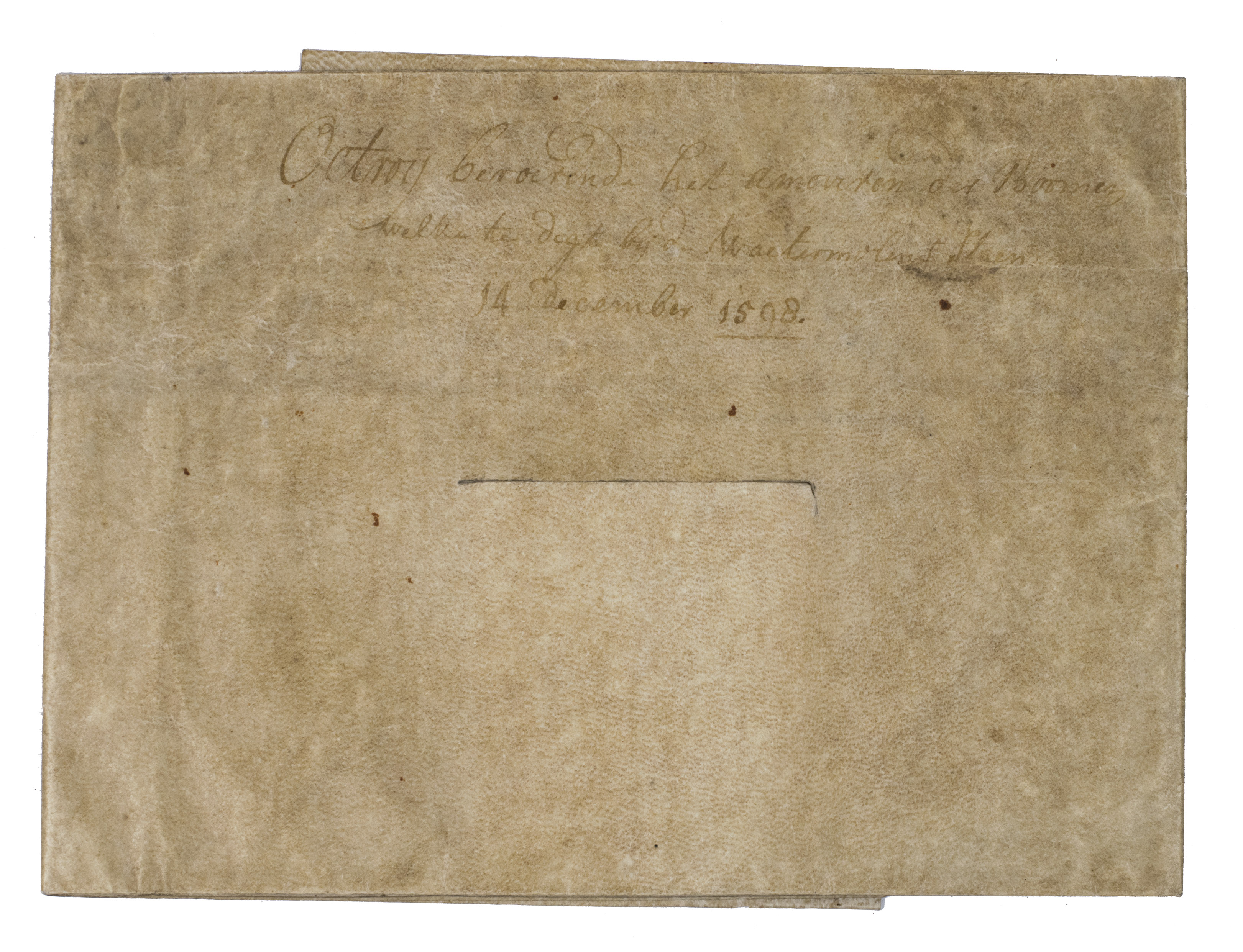 The Hague, 14 December 1598. Manuscript document in Dutch in brown ink on the skin side of a single piece of sheepskin parchment (36 x 48 cm, folded to 14 x 19 cm).