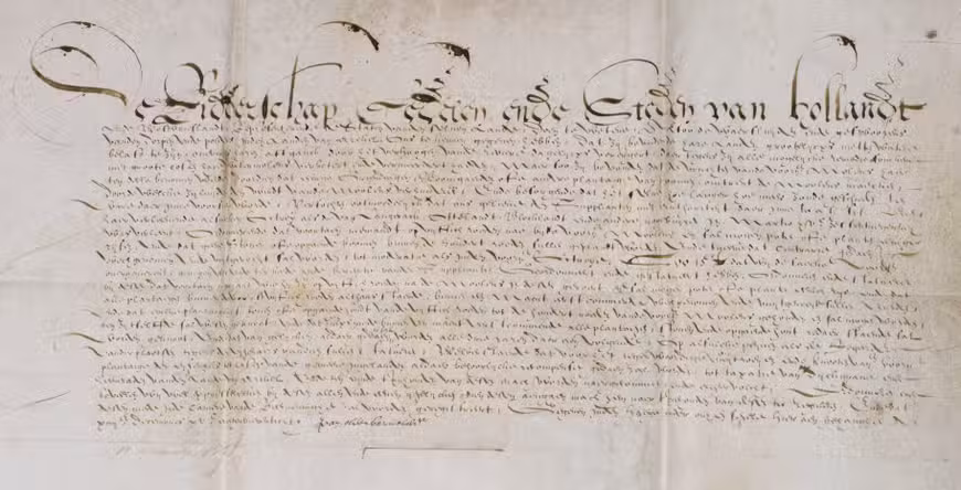 Original official ordinance by the knighthood, noblemen and cities of the province of Holland representing the States of Holland (signed by the great statesman Johan van Oldenbarnevelt), giving a detailed picture of the careful balance that had to be struck between individual rights and general good in maintaining the reclaimed Dutch polder lands in the 16th century, in this case concerning water control in the Land van Arkel, a region around the towns of Arkel and Gorinchem and some villages and polder lands to their north and east. The officials had already taken all measures they could independently, improving the existing windmills and building new ones to pump the rising water up into the rivers, but the windmills were unable to perform optimally because willows, orchards and other planted trees on private properties around the windmills were interfering with the wind. The request was granted by the present ordinance. It gave them the authority to forbid further planting within 50 roeden (about 200 metres) of a windmill and to demand the removal of trees already planted within that distance.