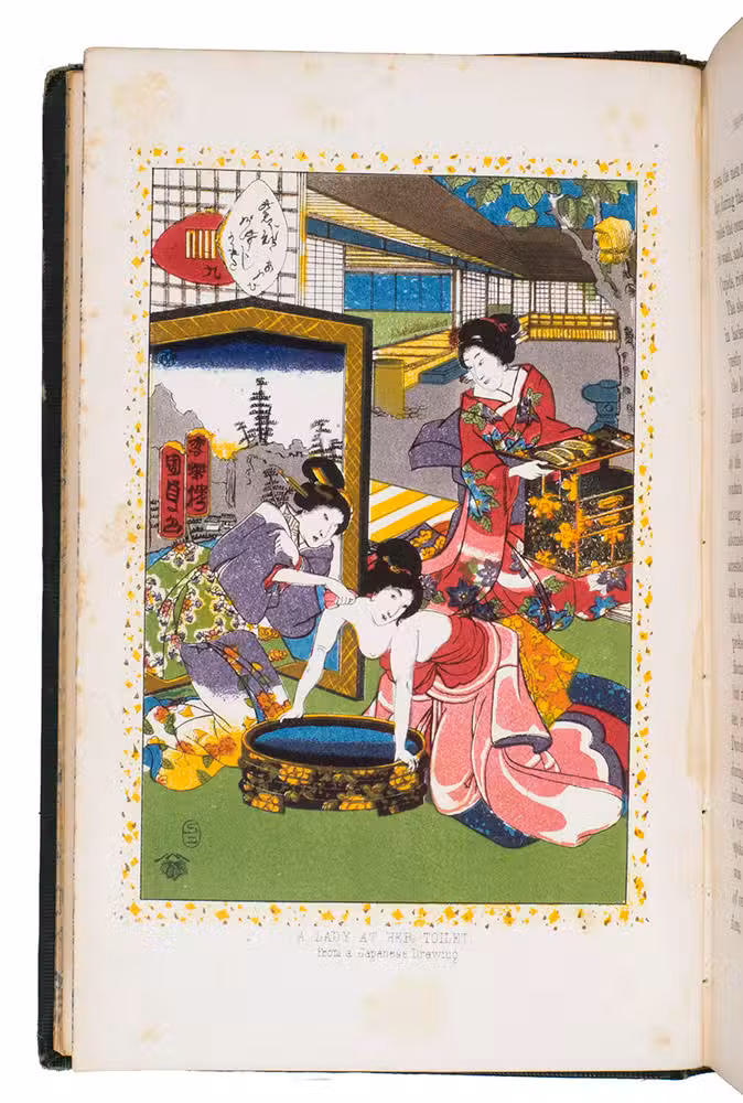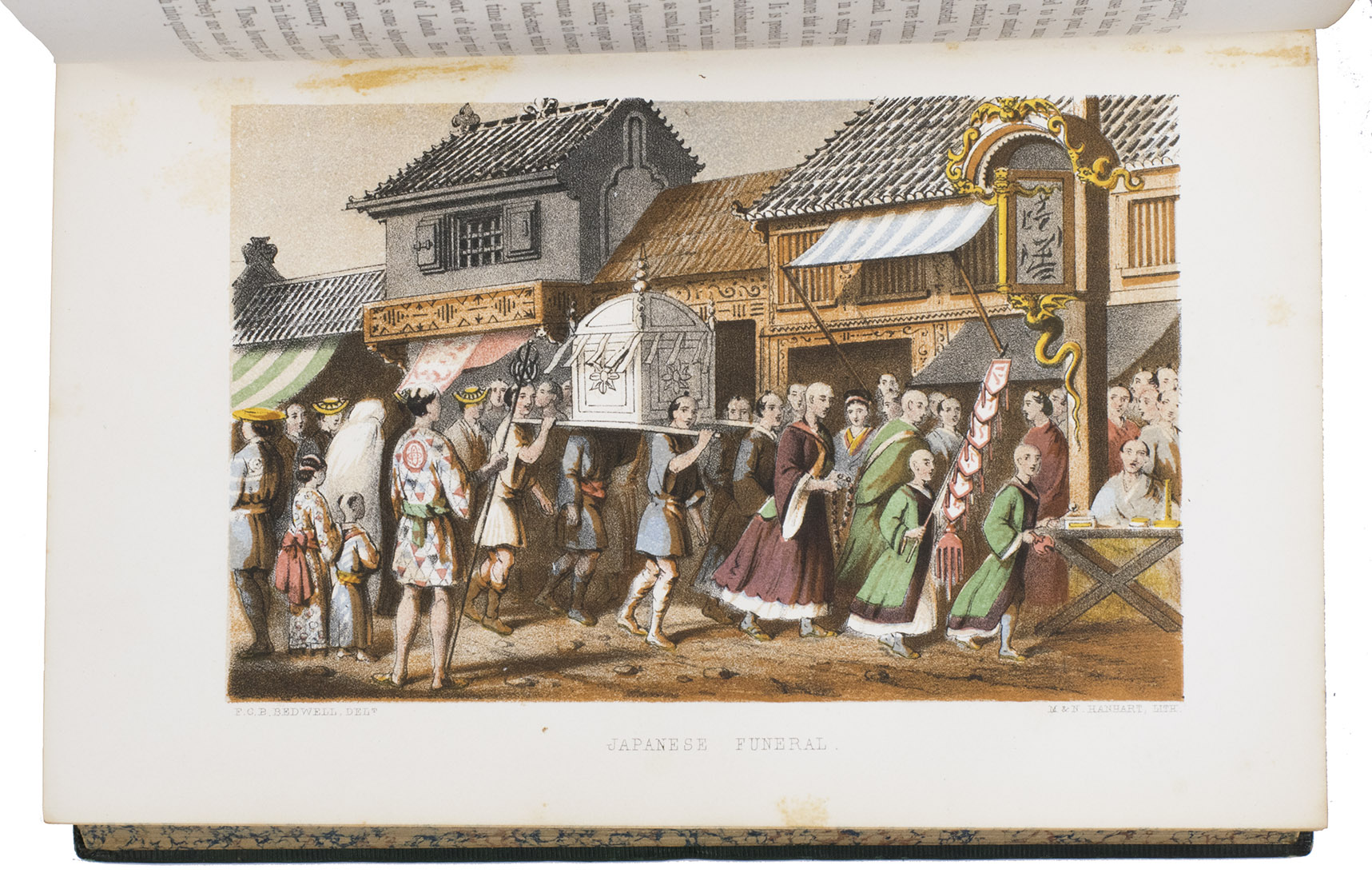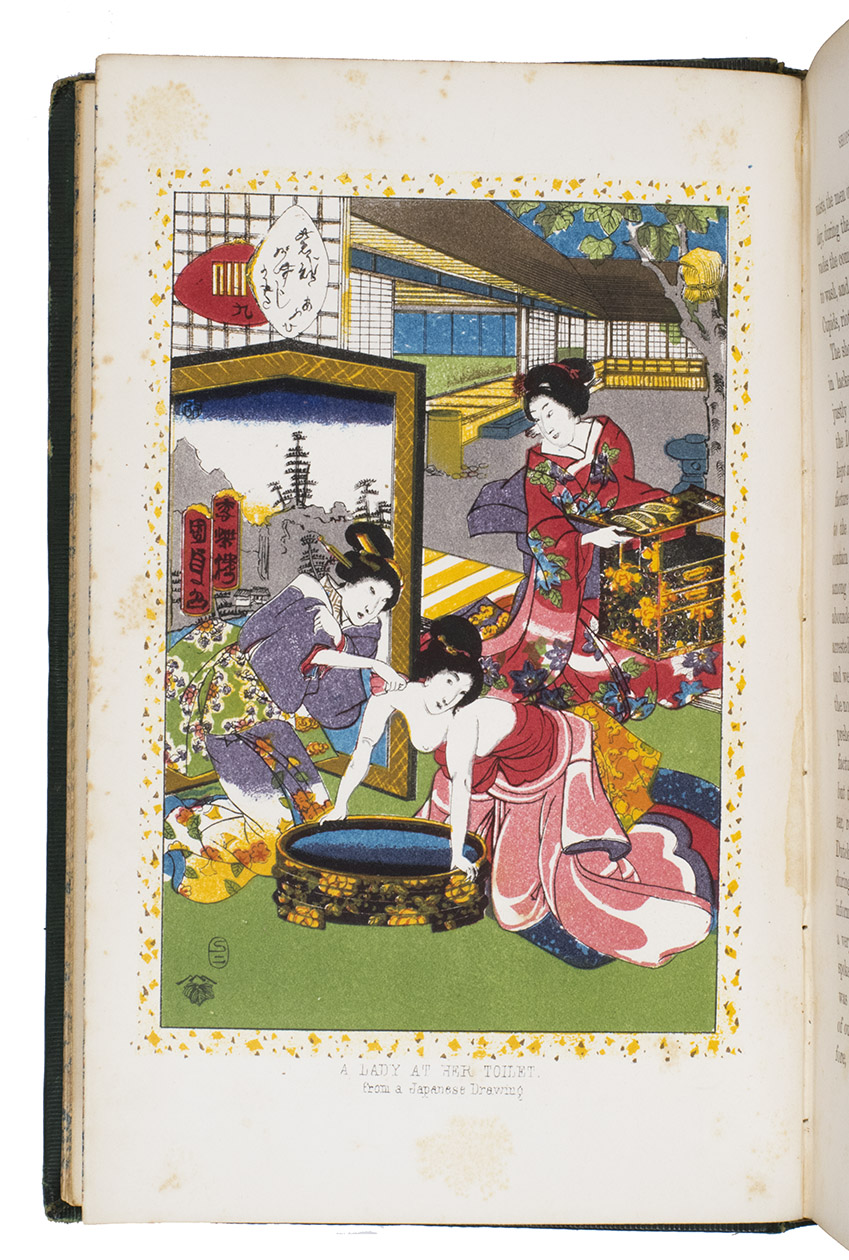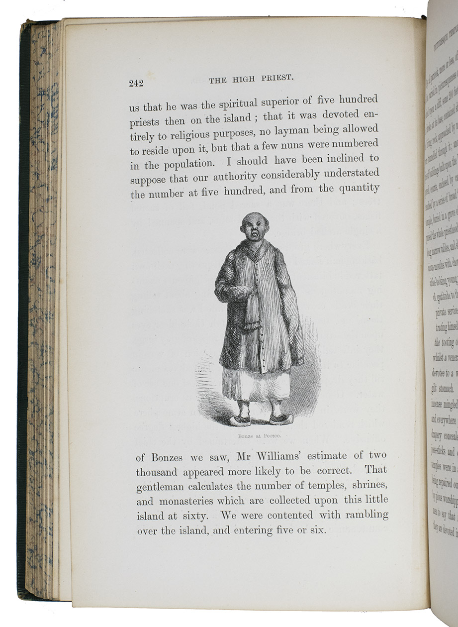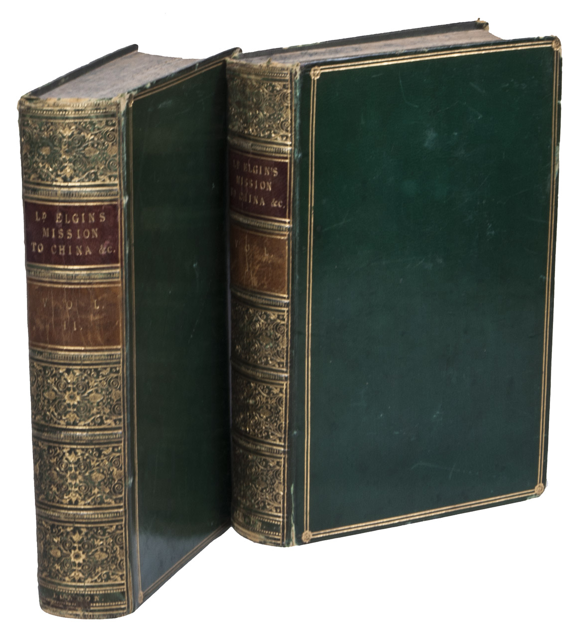 With an owner's stamp "Joseph O. Buch" at the back of the first flyleaf in both volumes. Minor foxing in the plates and a tear in the frontispiece of vol. 1 repaired with tape. Binding chafed at the extremities, hinges with some cracks and tops of the spines damaged. Otherwise in good condition. A beautifully bound edition of a highly entertaining travelogue. Cordier, Sinica, col. 2376; Wang, Chopsticks, pp. 150-151.