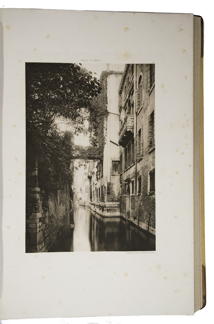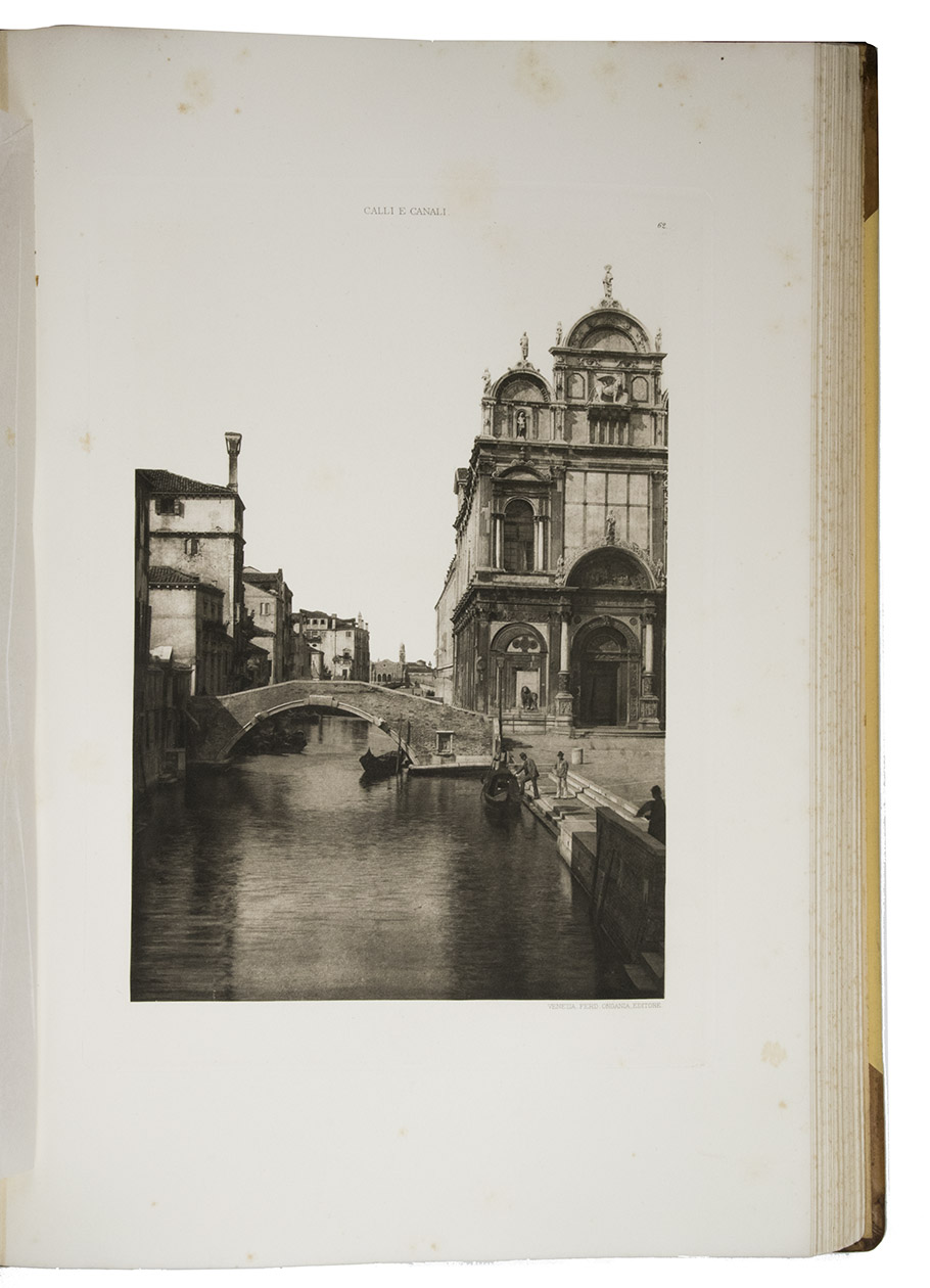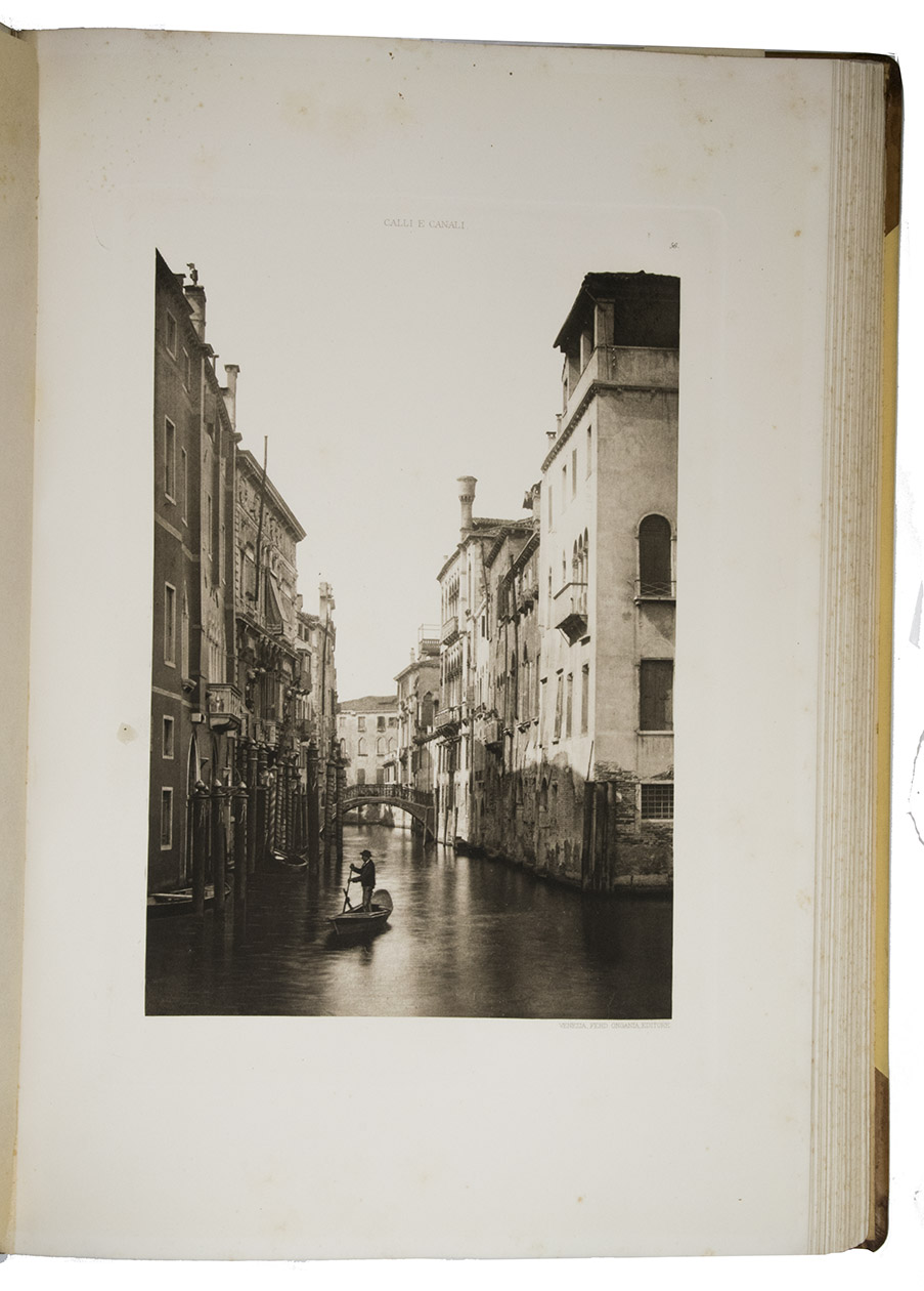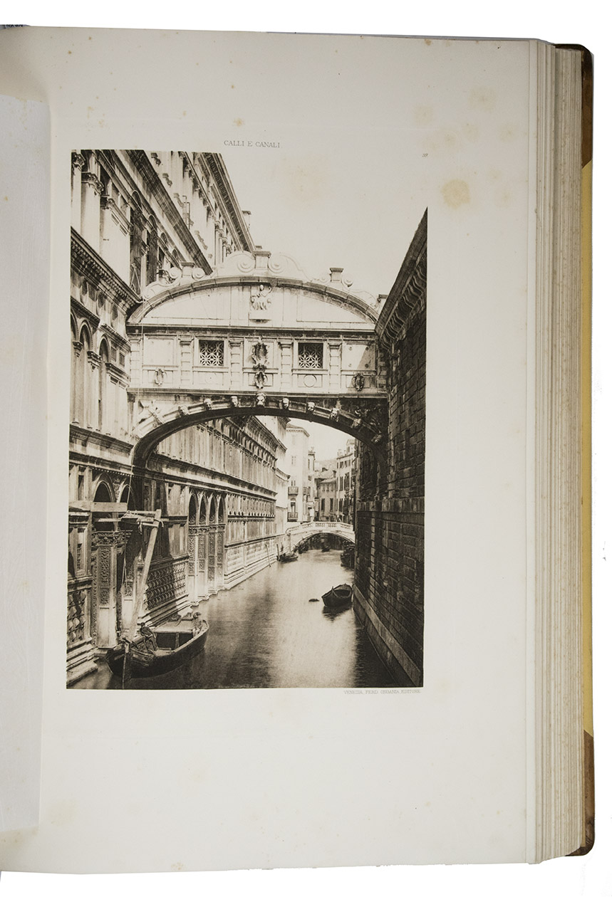 Venice, Tipografia Emiliana, 1894-1895. Imperial folio (ca. 55 x 37 cm). With a lithographed frontispiece showing a gondola in a Venice canal and 100 colletypes of the Venice canals, streets and buildings, mounted on guards and covered with flyleaves, index printed in red and black. Original publishers half brown sheepskin, beige cloth sides with blind-tooled frame on the front and back board and with a centrepiece with a boat in the lagoon of Venice and the gold-stamped title and author's name on the front board. [6] including the frontispiece, plus 100 collotypes.