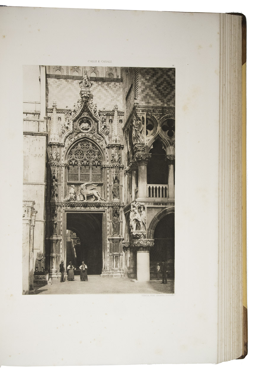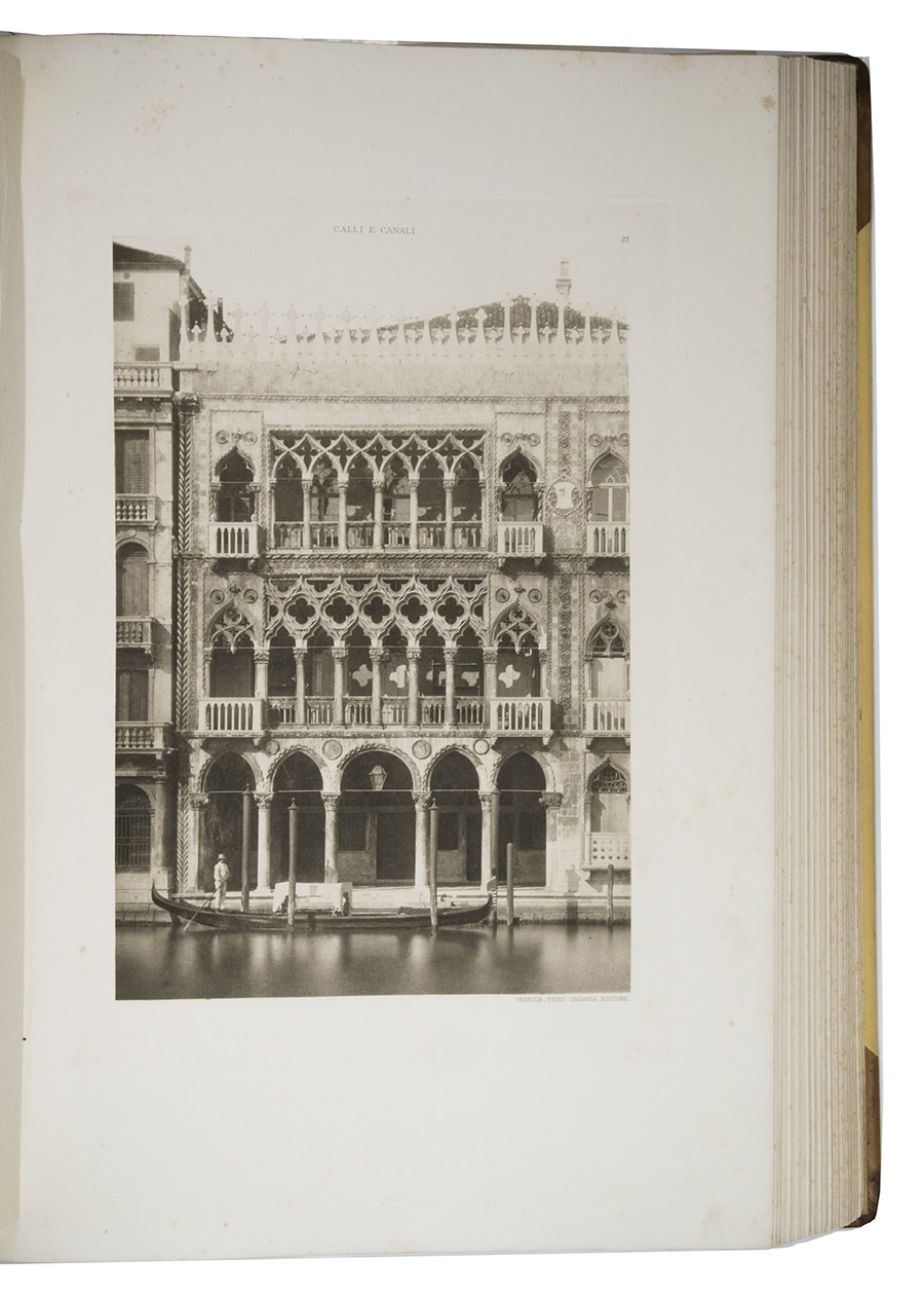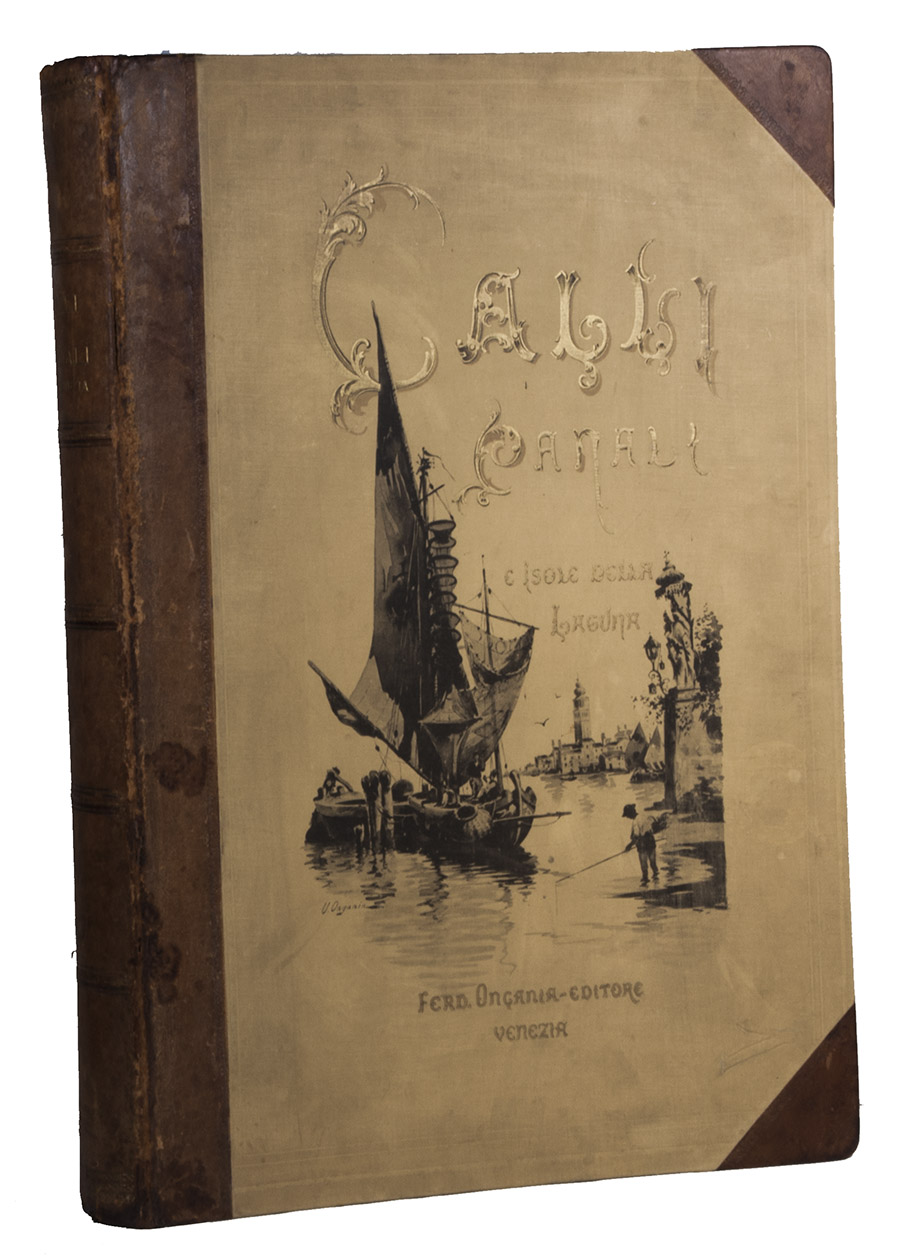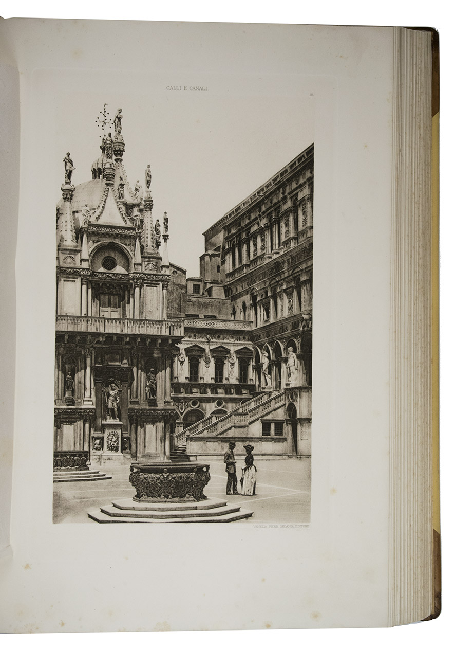 Venice, Tipografia Emiliana, 1894-1895. Imperial folio (ca. 55 x 37 cm). With a lithographed frontispiece showing a gondola in a Venice canal and 100 colletypes of the Venice canals, streets and buildings, mounted on guards and covered with flyleaves, index printed in red and black. Original publishers half brown sheepskin, beige cloth sides with blind-tooled frame on the front and back board and with a centrepiece with a boat in the lagoon of Venice and the gold-stamped title and author's name on the front board. [6] including the frontispiece, plus 100 collotypes.