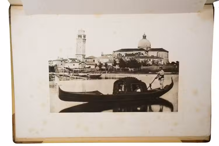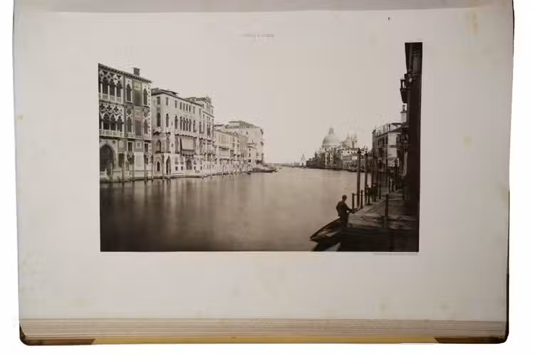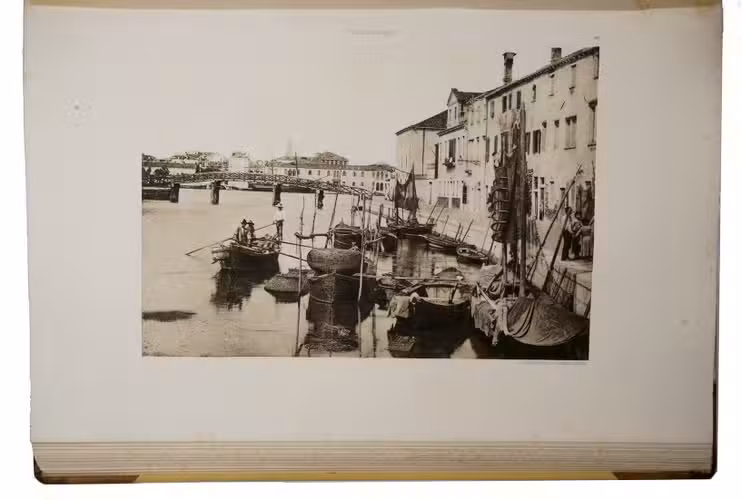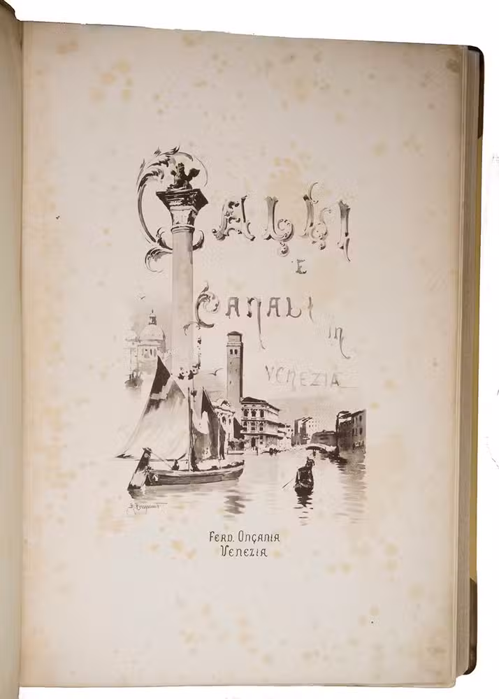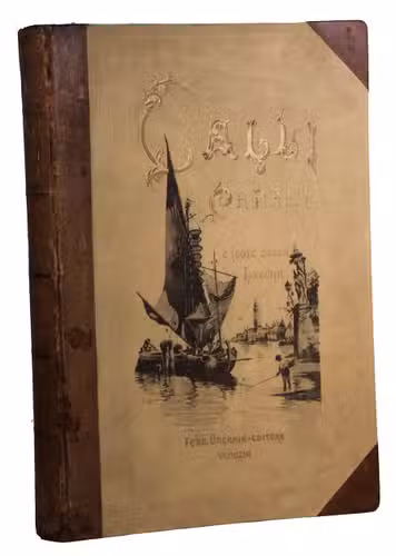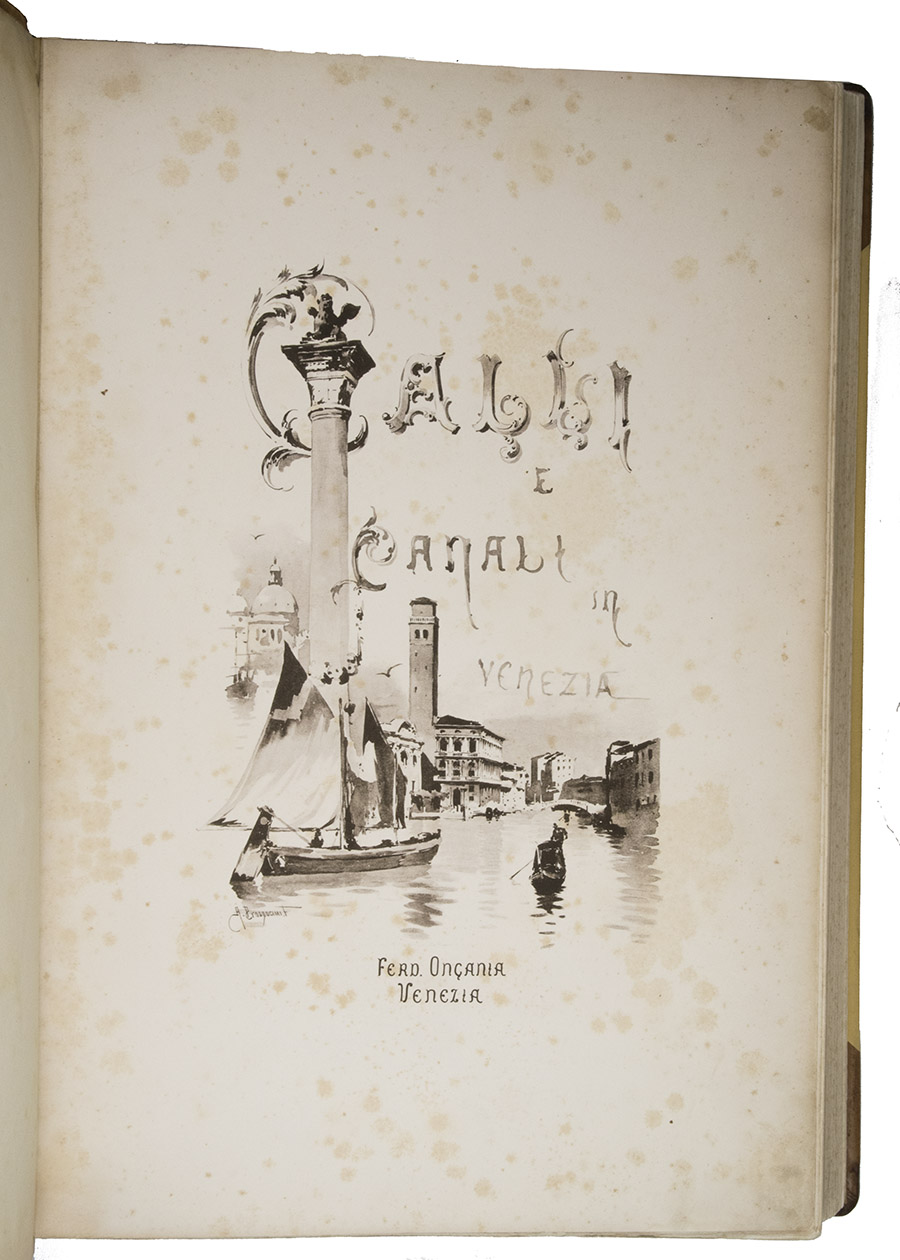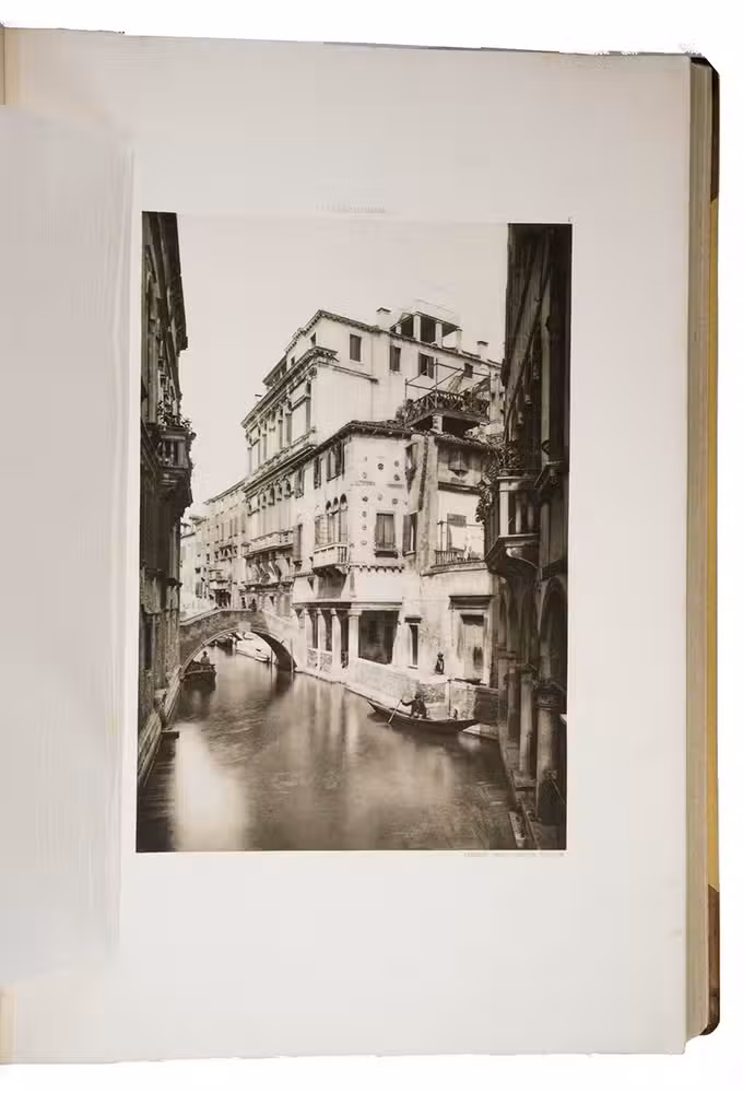 Venice, Tipografia Emiliana, 1894-1895. Imperial folio (ca. 55 x 37 cm). With a lithographed frontispiece showing a gondola in a Venice canal and 100 colletypes of the Venice canals, streets and buildings, mounted on guards and covered with flyleaves, index printed in red and black. Original publishers half brown sheepskin, beige cloth sides with blind-tooled frame on the front and back board and with a centrepiece with a boat in the lagoon of Venice and the gold-stamped title and author's name on the front board. [6] including the frontispiece, plus 100 collotypes.