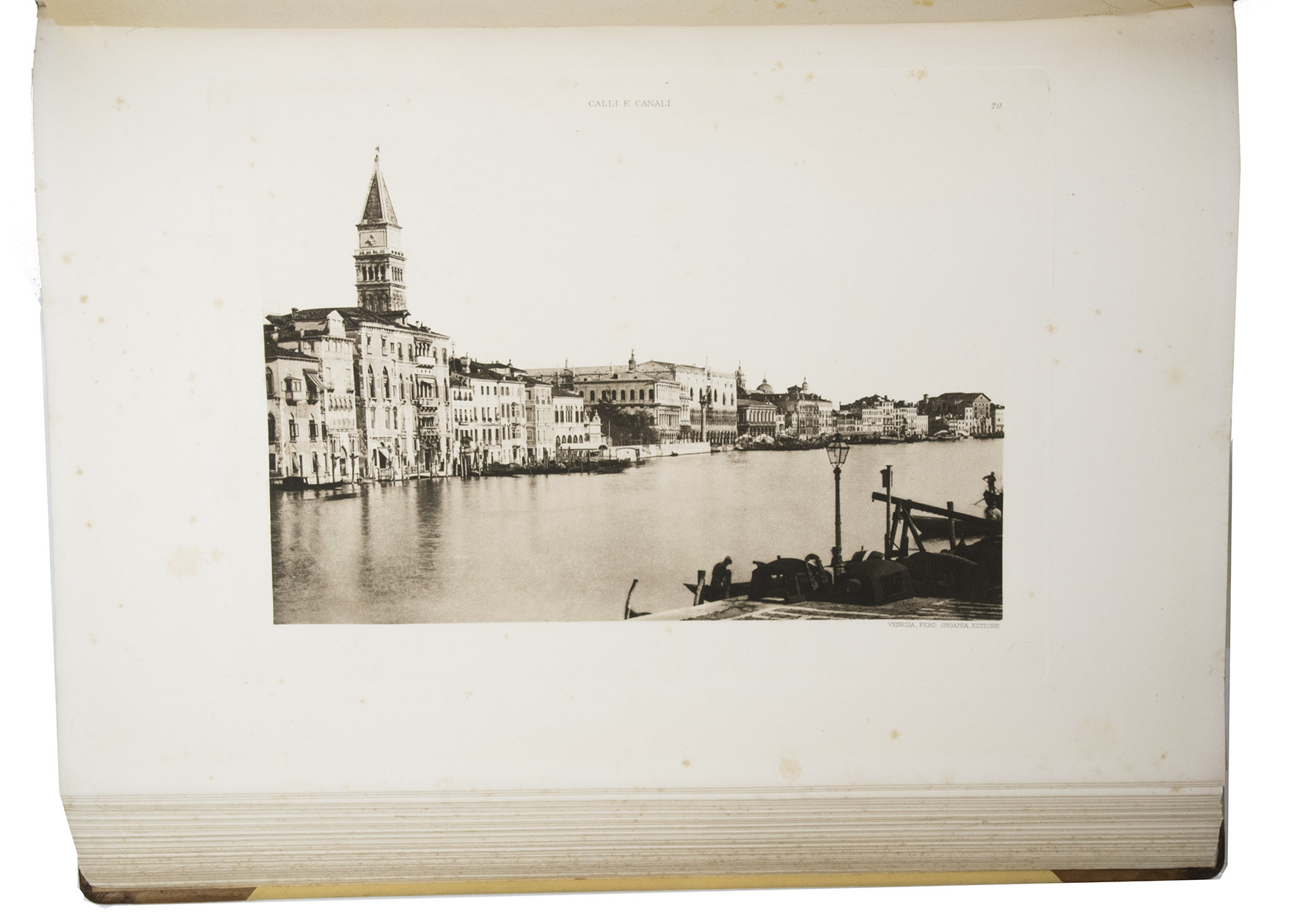 1895 edition of the first volume of Ongania's collection of collotype views of Venice in an impressive imperial folio format and in the original publisher's binding. Its Venetian publisher and bookseller Ferdinando Ongania (1842-1911) was especially known for using the latest photographic techniques and the clarity of the collotypes in his publications. This series of views shows the canals, waterways and the lagoon of Venice, but also remarkable places such as the Piazza San Marco, the Palazzo Ducale, the Ponte dei Sospiri and the Canal Grande. But Ongania didn't show only the citys majestic sights, boats and gondolas: he also shows the ordinariness and serenity of 19th-century Venice, sharply contrasting the tourist attraction Venice has become today.