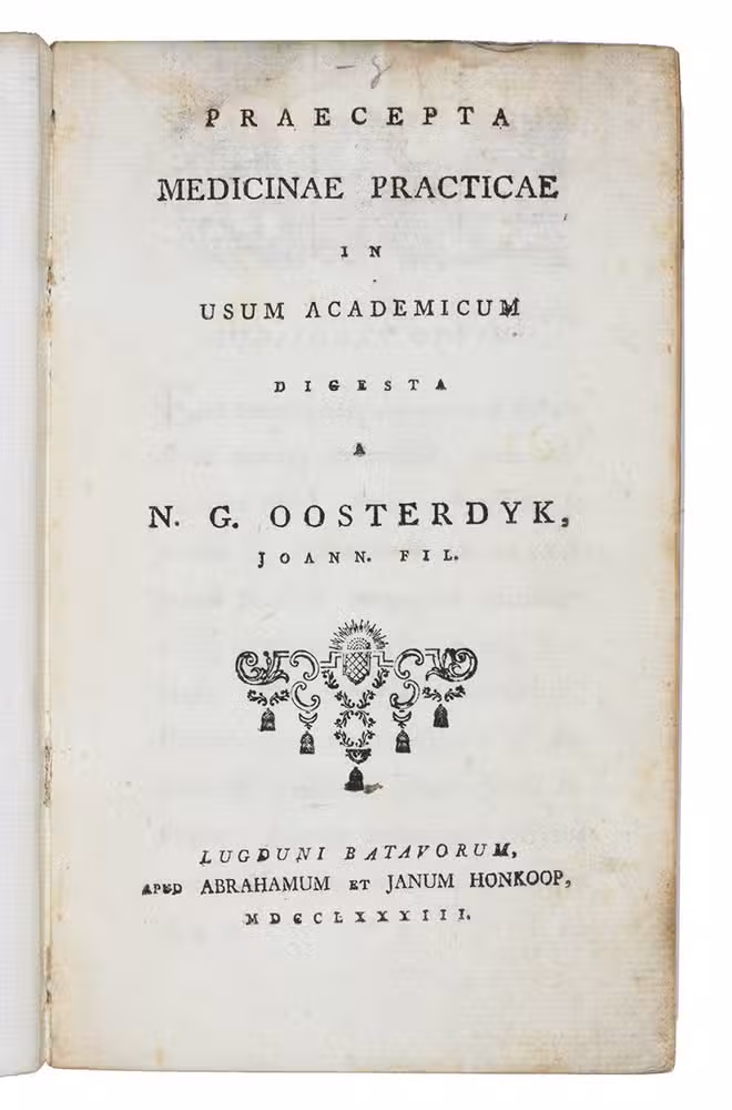 First edition of a work on clinical medicine and various diseases, including womens and childrens diseases, by the professor of medicine at Leiden University, Nicolaas George Oosterdijk (1740-1817), the son of the Utrecht prof. of medicine Johan Oosterdijk Schacht (1704-1792) and grandson of the Leiden prof. of medicine and colleague of Boerhaave, Herman Oosterdijk Schacht (1672-1744).