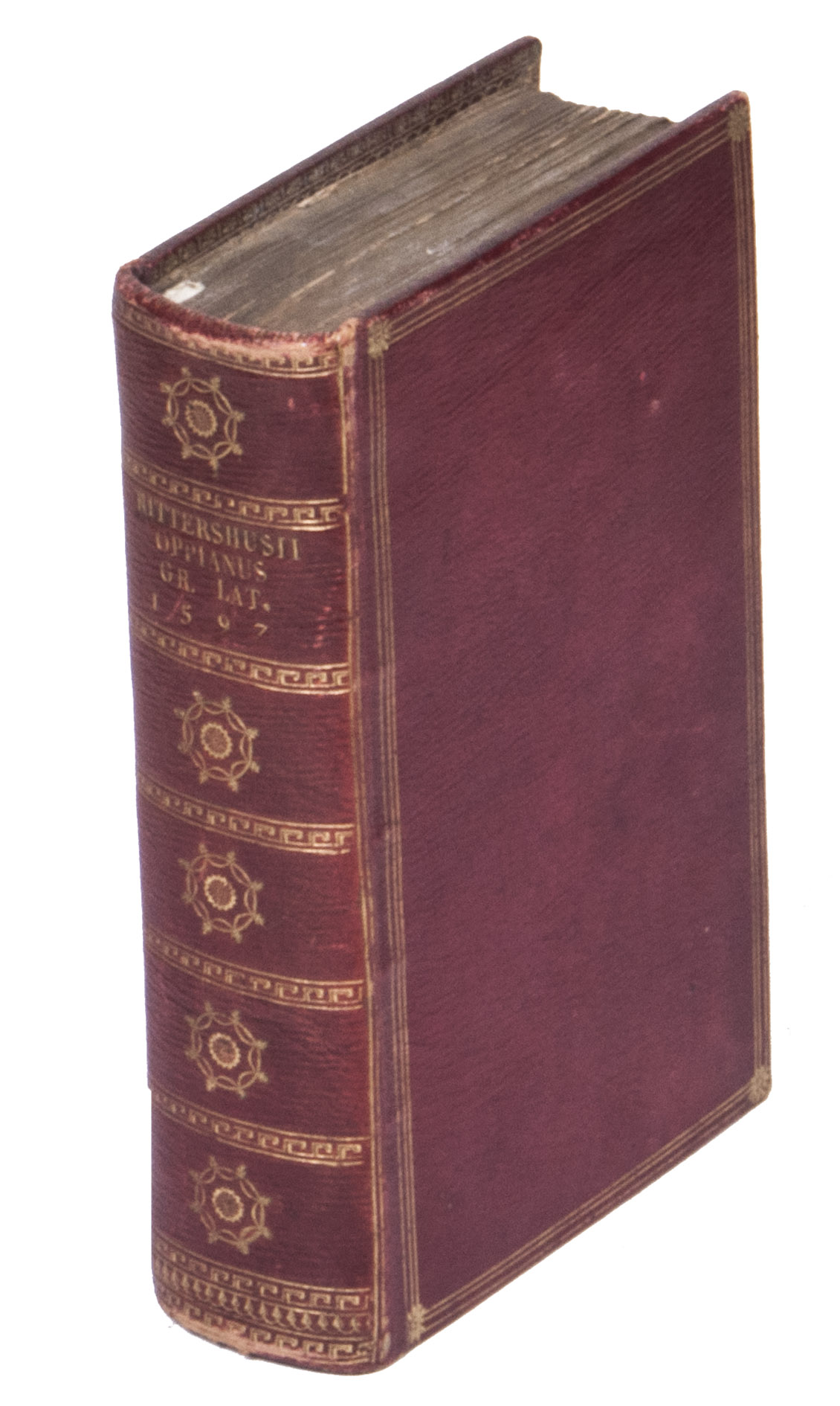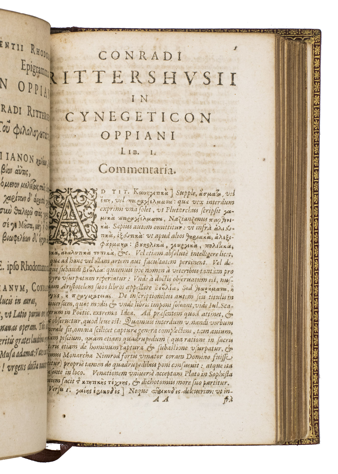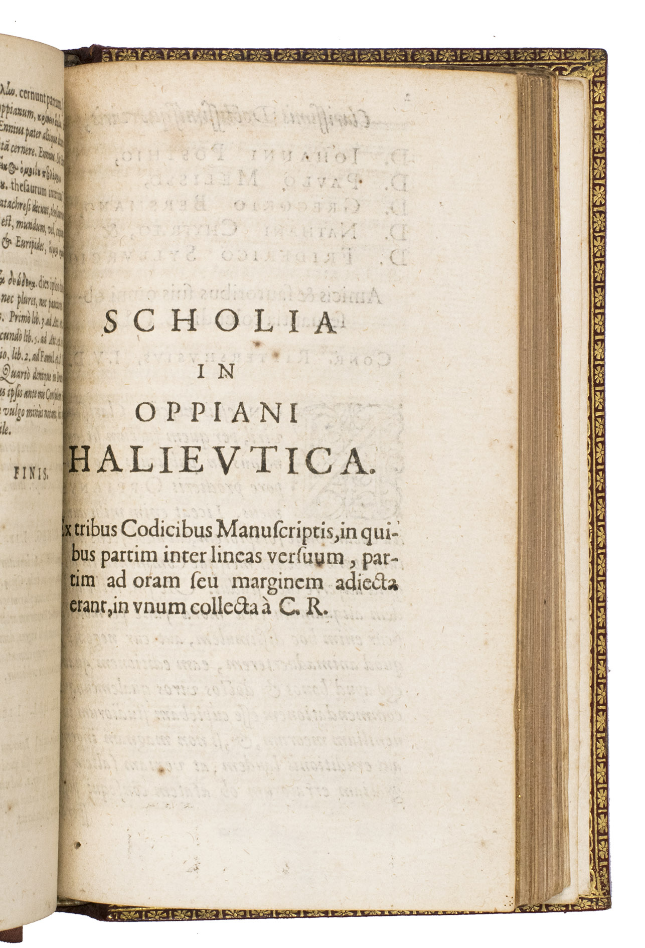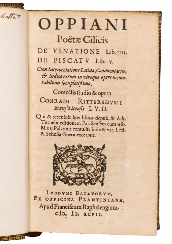 A beautiful edition printed in Leiden, nominally published by Franciscus Raphelengius the elder, but in fact printed by his son Franciscus the younger and published by Christophe Raphelengius (1566-1600), grandsons of Christoffel Plantin, featuring parallel Latin and Greek texts, with commentary and translation by Konrad Rittershausen, a German publisher, jurist, and philologist. This work contains the Greek poems of Oppian of Anazarbus on fishing and those devoted to hunting by Oppian of Syria. The two poets were long confused.