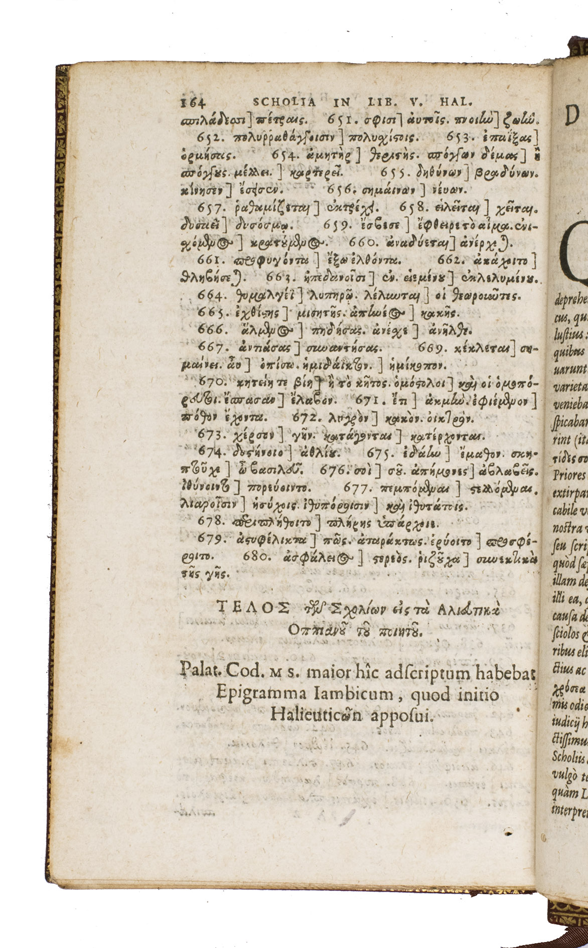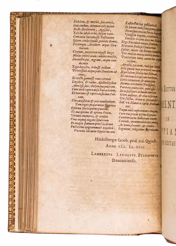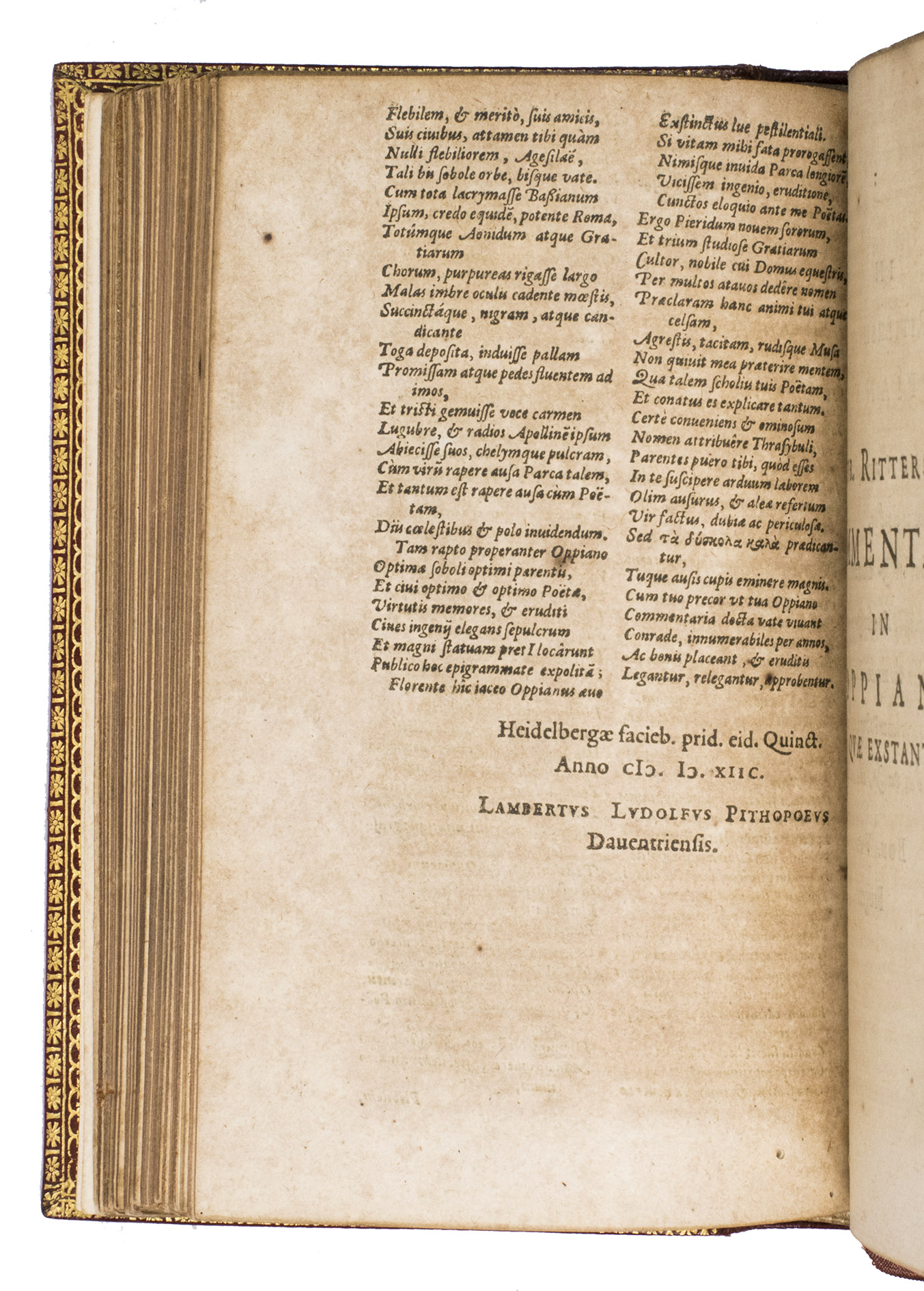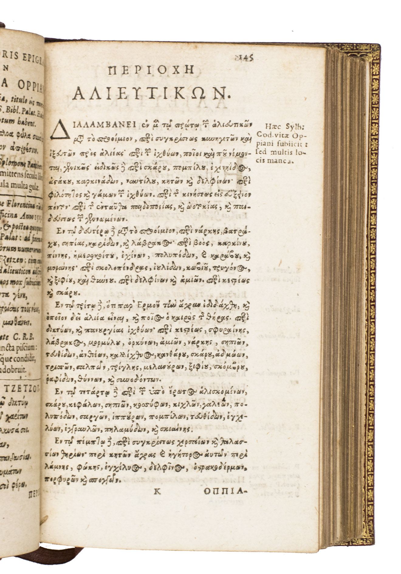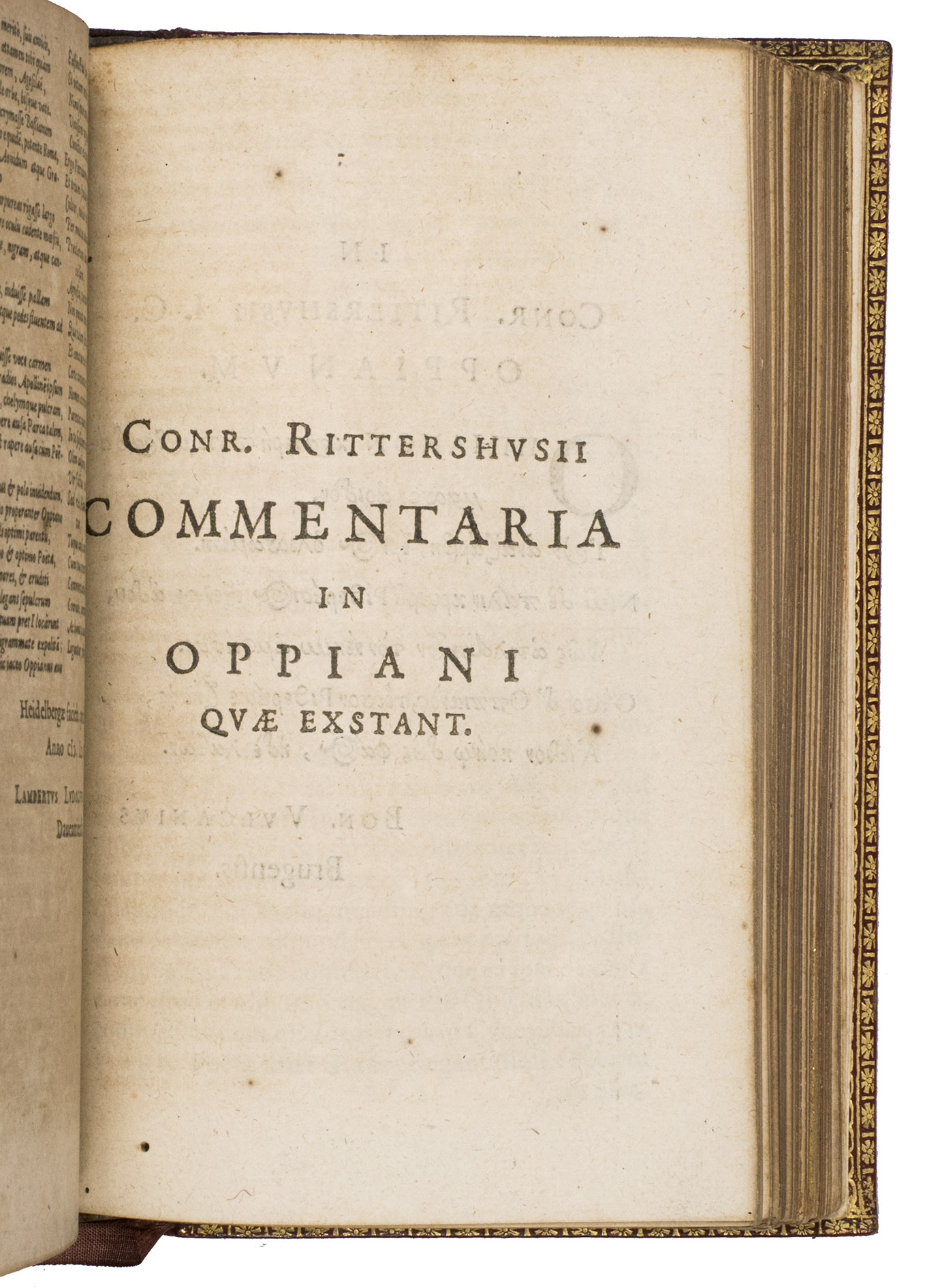 A beautiful edition printed in Leiden, nominally published by Franciscus Raphelengius the elder, but in fact printed by his son Franciscus the younger and published by Christophe Raphelengius (1566-1600), grandsons of Christoffel Plantin, featuring parallel Latin and Greek texts, with commentary and translation by Konrad Rittershausen, a German publisher, jurist, and philologist. This work contains the Greek poems of Oppian of Anazarbus on fishing and those devoted to hunting by Oppian of Syria. The two poets were long confused.