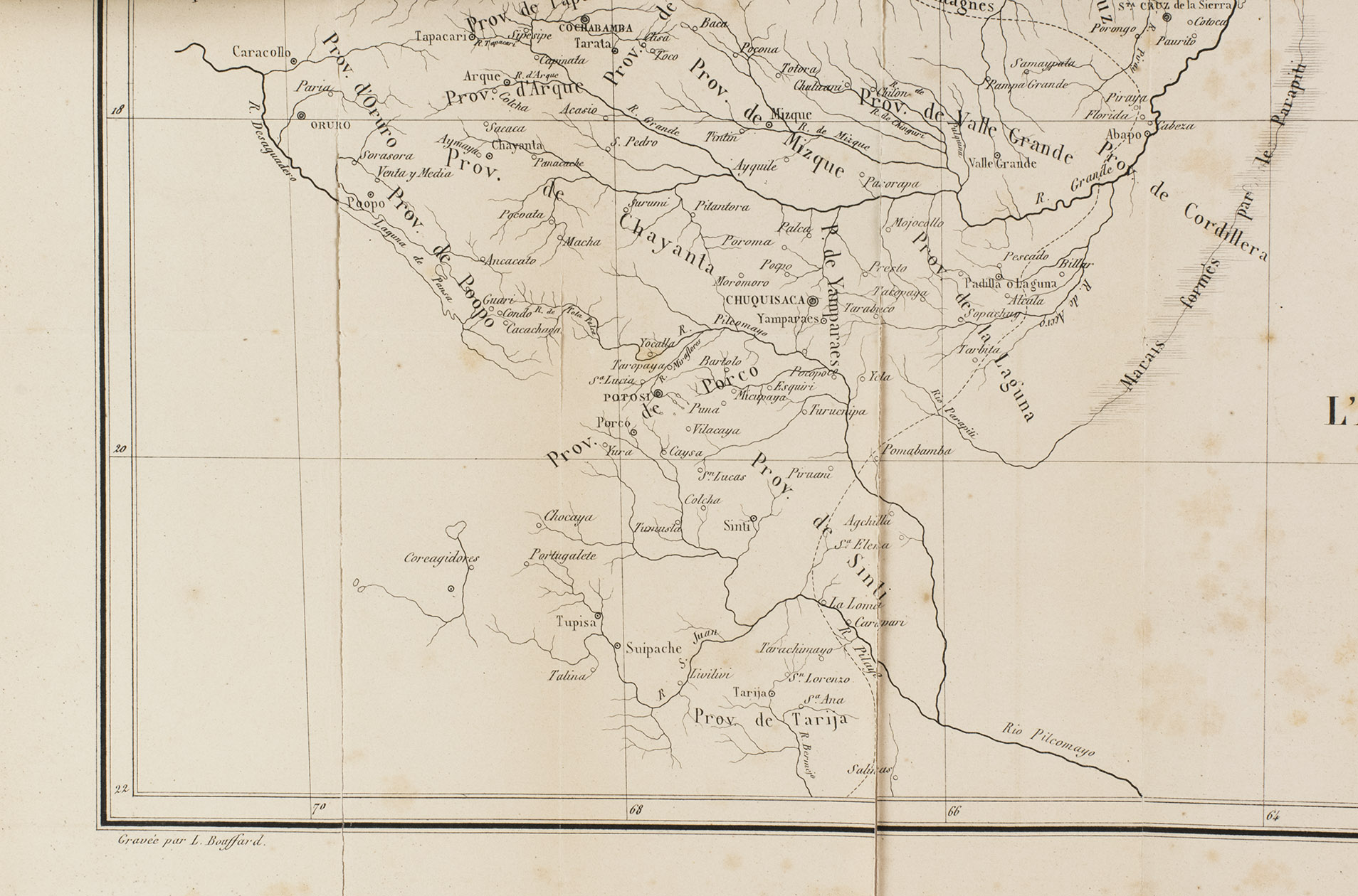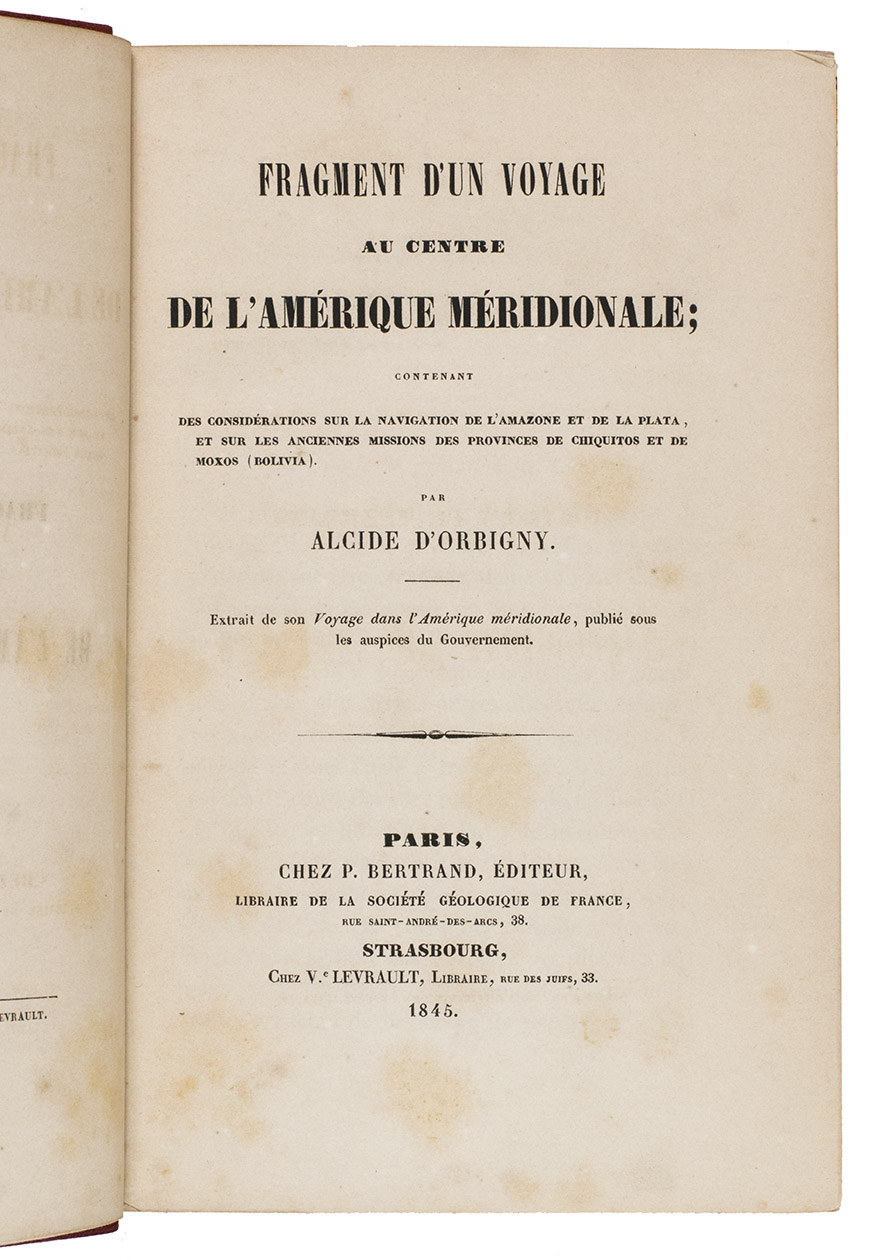 First edition in this form of a detailed account of an important series of scientific expeditions in central South America, mostly in the Bolivian provinces of Chiquitos and Moxos, by Alcide d'Orbigny (1802-1857). He organized expeditions in South America carried out in the years 1826 to 1833 under the auspices of the Muséum National d'Histoire Naturelle, established in Paris in 1793. He covered Brazil, Uruguay, Paraná, the pampas of Argentina, Patagonia, Chili, Bolivia and Peru, publishing the results in three volumes: Voyage dans l'Amerique Meridional, Strasbourg and Paris, 1835-1845. The present single volume, by the same Strasbourg publisher with a different Paris collaborator, is extracted from the larger work. The folding map, covering Bolivia and surroundings, includes an inset map showing its location within South America.
