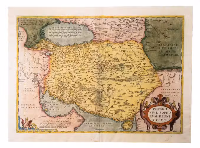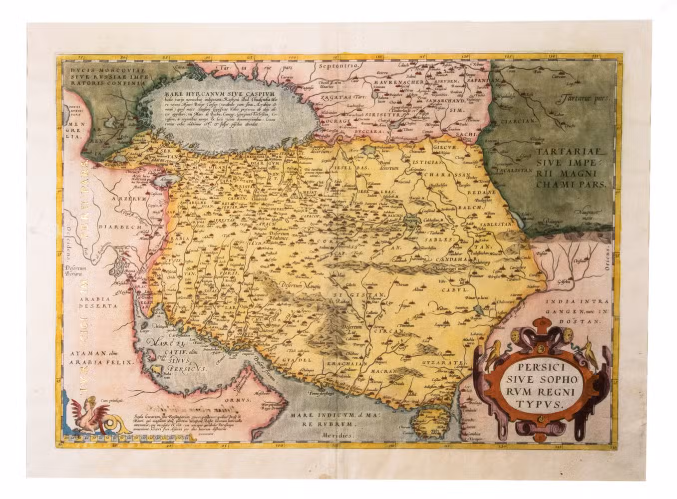 16th-century Dutch map of Persia based on the Gastaldi map, with additional new cartographic information. Alai, General maps E.70; Al-Qasimi 30; Van den Broecke 167 (first state).