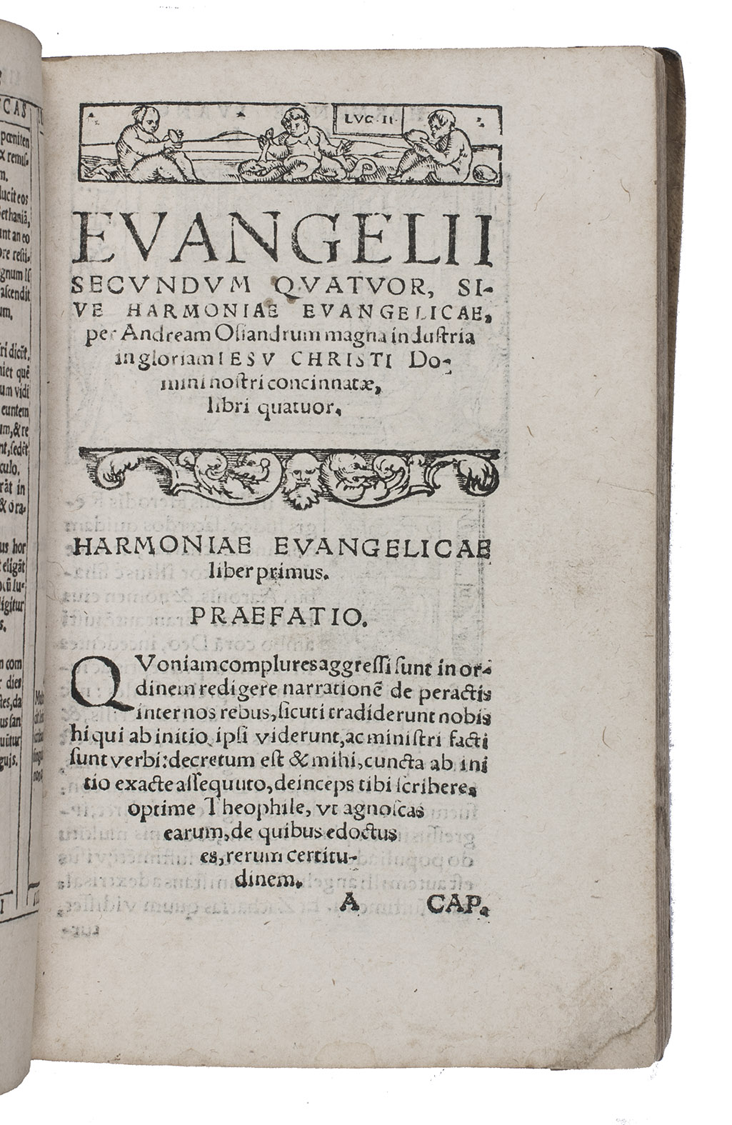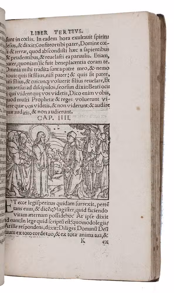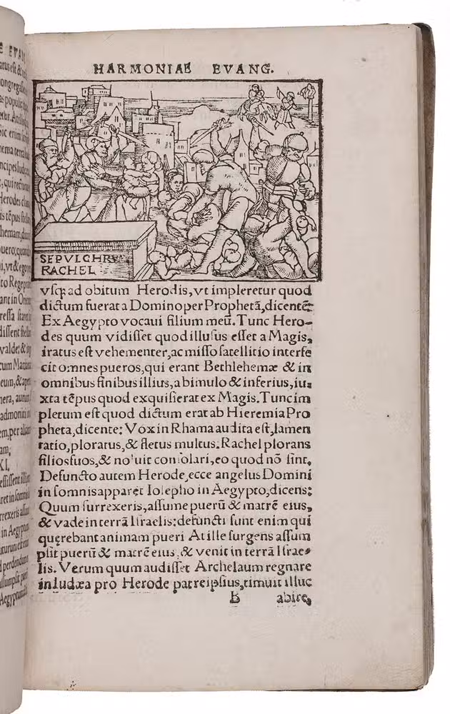Third (first illustrated) edition of Osiander's Harmony of the Gospels. It brings the four Gospels together to make a single narrative, prefaced by a comparative synopsis of the content of the four Gospels. Having studied Hebrew and Greek in Ingolstadt, Andreas Osiander (1496-1552) became a priest in 1520. He subsequently came in contact with supporters of the Reformation and became a prominent Protestant leader. In 1548 he was appointed professor of theology in Königsberg. His last years there were, however, overshadowed by the bitter debates caused by his controversial doctrine of divine justice: the so-called "Osiandrische Streit". Osiander's writings consist for the most part of expositions of the scripture, sermons and essays on the theological controversies of the day.