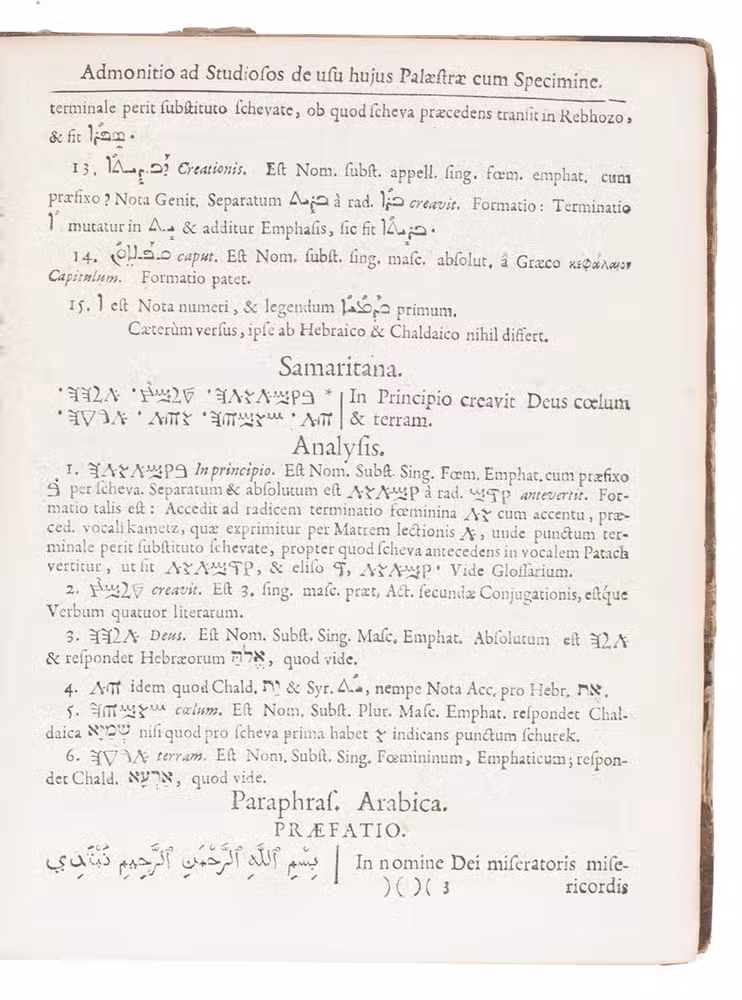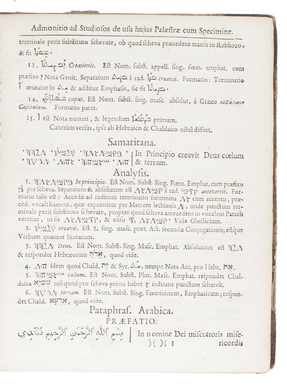 Palaestra linguarum orientalium, hoc est: quatuor primorum capitum Geneseos, I. Textus originalis tam ex Judaeorum quàm Samaritanorum traditionibus. II. Targumim seu paraphrases orientales praecipuae, nempe I. Chaldaicae, (Onkelosi, Jonathanis et Hierosolymitana) II. Syriaca, III. Samaritana, IV. Arabica, V. Aethiopica, VI. Persica. Omnia cum versione Latinâ ...