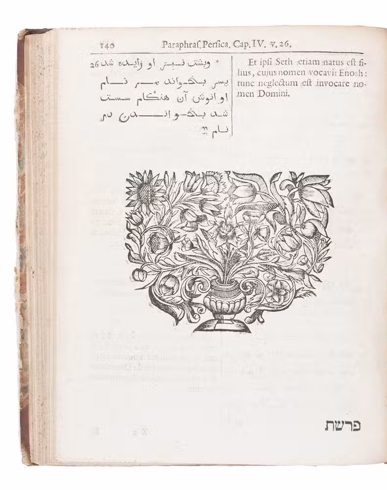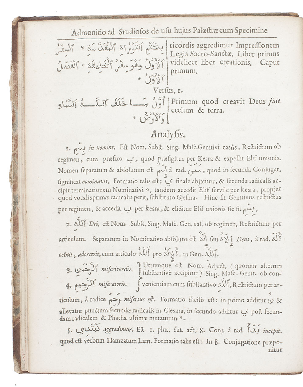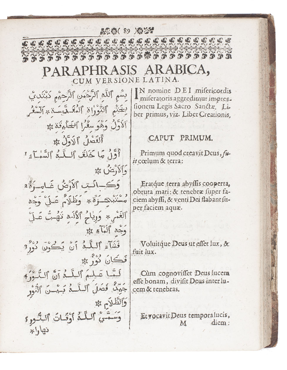 First and only edition of a small polyglot Bible. Although this only contains the first four chapters of Genesis, it does so in seven languages printed in five different scripts. The publication of polyglot bibles in the 16th and 17th centuries was an important aid in comparative Bible studies. By comparing the eldest versions of the Bible available, written in the languages in use in the Middle-East, scholars hoped to better understand the text. Most of the text in this edition was reprinted from the London Polyglot published in 1654-57, but apparently the Ethiopic text was published here for the first time.