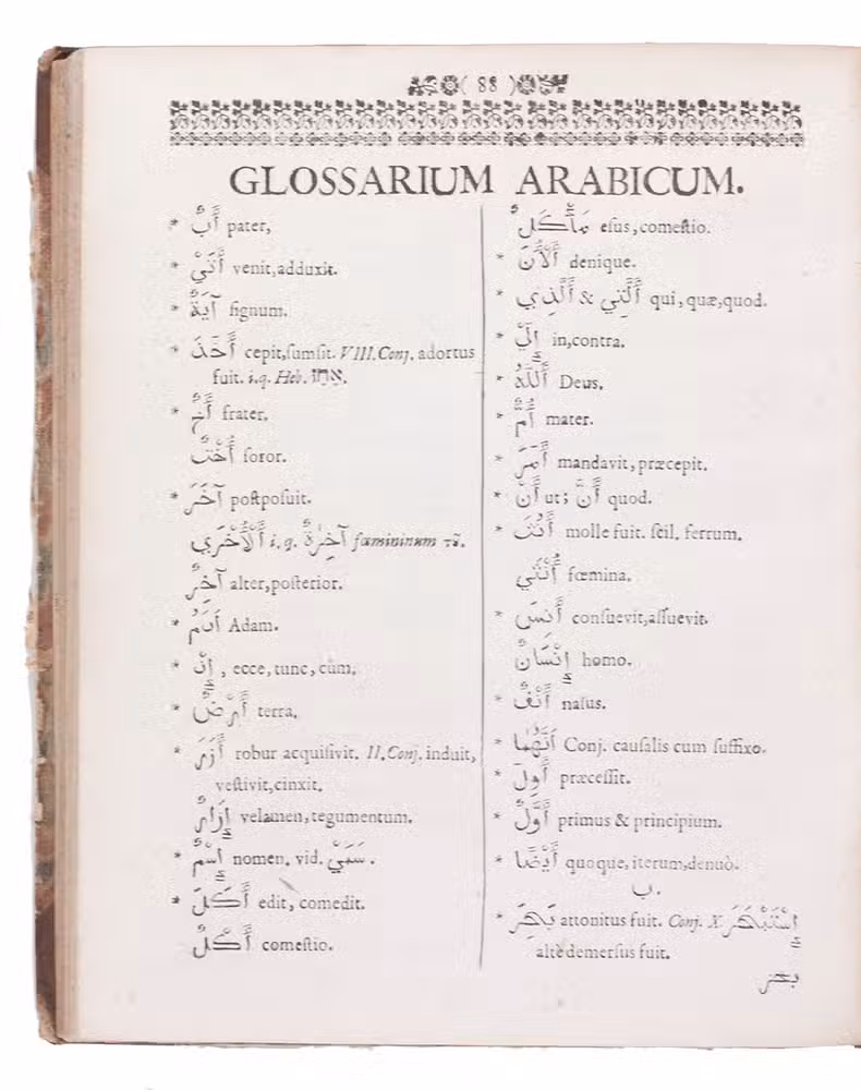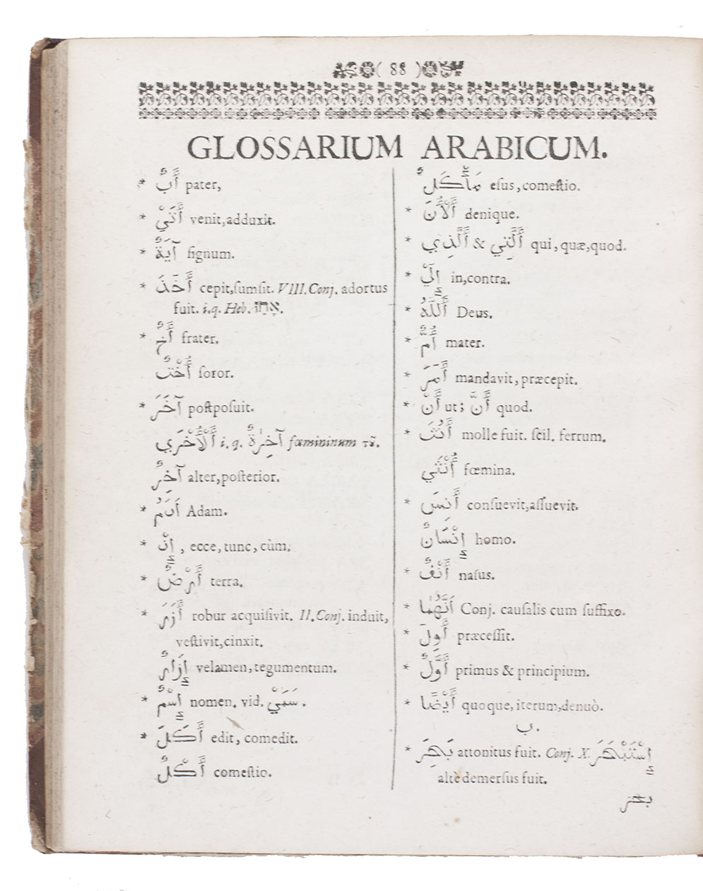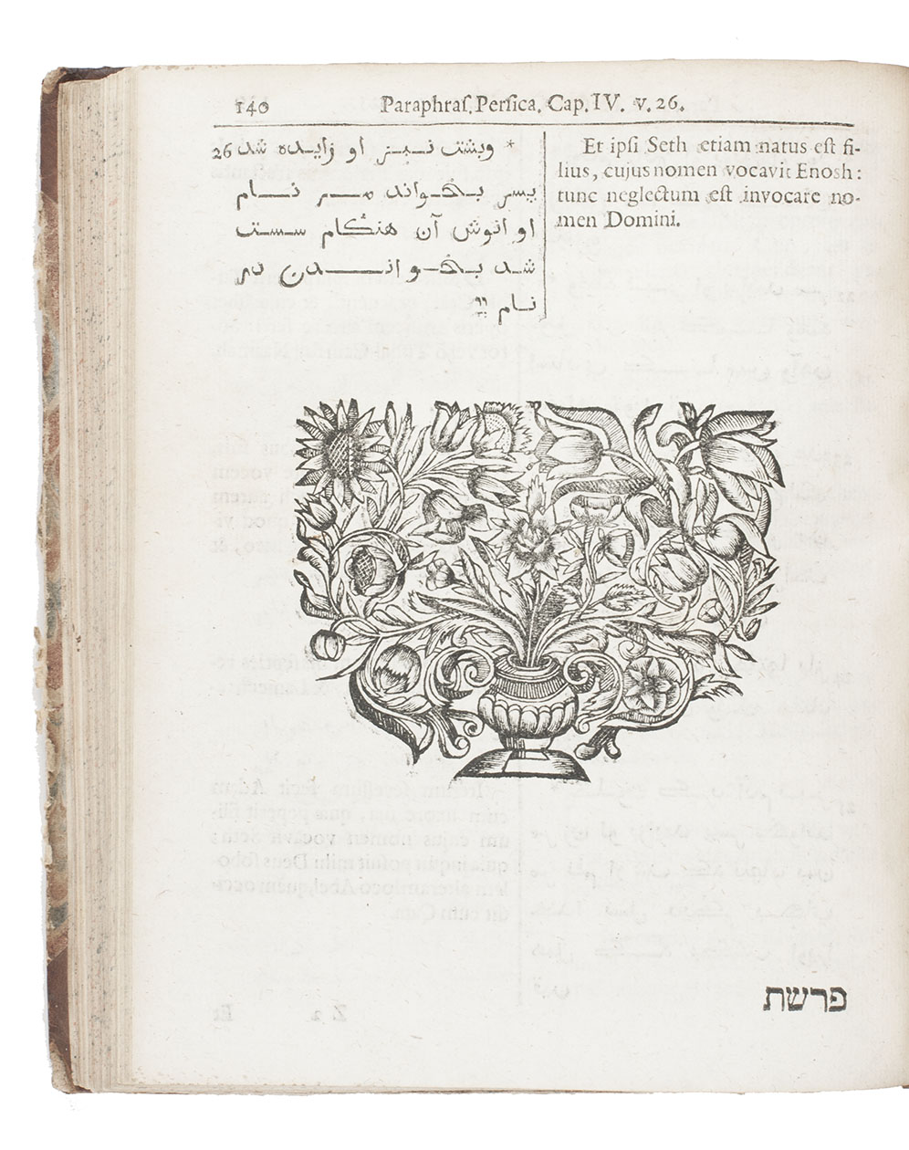 Frankfurt am Main, published by Friedrich Knoch, printed by Martin Jacquet, 1702. 4to. With one woodcut initial. Set in roman, Arabic, Hebrew, Samaritan and Ethiopic types. 2 parts in 1 volume. Nineteenth-century half calf with marbled sides. [18] 140, 147, [3] pp.