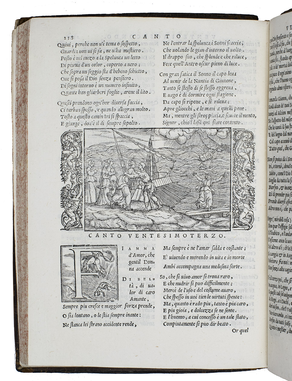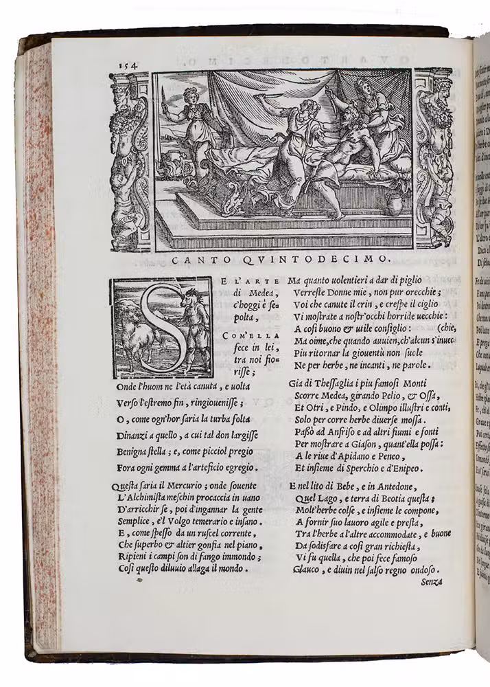 Early Venice edition, richly illustrated, of Lodovico Dolces complete translation, in 8-line verses, of Ovids Metamorphoses, first published in 1553, with a second edition in the same year. Mortimer discusses both 1553 editions extensively and adds some information on the 1555 and present 1557 editions. The first has 83 woodcuts plus 11 repeats, but 6 were originally intended to illustrate a Bible, not an Ovid edition. The second edition adds 4 new blocks but omits 5 of the 6 Bible illustrations to make 82 plus a few repeats. The second edition also added ornamental woodcut strips on the sides of some woodcuts to fit the space better. Mortimer notes that the third edition of 1555 and the present fourth of 1557 contain the same woodcut illustrations and decorations as the second 1553 edition.