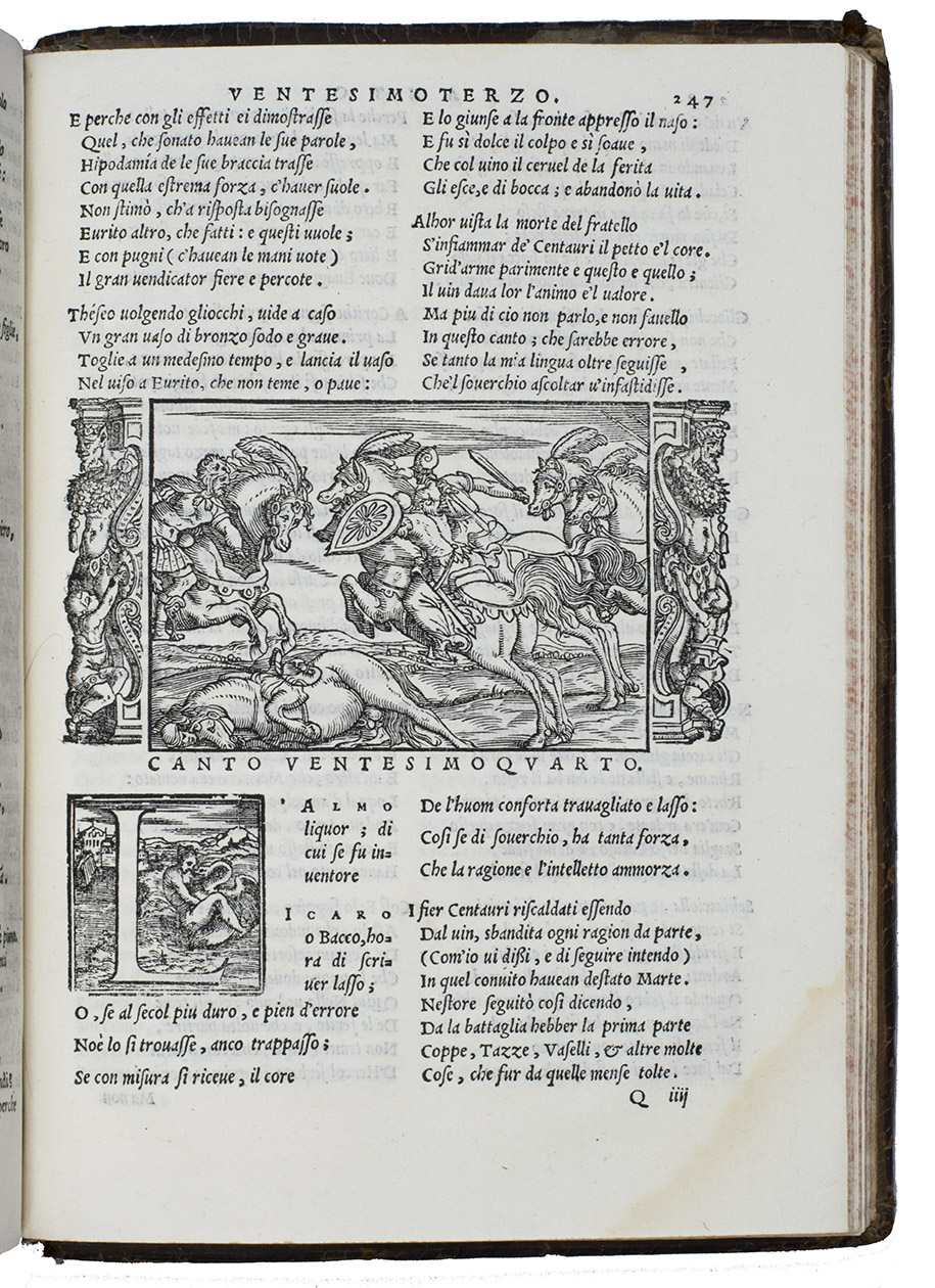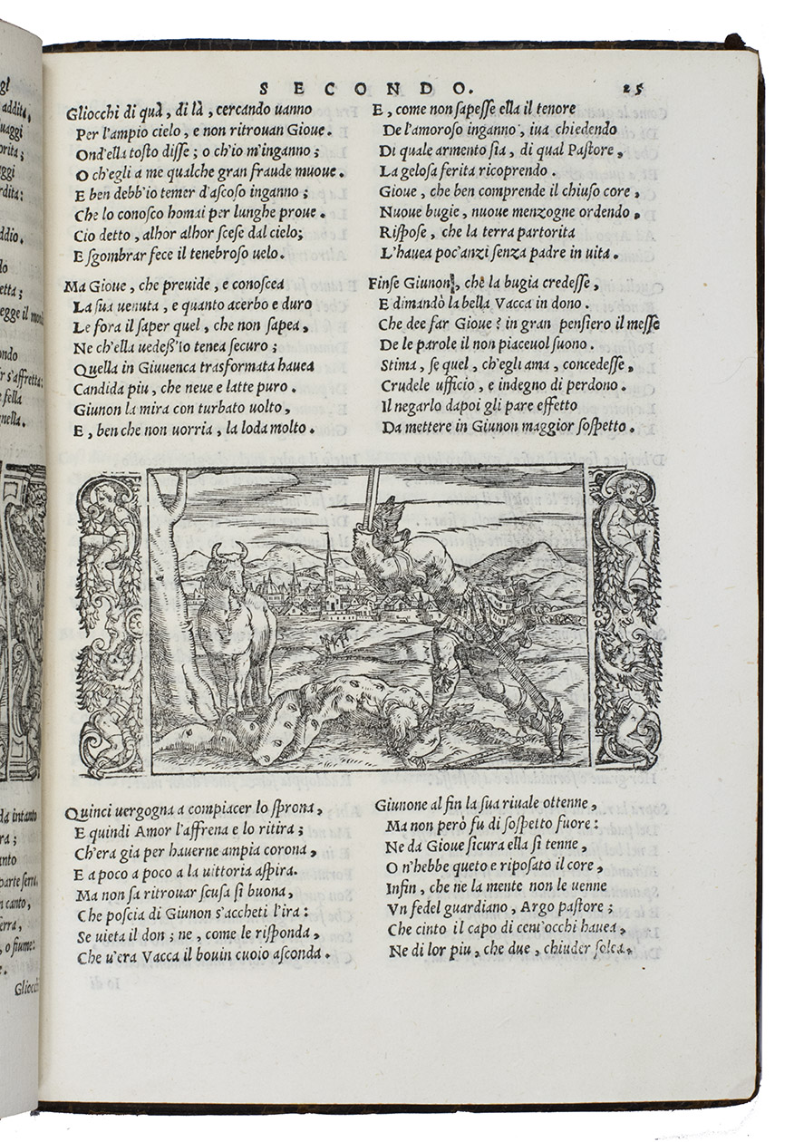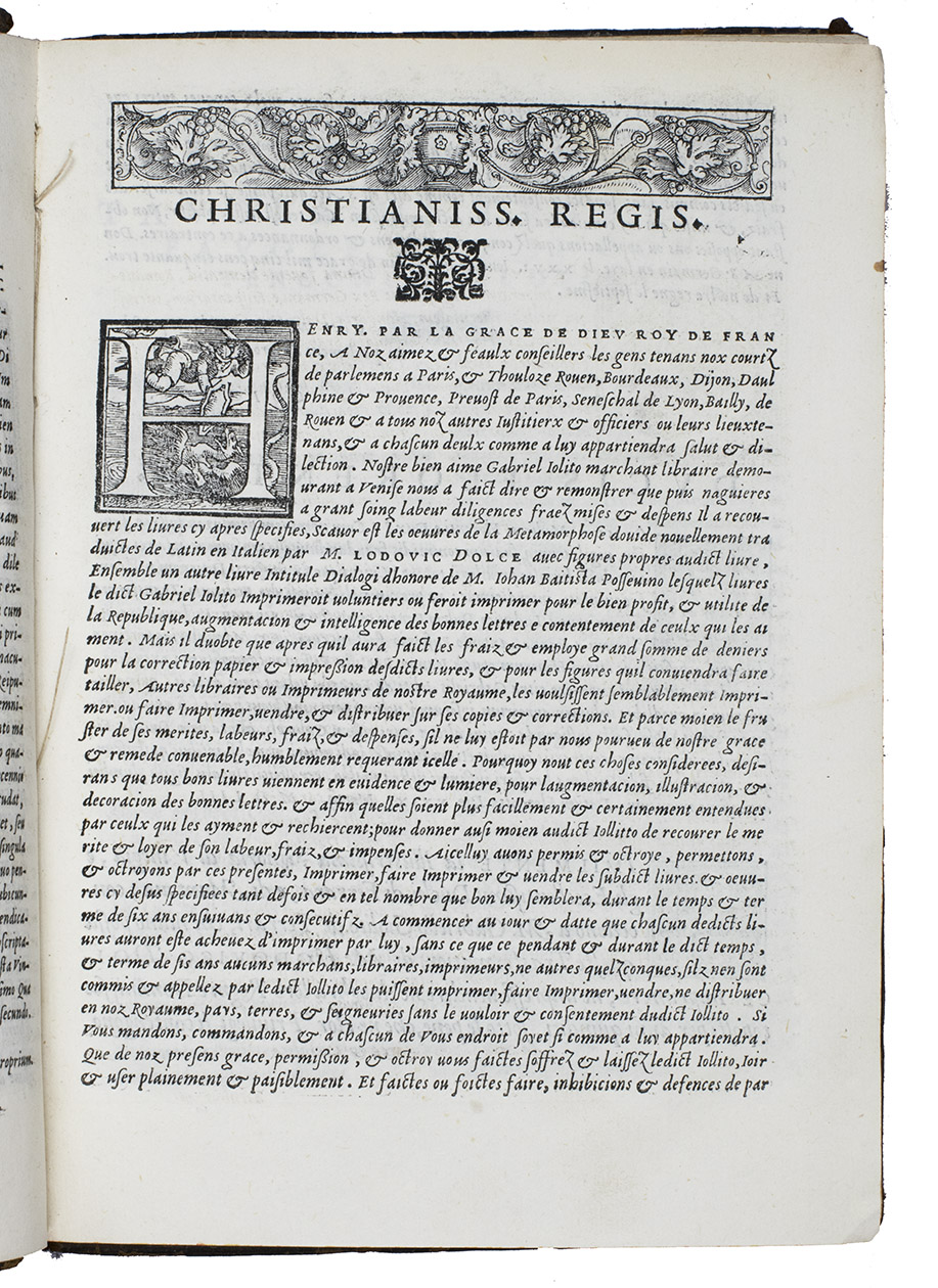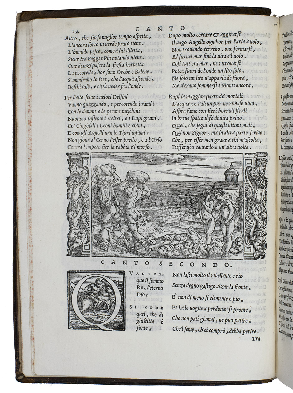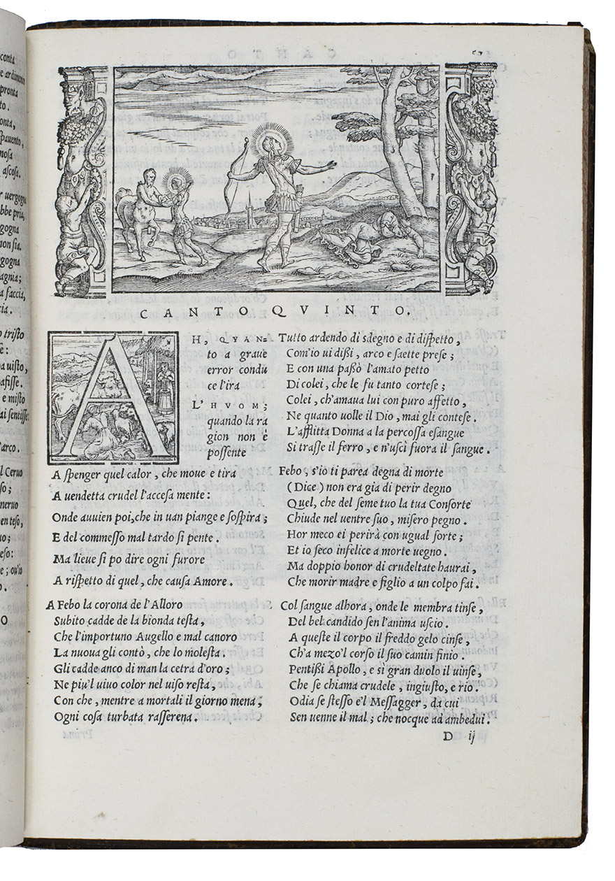 As noted above, all but one of the present 82 woodcut blocks had been especially designed for Dolces Ovid translation. Giolitos artist chose a number of subjects that had not been illustrated before, and the blocks were carefully cut. The diagram of the winds that appears in many early Ovid editions, has here as in the first edition grown into a hemispherical map covering the Americas, Europe and Africa, with what is now the United States labelled "Nueva Hispania". The historiated initials of various sizes are also of interest, the two largest series being especially finely cut. Our copy is bound in an interesting and very attractive, if somewhat crude, binding. Armorial bookplate on the front paste-down: bird standing on a mound, supported by two stags, the whole with a marquiss(?) crown. In good condition. Binding rubbed and slightly damaged, re-cased with new endpapers; interior spotless. BMC STC Italian, p. 482; Brunet II, 789; ICCU CNCE 64382; Mortimer, Italian 342 note; USTC 845814; cf. Adams O508 (1553 1st Dolce ed.).