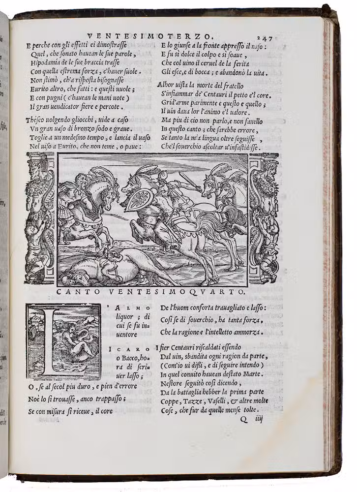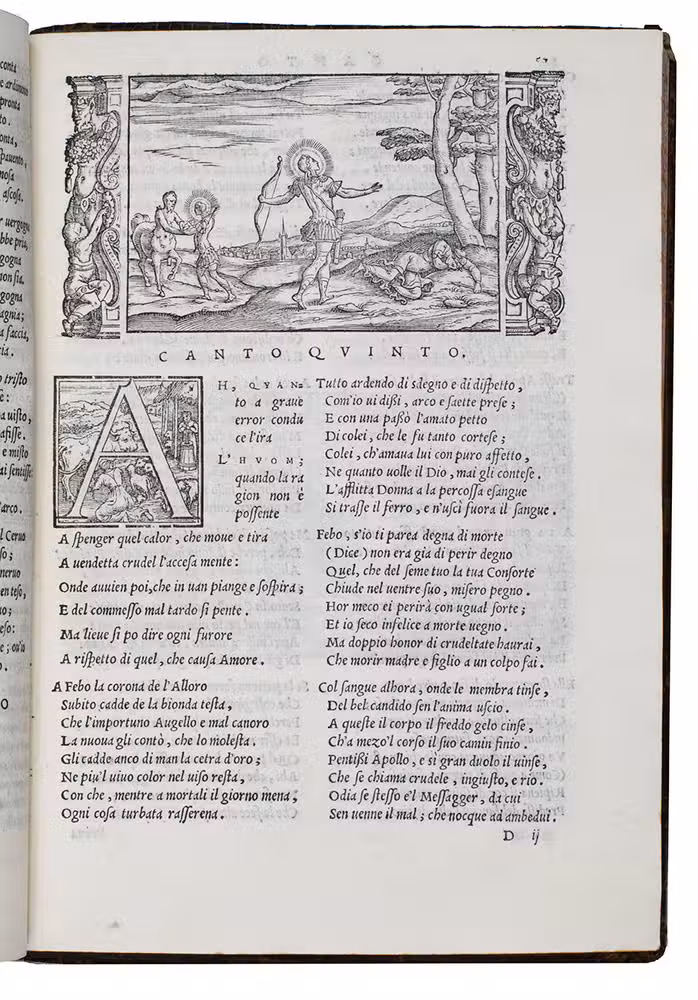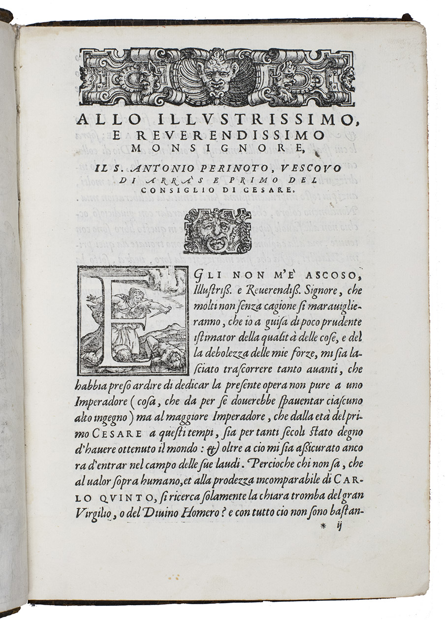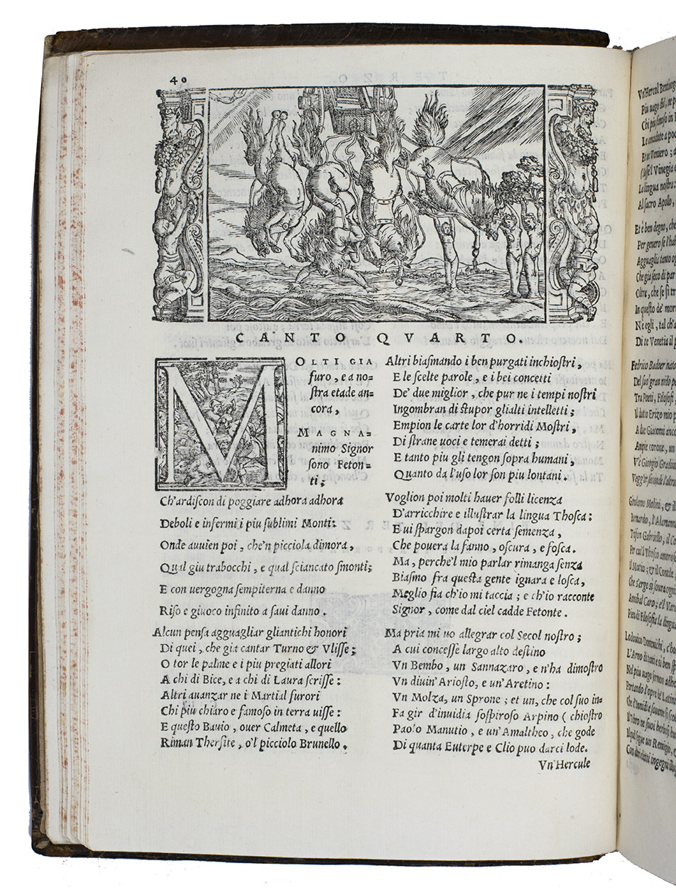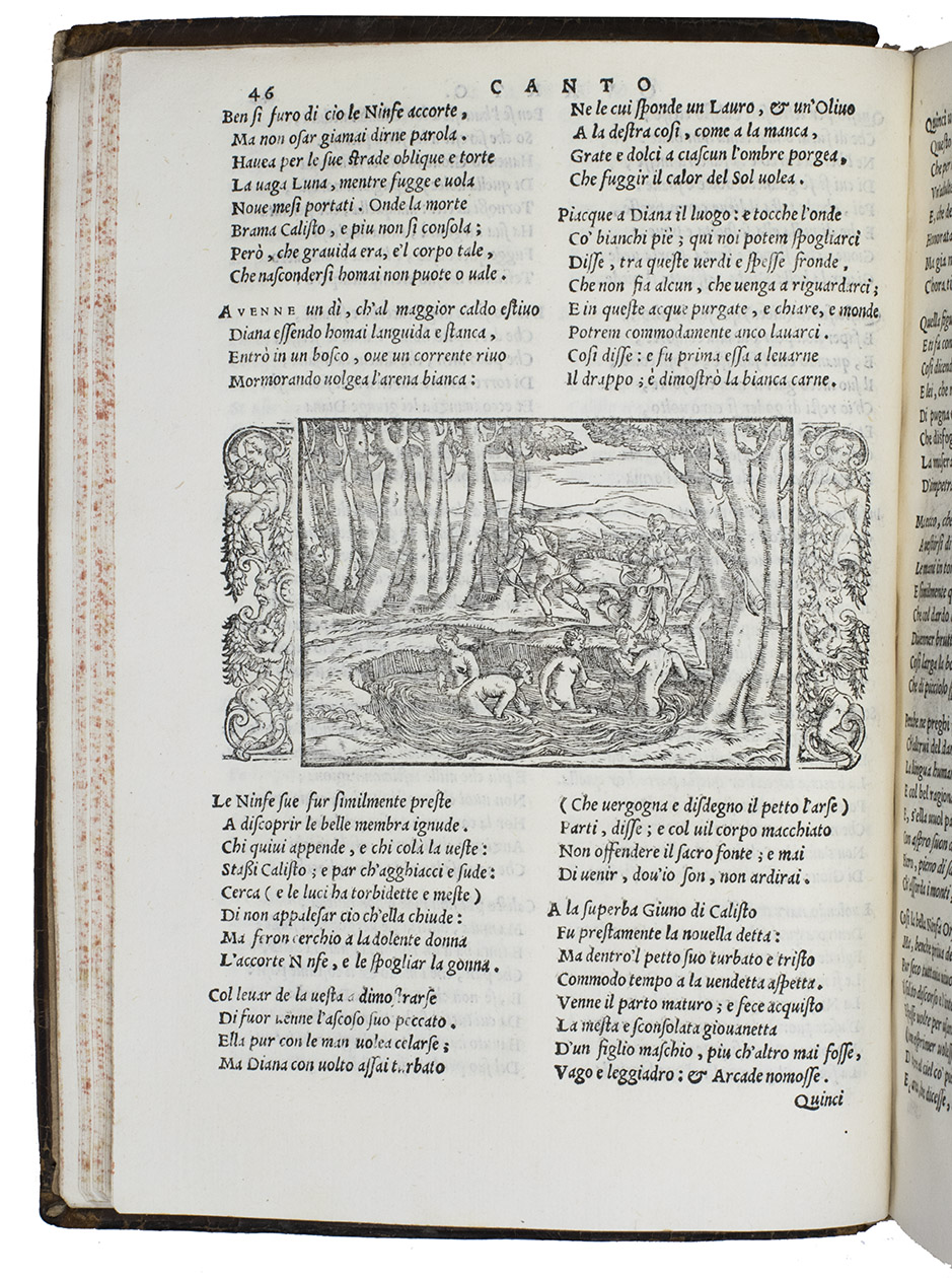 As noted above, all but one of the present 82 woodcut blocks had been especially designed for Dolces Ovid translation. Giolitos artist chose a number of subjects that had not been illustrated before, and the blocks were carefully cut. The diagram of the winds that appears in many early Ovid editions, has here as in the first edition grown into a hemispherical map covering the Americas, Europe and Africa, with what is now the United States labelled "Nueva Hispania". The historiated initials of various sizes are also of interest, the two largest series being especially finely cut. Our copy is bound in an interesting and very attractive, if somewhat crude, binding. Armorial bookplate on the front paste-down: bird standing on a mound, supported by two stags, the whole with a marquiss(?) crown. In good condition. Binding rubbed and slightly damaged, re-cased with new endpapers; interior spotless. BMC STC Italian, p. 482; Brunet II, 789; ICCU CNCE 64382; Mortimer, Italian 342 note; USTC 845814; cf. Adams O508 (1553 1st Dolce ed.).