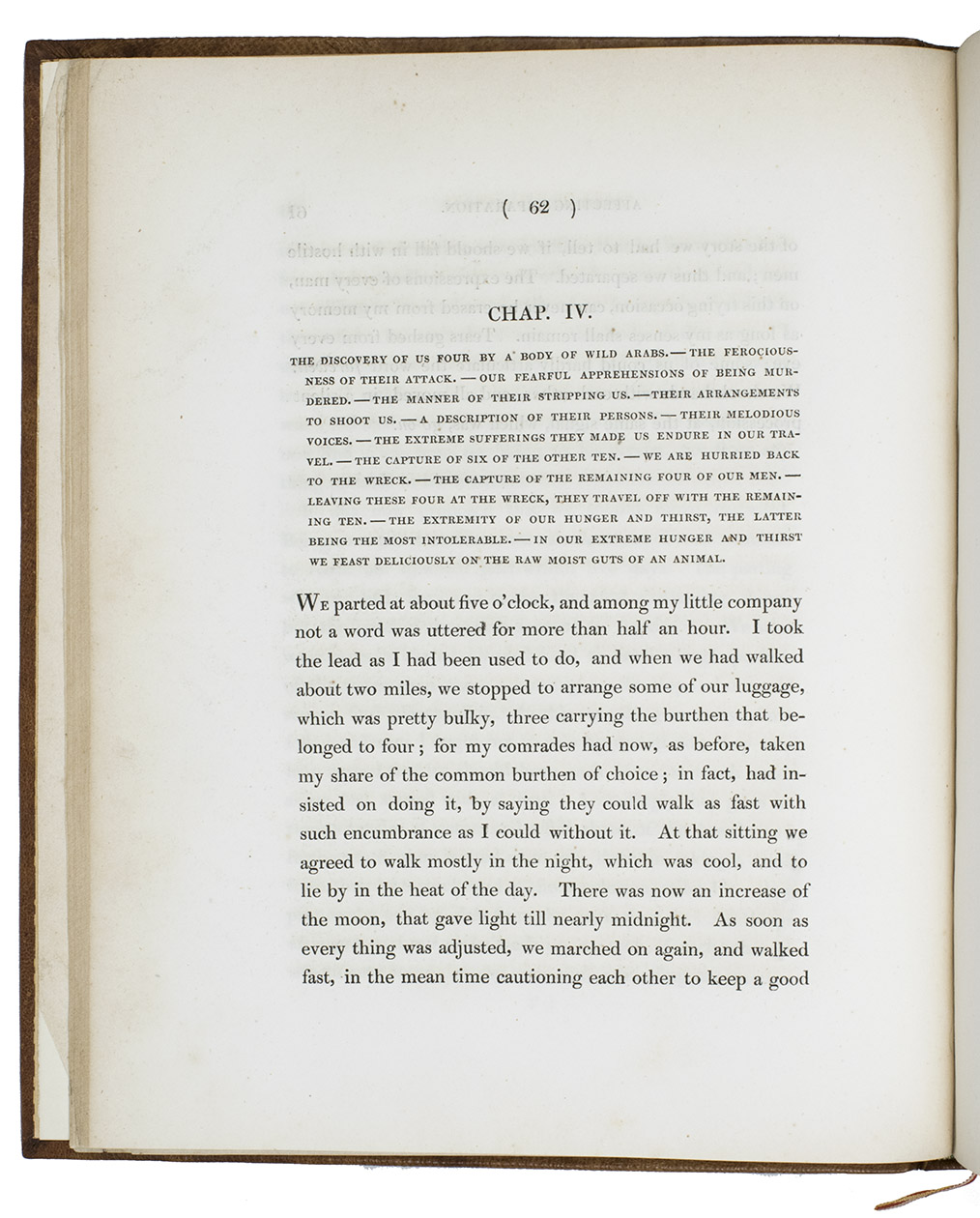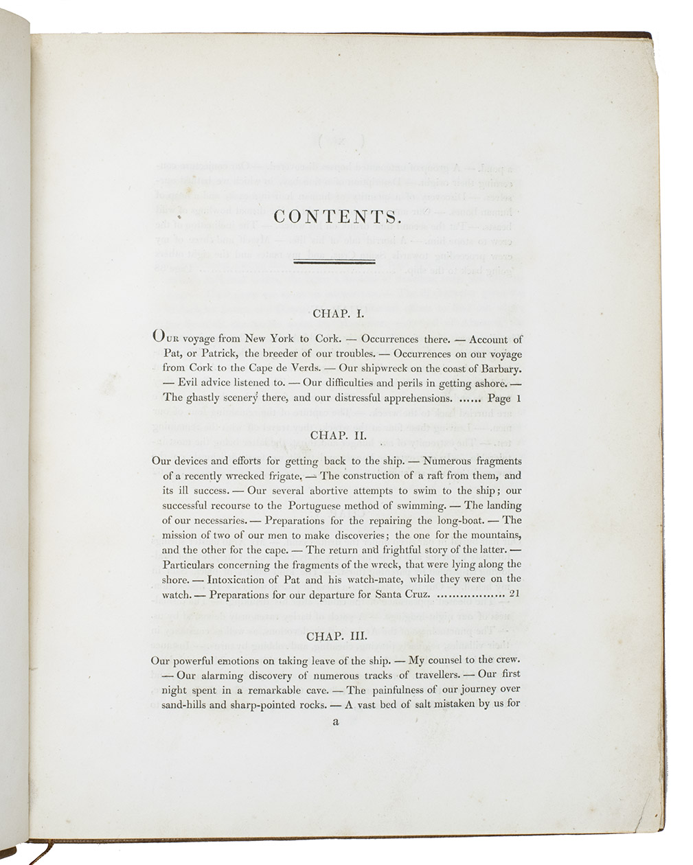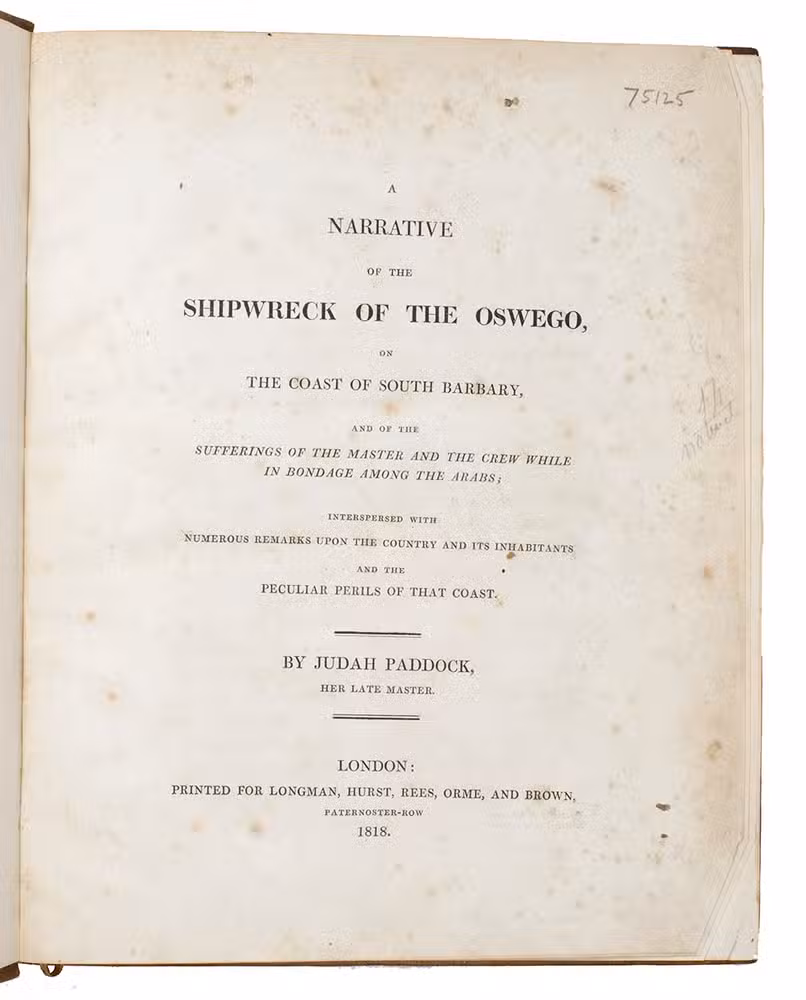 First British edition, published in the same year as the first American edition, of a detailed narrative of the wreck of the 260 ton American ship Oswego off the coast of Africa near the Canary Islands on 28 March 1800 and the capture of the captain and crew by a party of seven armed Islamic hunters armed with guns and daggers. It was written by the ship's Quaker captain Judah Paddock, whose detailed description of their months in captivity provides a wealth of information about Islamic culture in a region where few Europeans or Americans had ever ventured. Their captors forced them to march inland through the desert for five or six days, where they sold the white prisoners to nomadic shepherds but chose to keep the two black prisoners for their own use and departed with them.