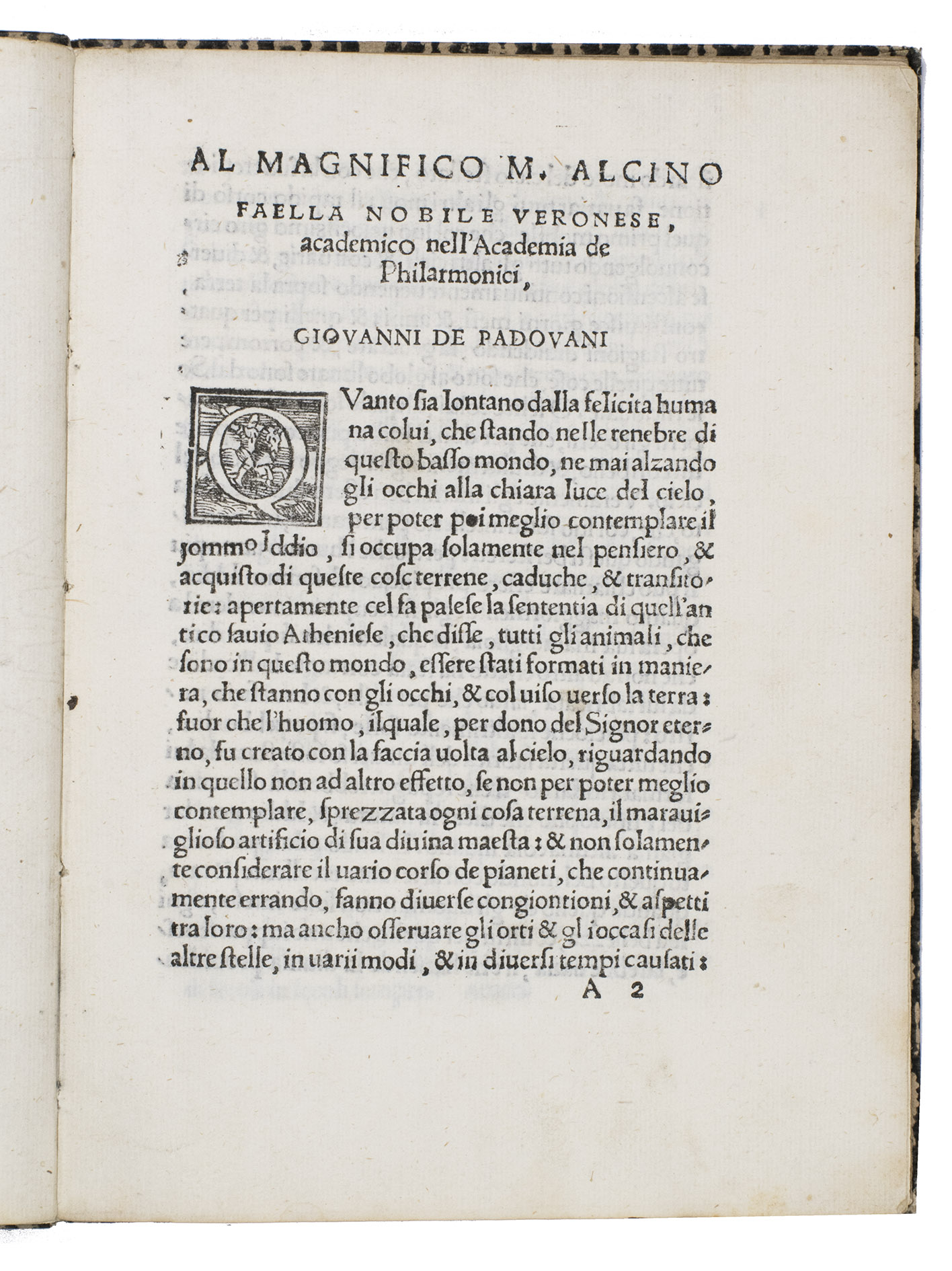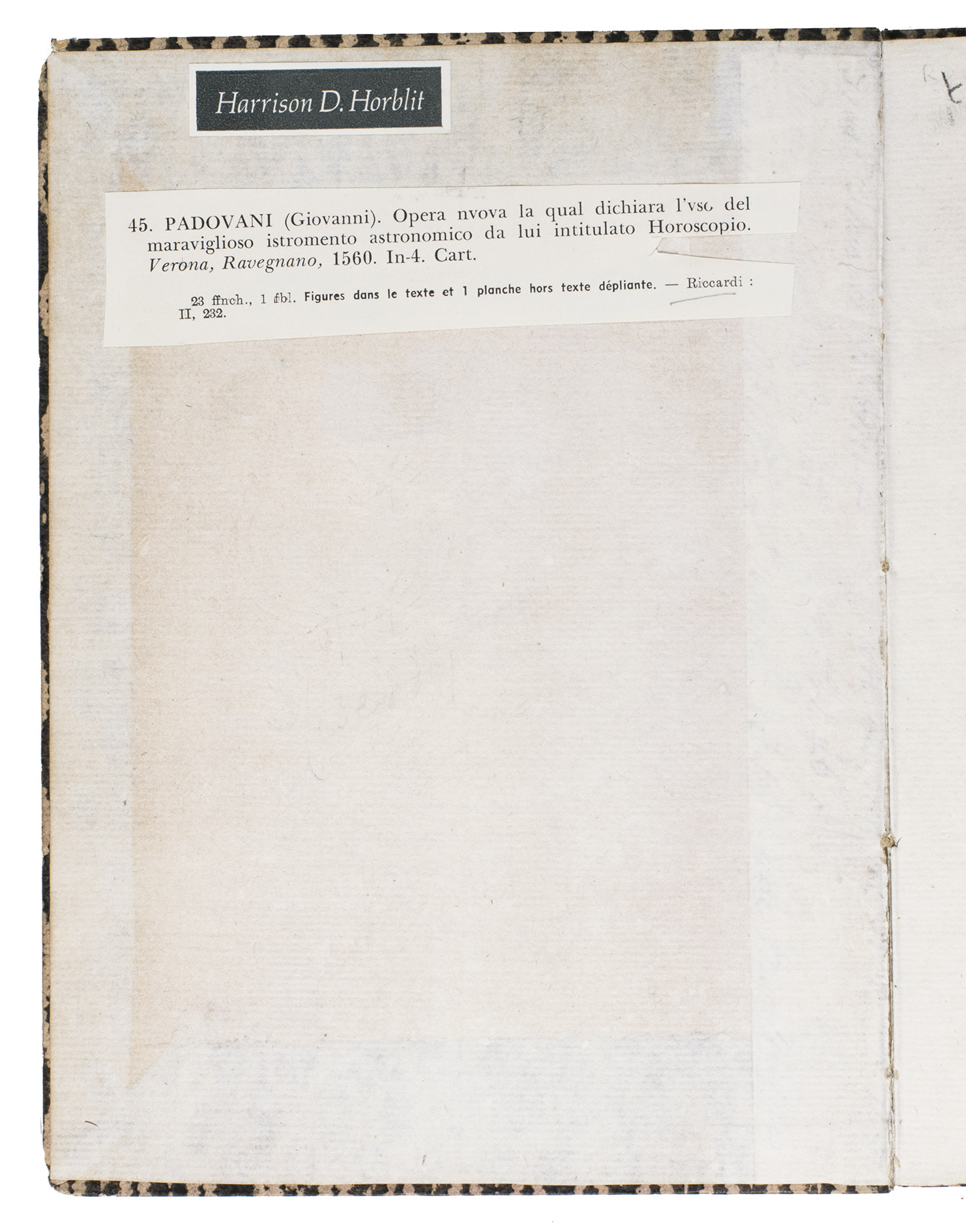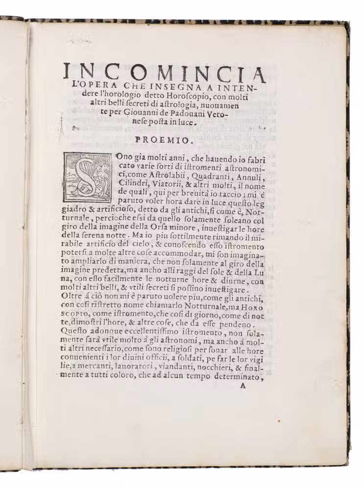The rare first significant publication (extremely rare with the folding woodcut plate) by the Veronese astronomer Giovanni Padovani (ca. 1512-ca. 1590), explaining the use of his "horoscopio", also known as a nocturnal or a horologium nocturnum, which he presents as his new invention. The folding plate contains two woodcuts for the owner to cut out and assemble (they could be pasted on paperboard or thin wood) to make two astronomical instruments that allow one to determine time by the sun, moon or stars. The plate may have been an option for those who could afford it, but many owners no doubt removed it in order to use it, as intended. The entire plate is lacking in nearly all copies, including those of the British Library and the Biblioteca Nazionale Naples, viewable on the Internet. Giuliari refers to "la figura incisa sul legno", but we have seen only one clear reference to a copy that includes the plate, at the Biblioteca Nacional in Madrid: "[1] h. de grab. pleg." (the Bibliothèque Nationale in Paris refers less clearly to "pièces limin.", and the Cat. del. Servizio Bibl. Nazionale notes "ill." but gives a link to the Naples copy without the plate). Neither Honeyman nor Houzeau & Lancaster mention the plate and Riccardi apparently knew it only from Giuliaris reference.
