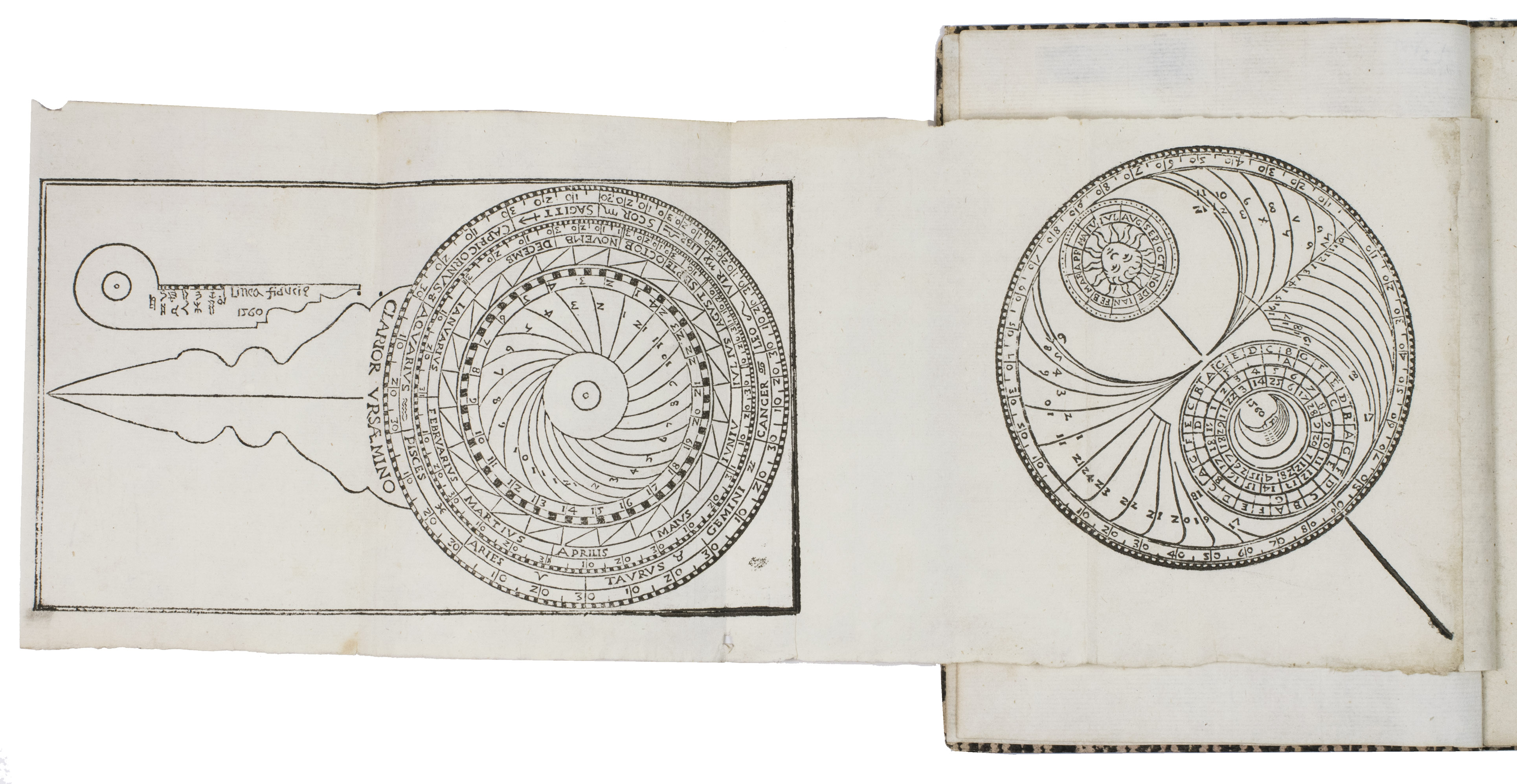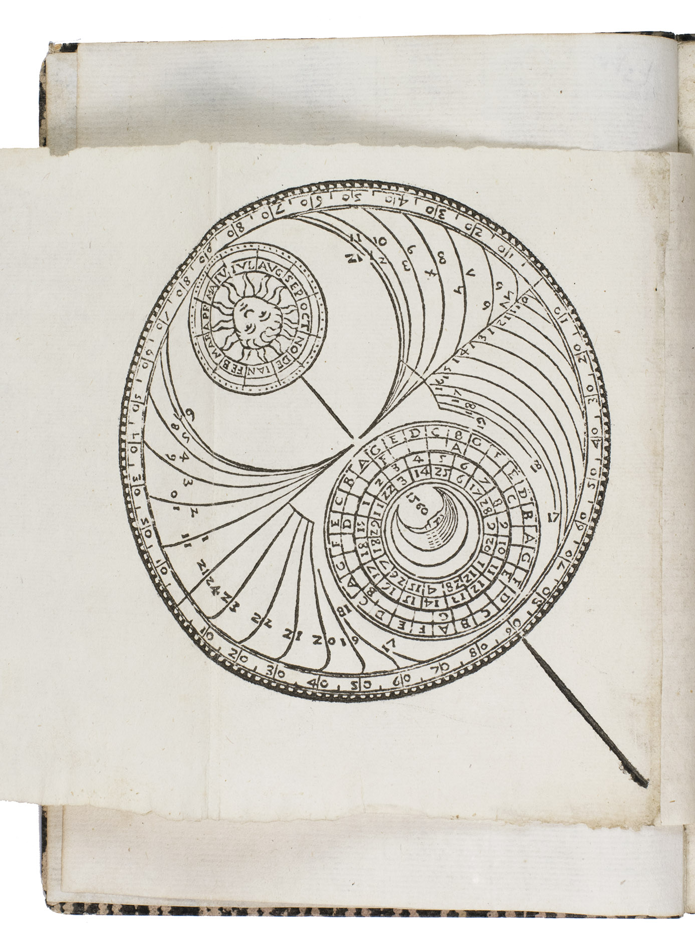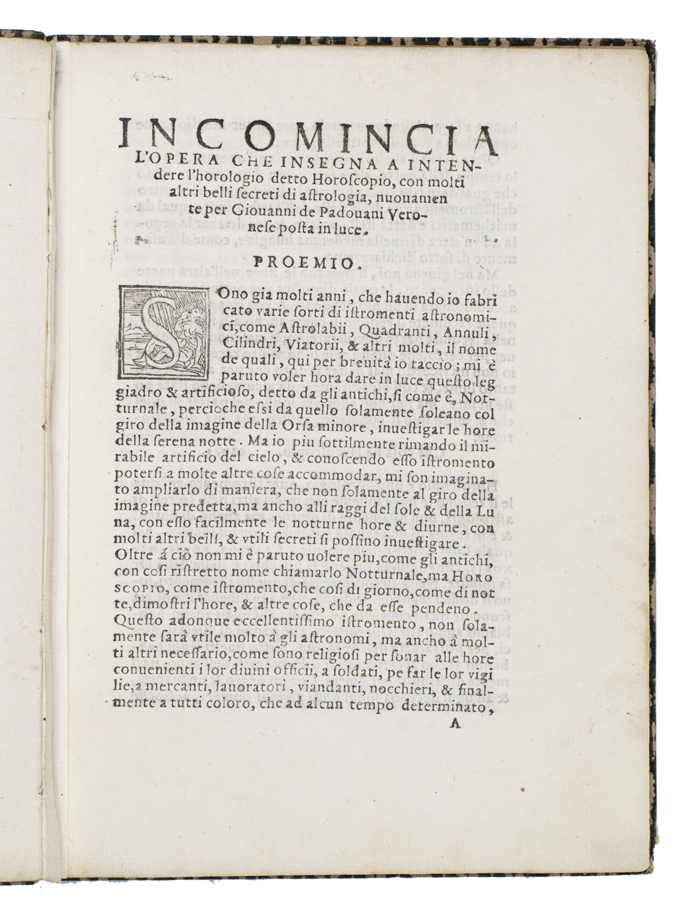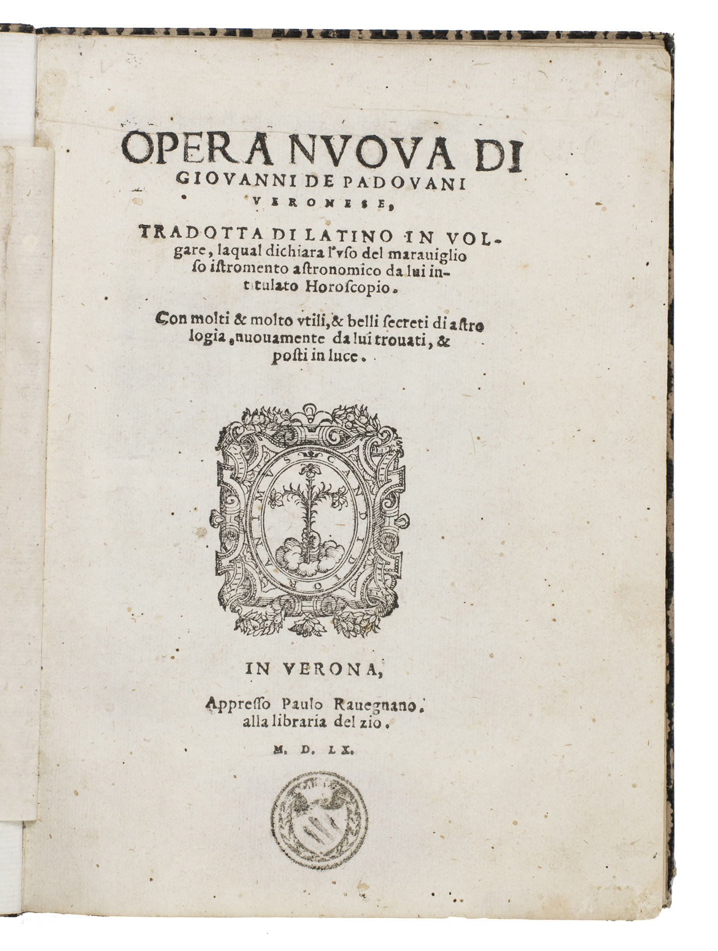 Verona, Paolo Ravagnano, 1560. 4to. With Ravagnanos woodcut emblematic device on the title-page (a hand emerging from a cloud and holding a stalk with three lilies, the whole in an oval in a rectangular scrollwork cartouche, with the motto, "candidio animus"), a folding plate (oblong long folio: 15.5 x 41.5 cm) containing 2 woodcuts (12.5 x 22 cm & 12 cm diameter with the 4.5 cm gnomen making it 14 x 13 cm) designed to be cut up to make the authors "horoscopio" in the form of a volvelle and the sundial-lunar dial, 3 decorated woodcut initials (pictorial), planetary and zodiac signs, and numerous tables of numerical data. 19th-century(?) boards, covered with block-printed decorated paper (black on white). [46], [2 blank] pp.