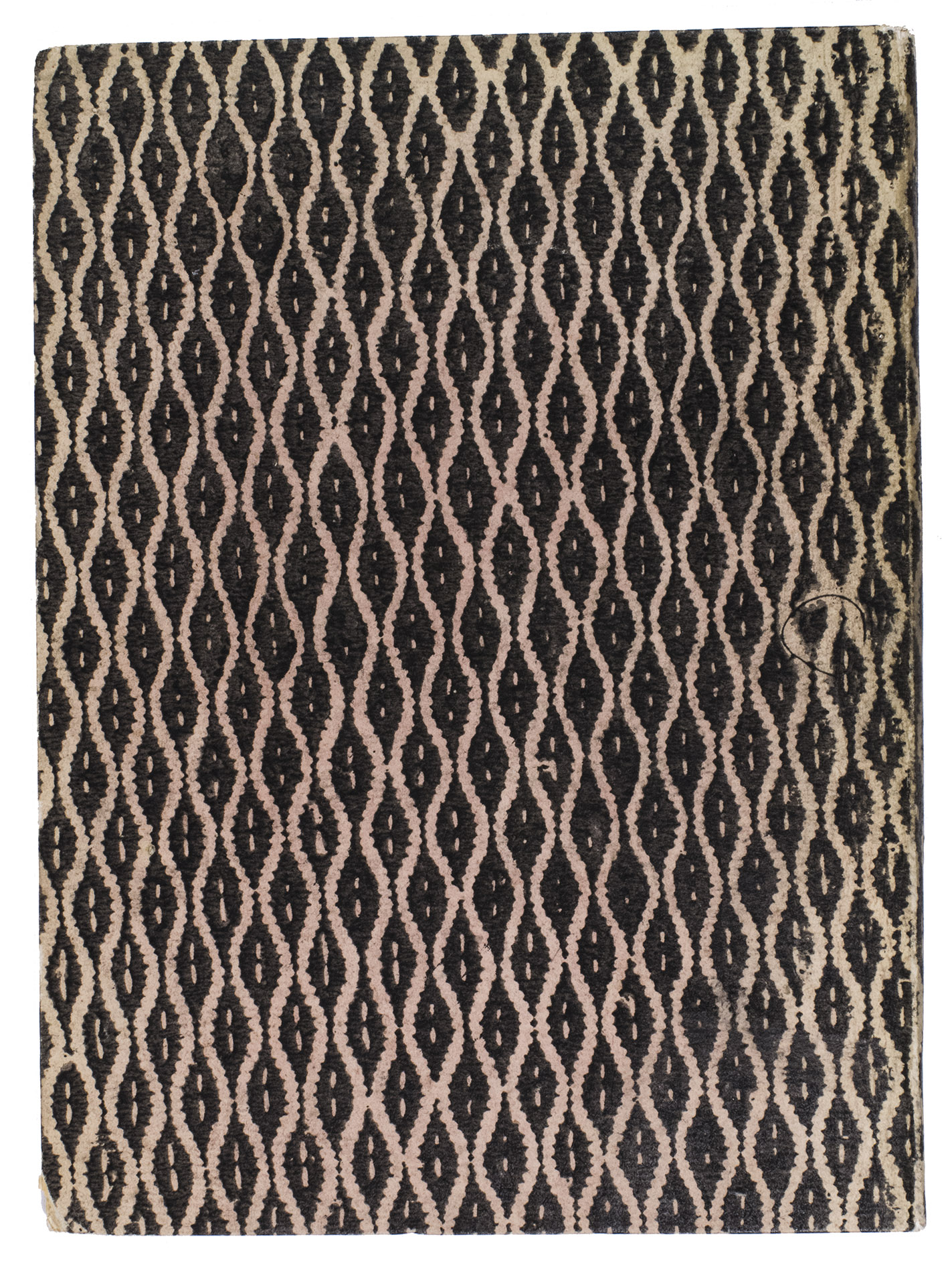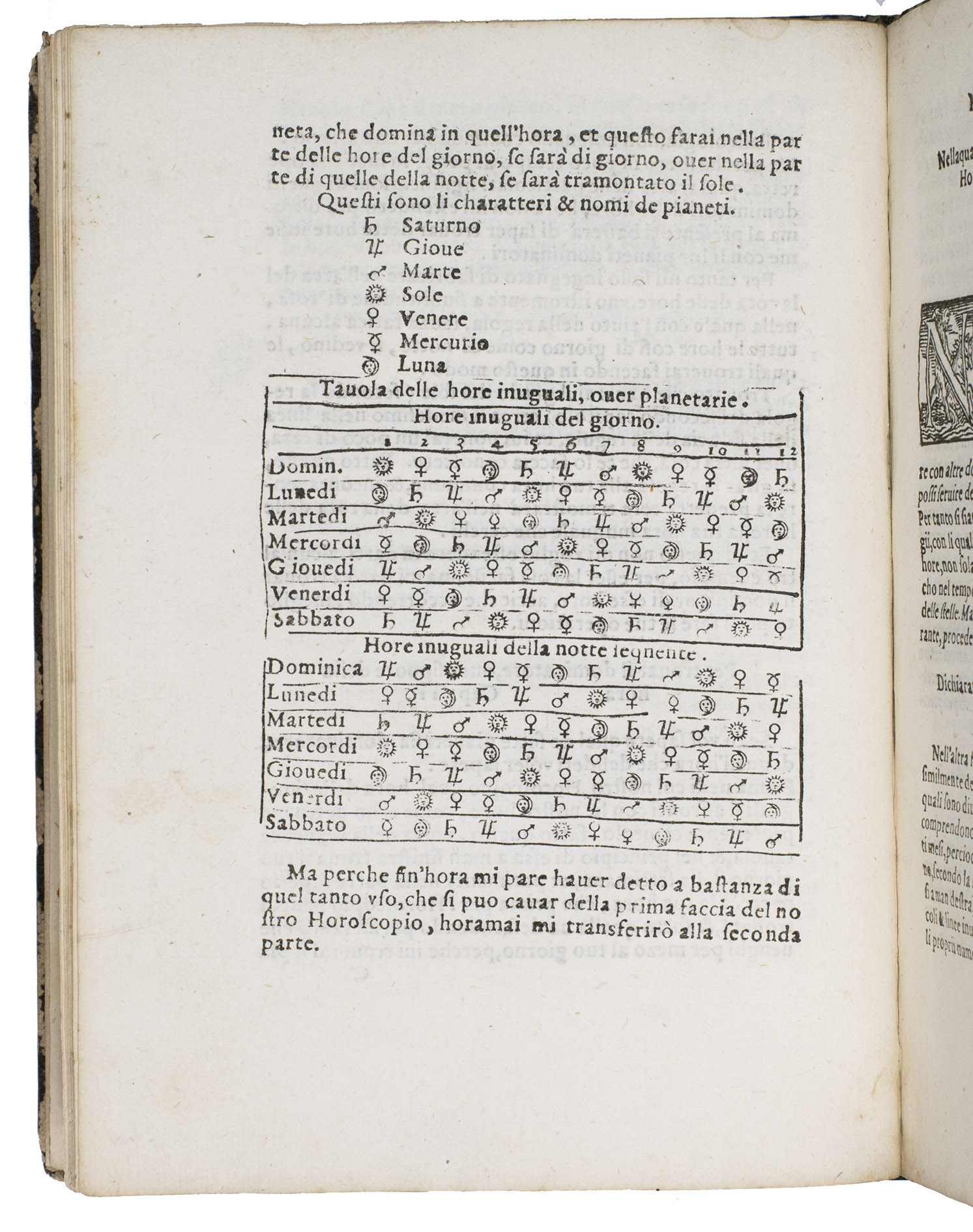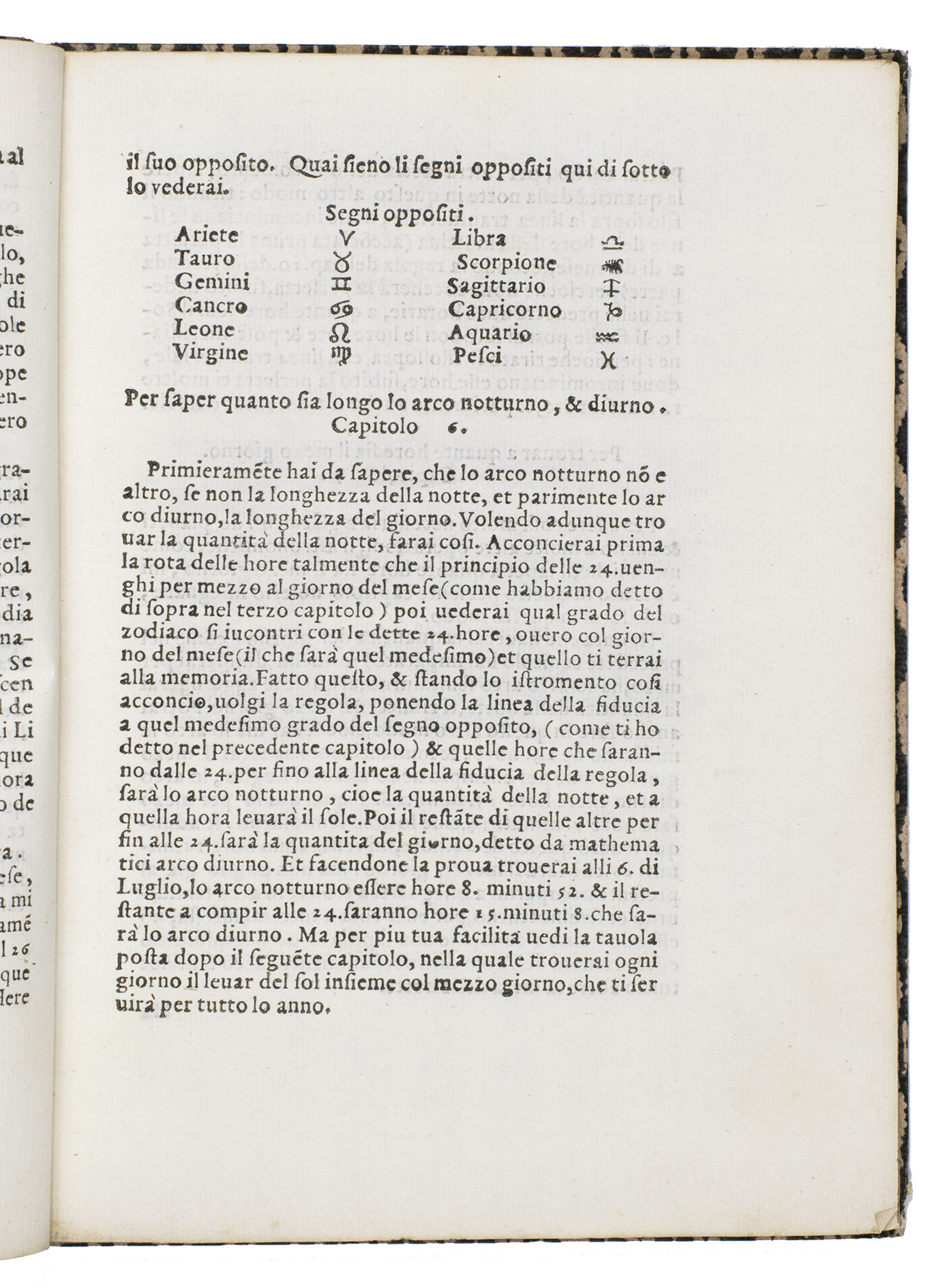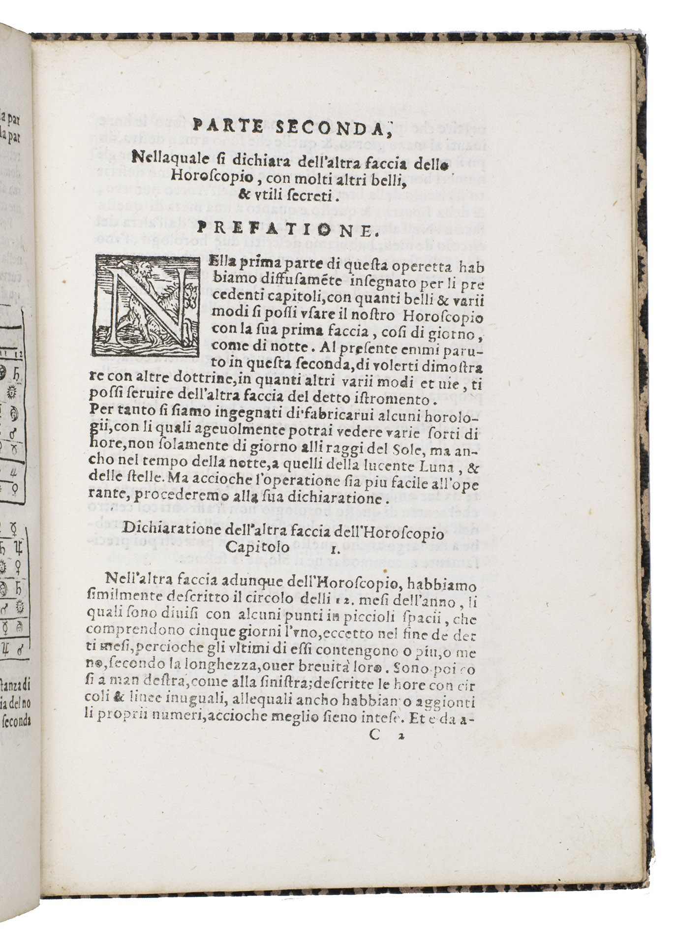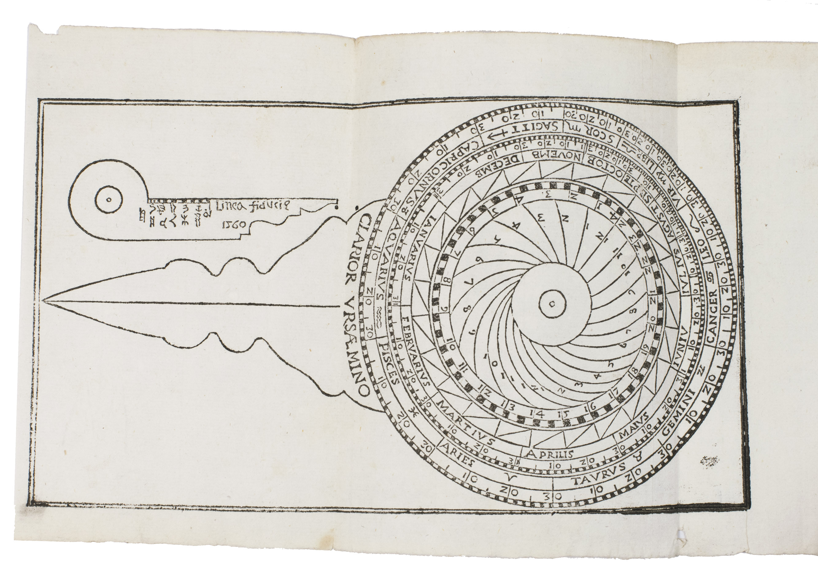 Verona, Paolo Ravagnano, 1560. 4to. With Ravagnanos woodcut emblematic device on the title-page (a hand emerging from a cloud and holding a stalk with three lilies, the whole in an oval in a rectangular scrollwork cartouche, with the motto, "candidio animus"), a folding plate (oblong long folio: 15.5 x 41.5 cm) containing 2 woodcuts (12.5 x 22 cm & 12 cm diameter with the 4.5 cm gnomen making it 14 x 13 cm) designed to be cut up to make the authors "horoscopio" in the form of a volvelle and the sundial-lunar dial, 3 decorated woodcut initials (pictorial), planetary and zodiac signs, and numerous tables of numerical data. 19th-century(?) boards, covered with block-printed decorated paper (black on white). [46], [2 blank] pp.