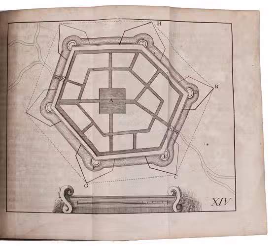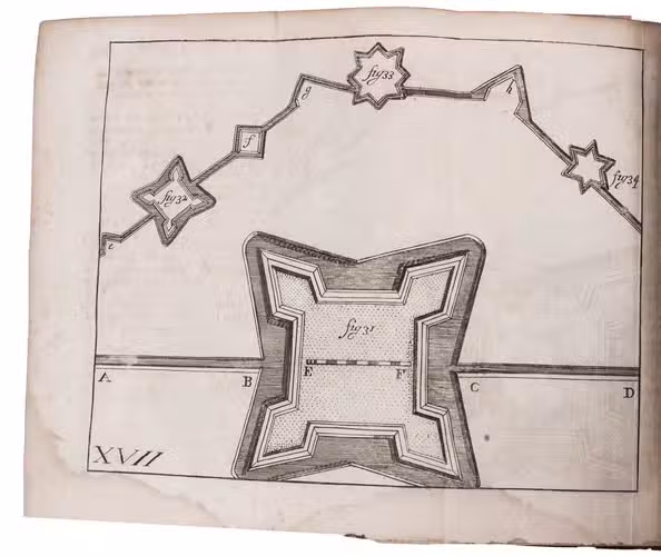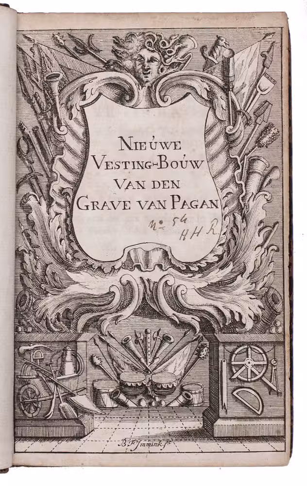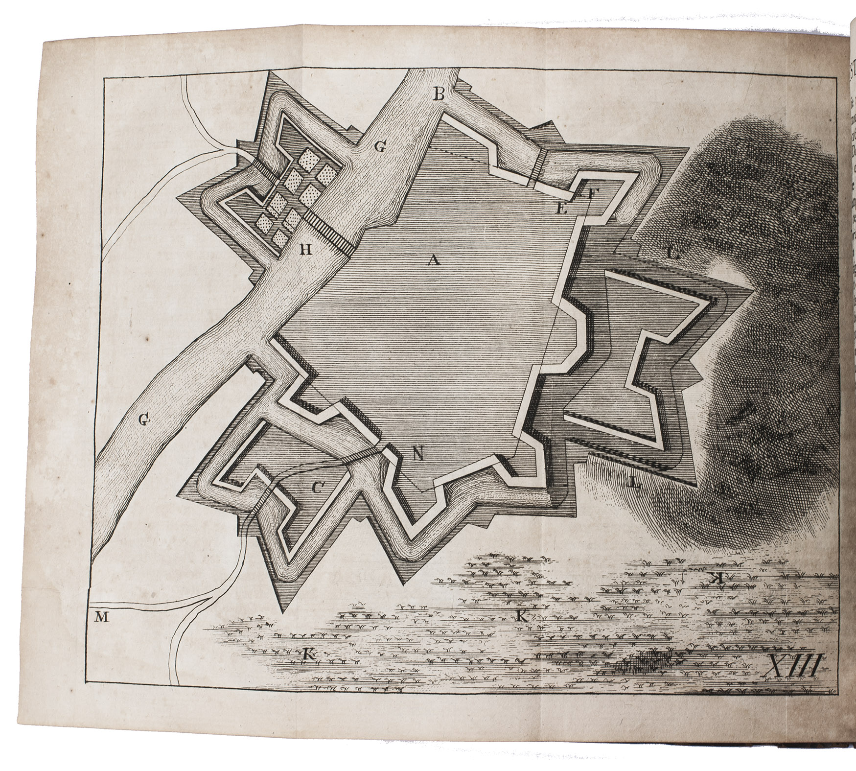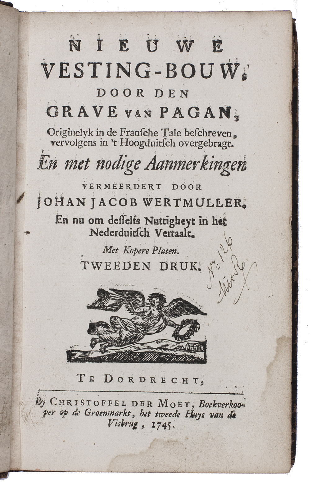 First and only Dutch edition (very rare second and last issue) of a great classic of French fortification by Blaise François Pagan (1604-1665), first published in French in 1645 and here based on the greatly revised and expanded German edition by Johan Jacob Wertmüller, published in 1684. Pagan was a major influence on Vauban, but Vauban's advances in the 1670s rendered the older manual out of date. Wertmüller's 1684 Frankfurt edition brought it up to date, giving it new life for seventy years. The present edition, the last in any language, was first published by Joan Block in The Hague in 1738 and is here reissued with a cancel title-page but with the same engraved half-title, though the title-page calls it a second edition. We have located only one other copy of the 1745 issue, at Leiden University Library.With manuscript notes on the half-title and title-page. With marginal water stains at the lower outside corner and many plates and text quires somewhat browned or foxed, but otherwise in good condition. Binding rubbed, and worn at the hinges. Second copy located of the second issue of the first and only Dutch edition of a classic fortification manual that remained in use for a century. Jähns II, 129 note (no location); Jordan 2777 (citing Jähns: no location); KVK & WorldCat (1 copy); STCN (same copy).