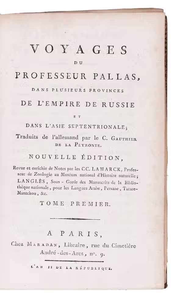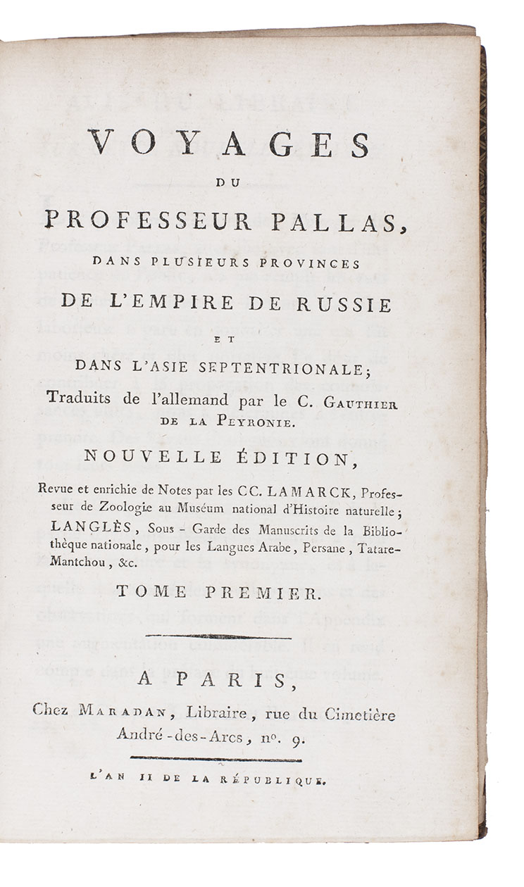 Voyages du professeur Pallas, dans plusieurs provinces de l'empire de Russie et dans l'Asie septentrionale; Traduits de l'allemand par le C. Gauthier de la Peyronie. Nouvelle Édition, Revue et enrichie de Notes par CC. Lamarck ... et Langlès...
