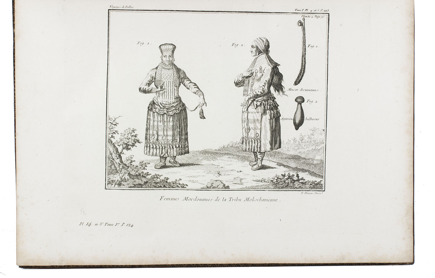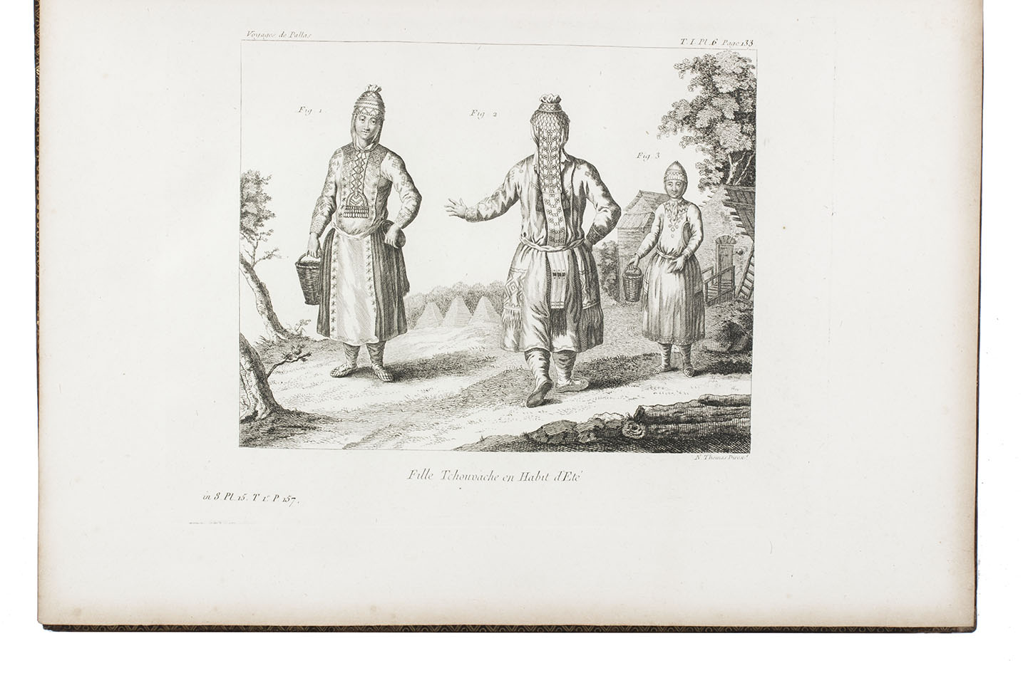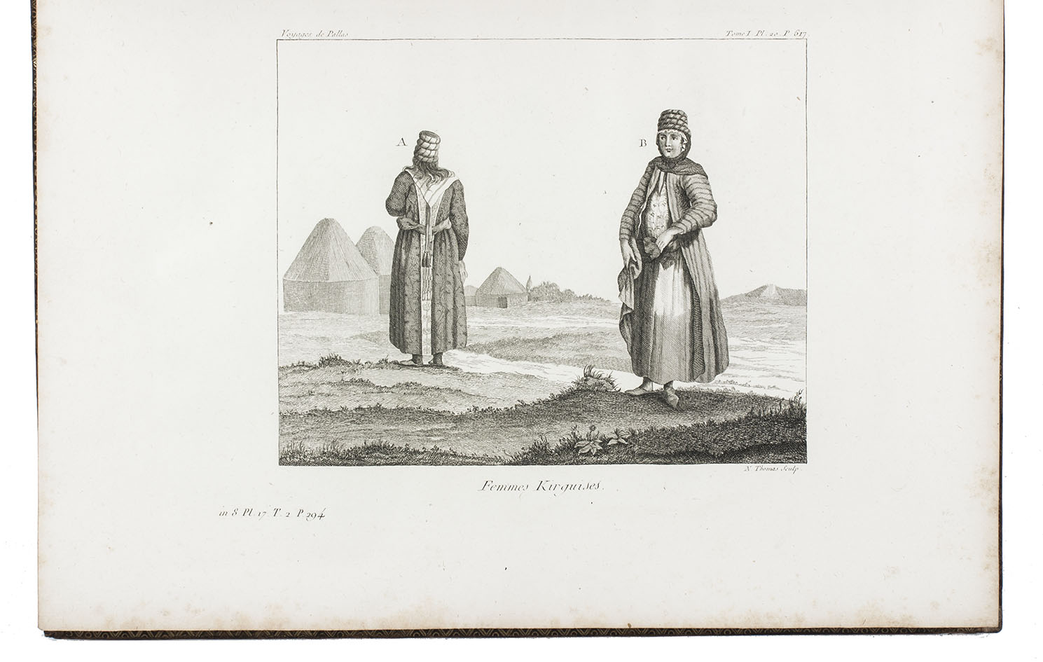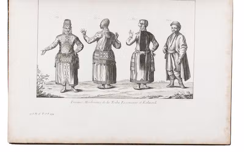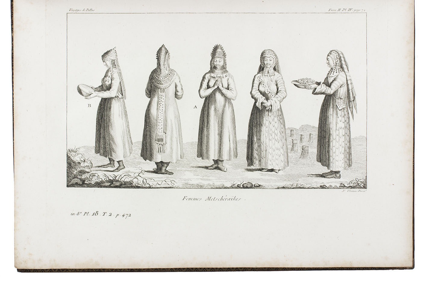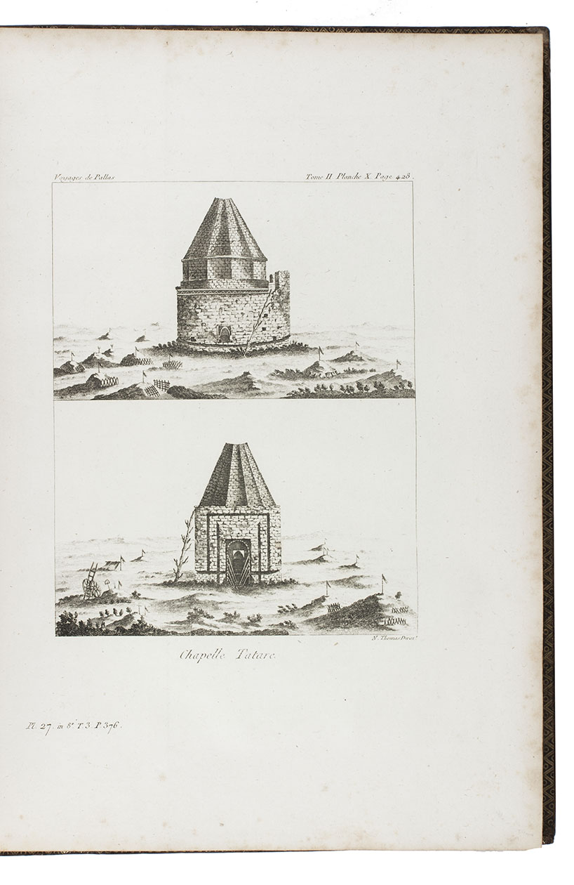 In the years 1768 to 1774 Pallas joined so-called "academic expeditions" which traversed the Russian Empire from west to east. He studied flora and fauna, landscape, geological condition, local population and culture. His findings were published in Reise durch verschiedenen Provinzen des russischen Reichs (3 volumes, St Petersburg 1771-1776). The French translation of the work appeared in five volumes and one atlas-volume, 1788-1793. The present nouvelle édition, revised by Lamarck and Langlès, comprises eight text-volumes and one atlas volume with maps and plates. The large map of Russia (55 x 117 cm) is accompanied by ten others of parts of Russia (three folding and two double-page). The other illustrations show plants (ca. 58), costumes, animals, buildings, inscriptions etc.