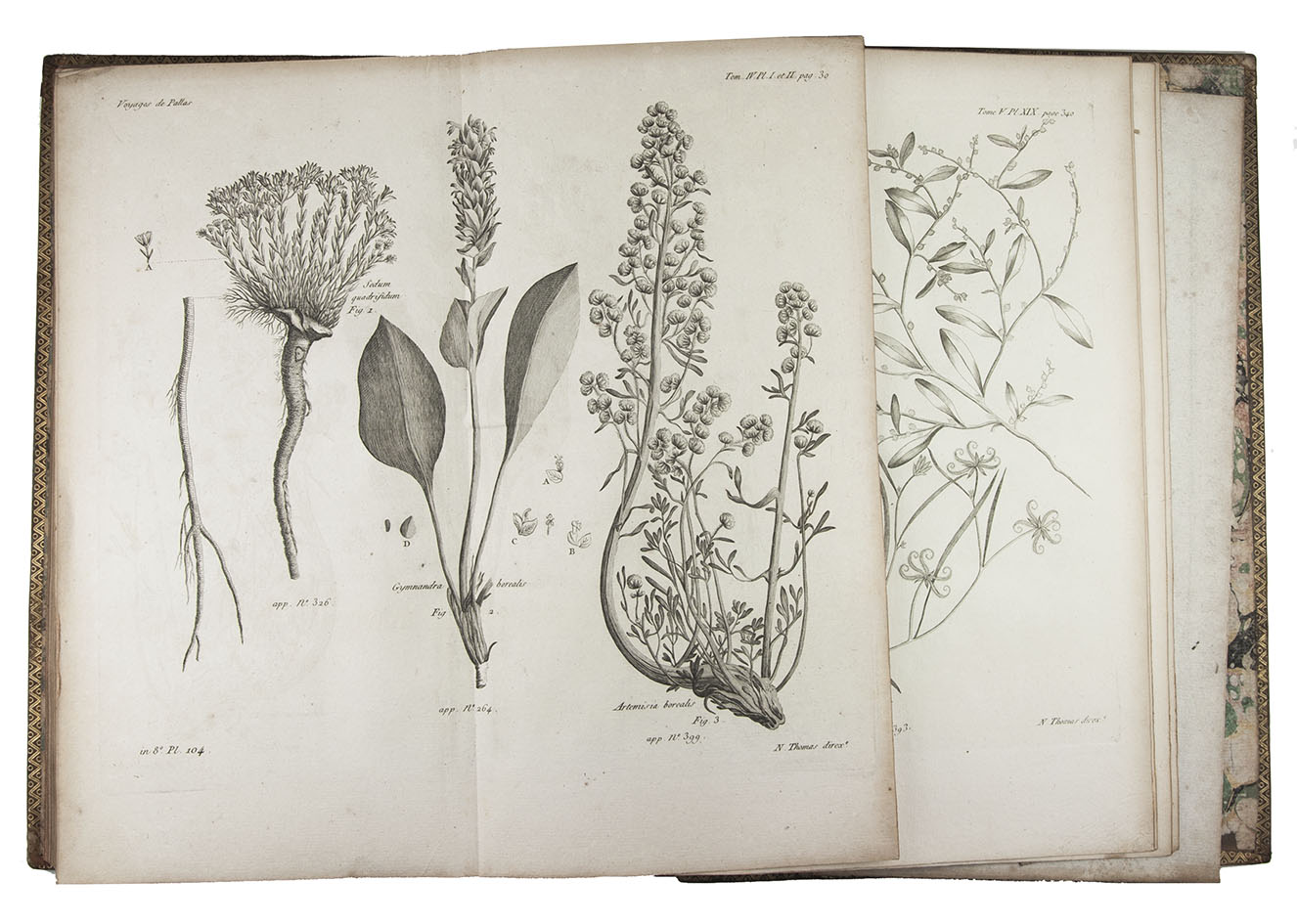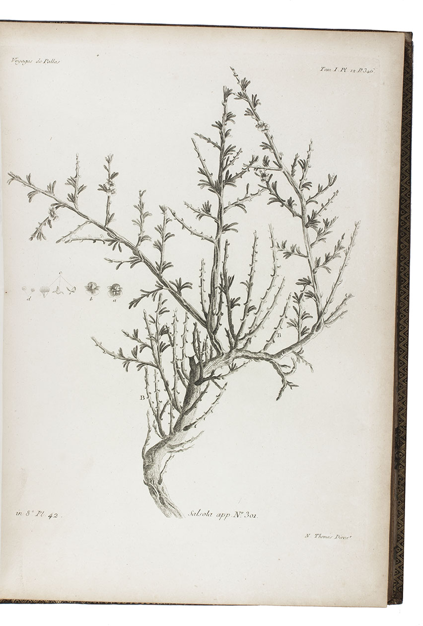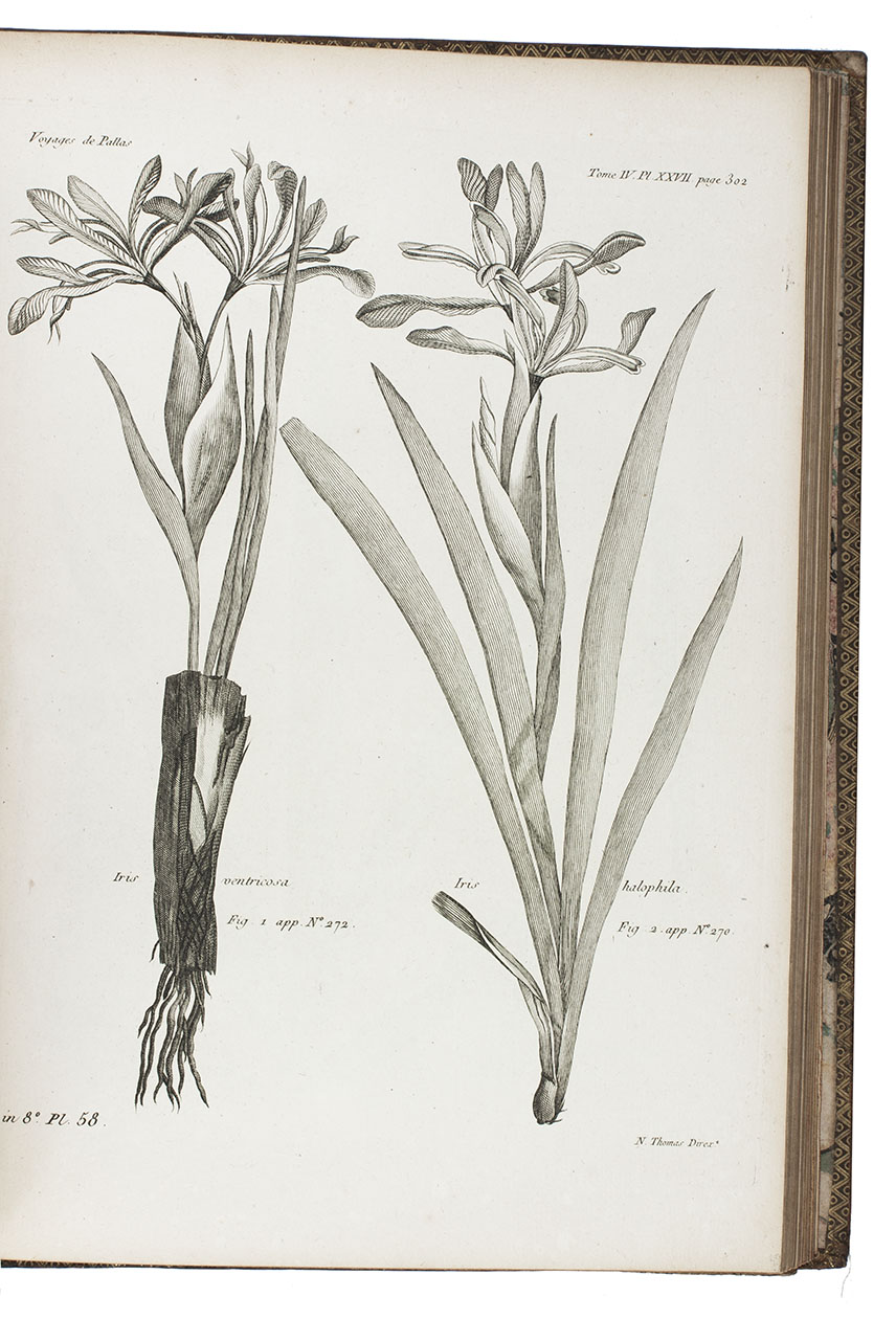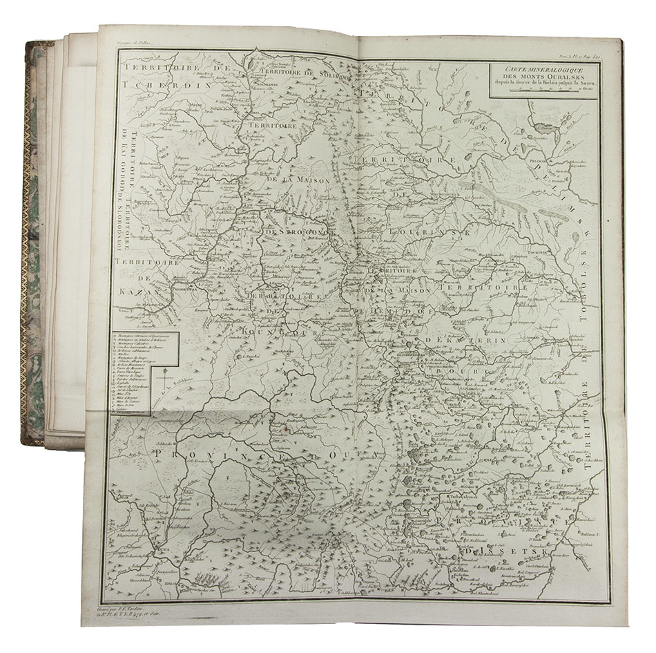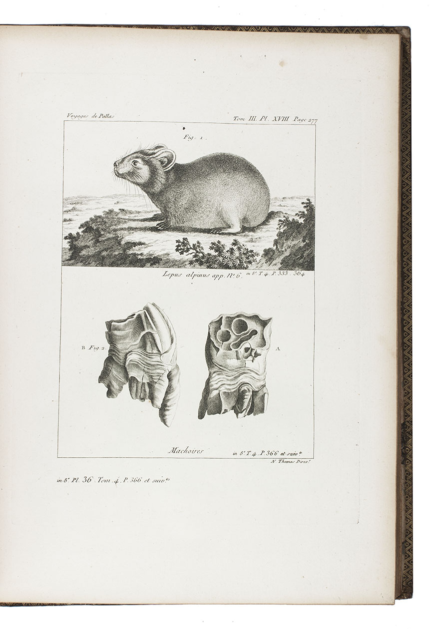 Second French edition of Pallas's 1768-1774 journeys through Russia. Peter Simon Pallas (Berlin 1741-1811) studied medicine and natural history in Germany, Holland, and England. In 1767 he went to St Petersburg and began to conduct research in Russia. He was an eminent botanist, zoologist and geographer, and "sought to advance from merely describing nature to finding the causal interrelationships and hidden regularities of natural phenomena." Darwin acknowledged his work to have been influential in the development of evolutionary ideas (DSB ).