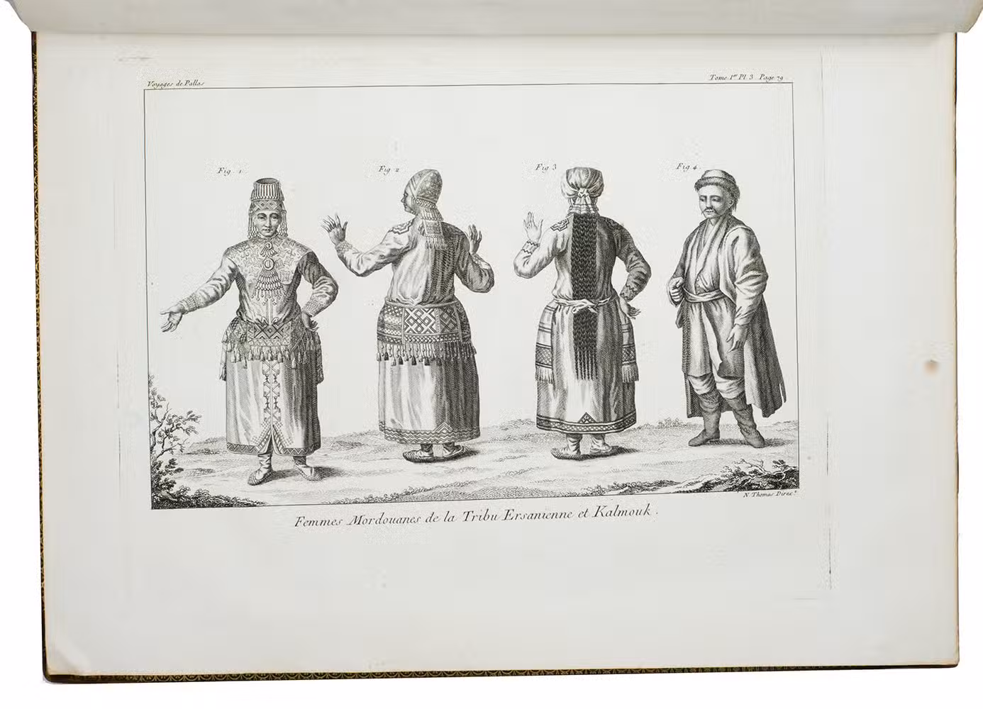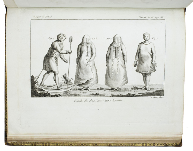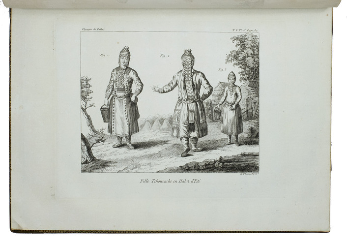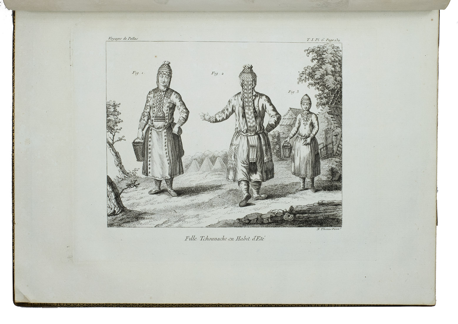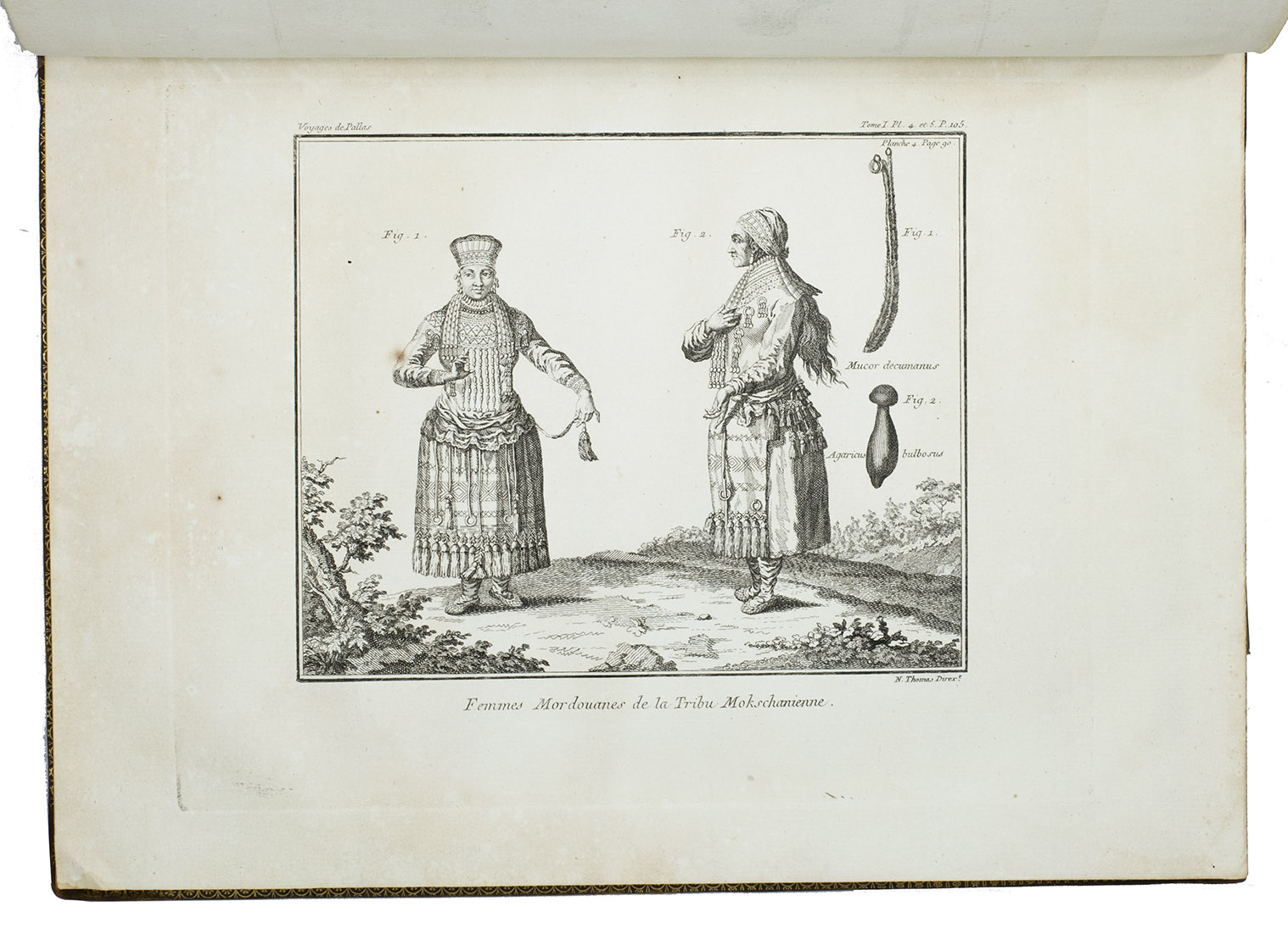 Pallas also describes his journey through the less-visited regions of the Russian Empire, depicted in 11 maps (including a large folding map of the Russian Empire) and he describes the population (depicted with their costumes in several plates) and the economy of each area. Although a large amount of the 5 text volumes are, because of Pallas's background, on geology, geography, climate and flora and fauna and were of great importance for the natural science of Russia, the volumes are more than that: they contain a sketch of the Russian Empire in the years 1768-1774 and are a beautiful witness of the first "academic expedition".