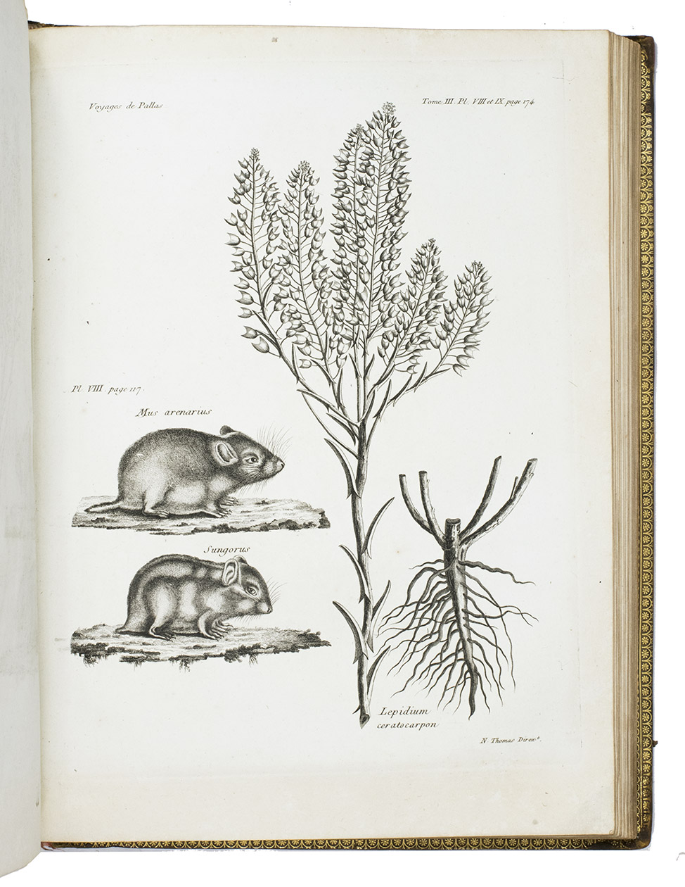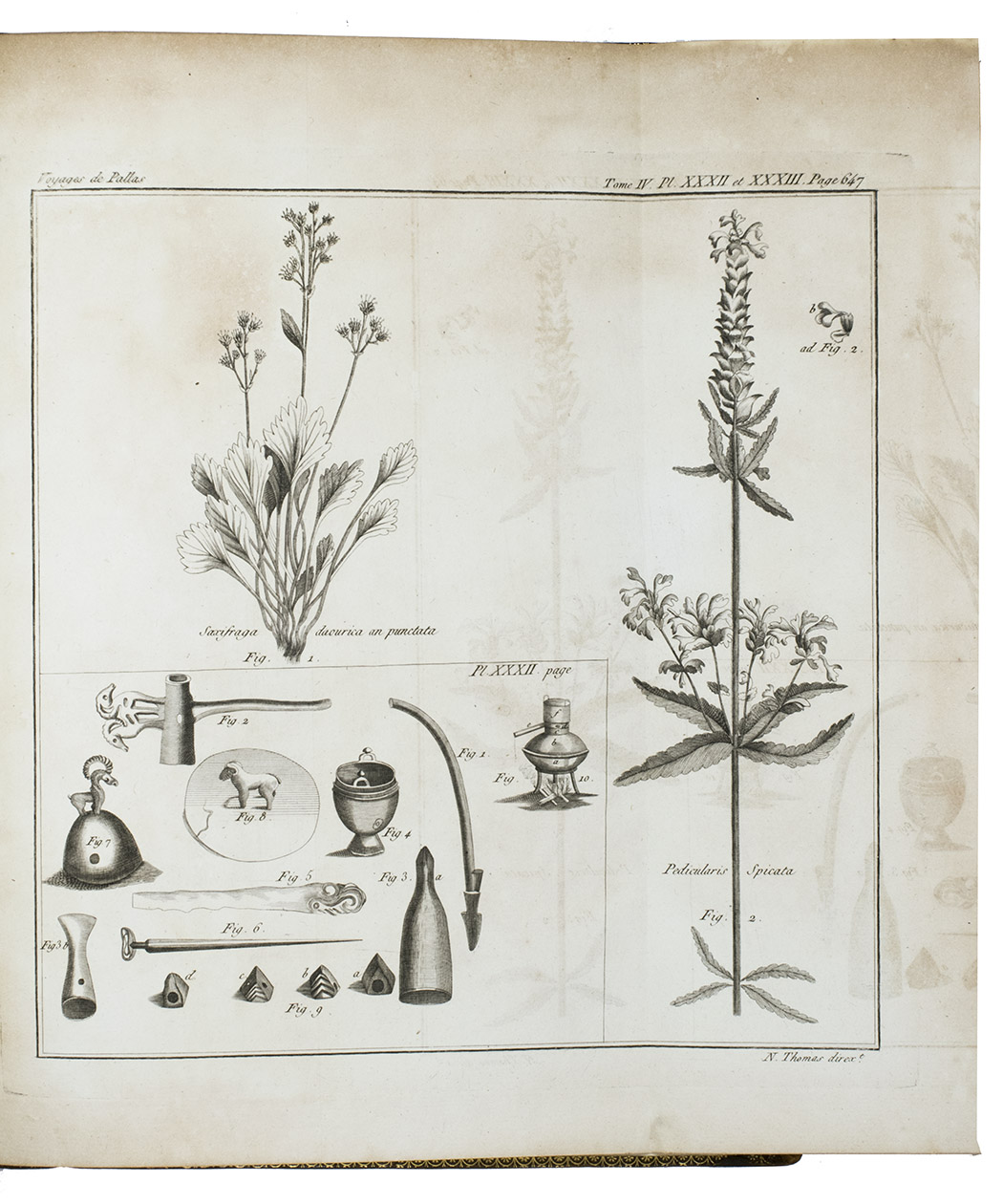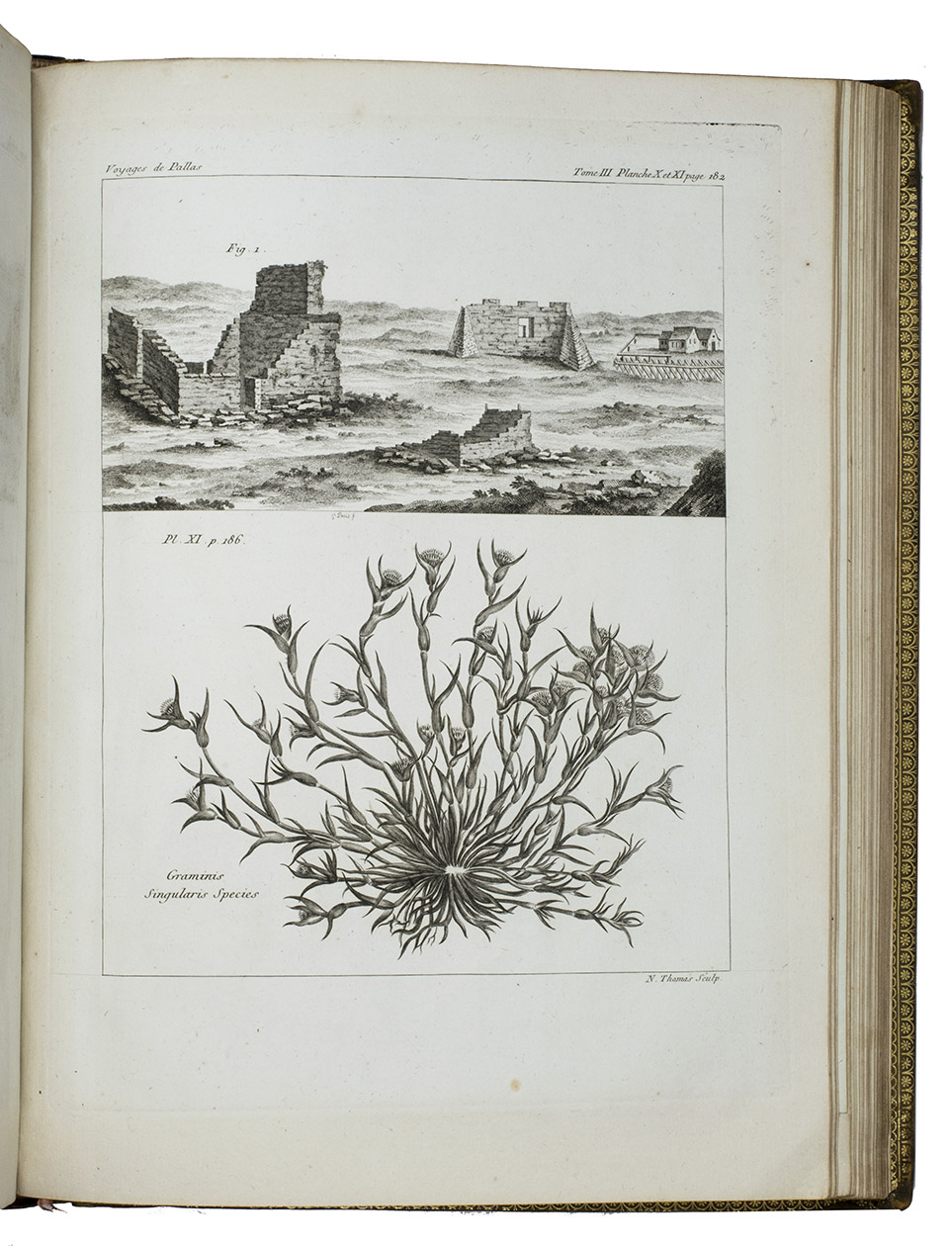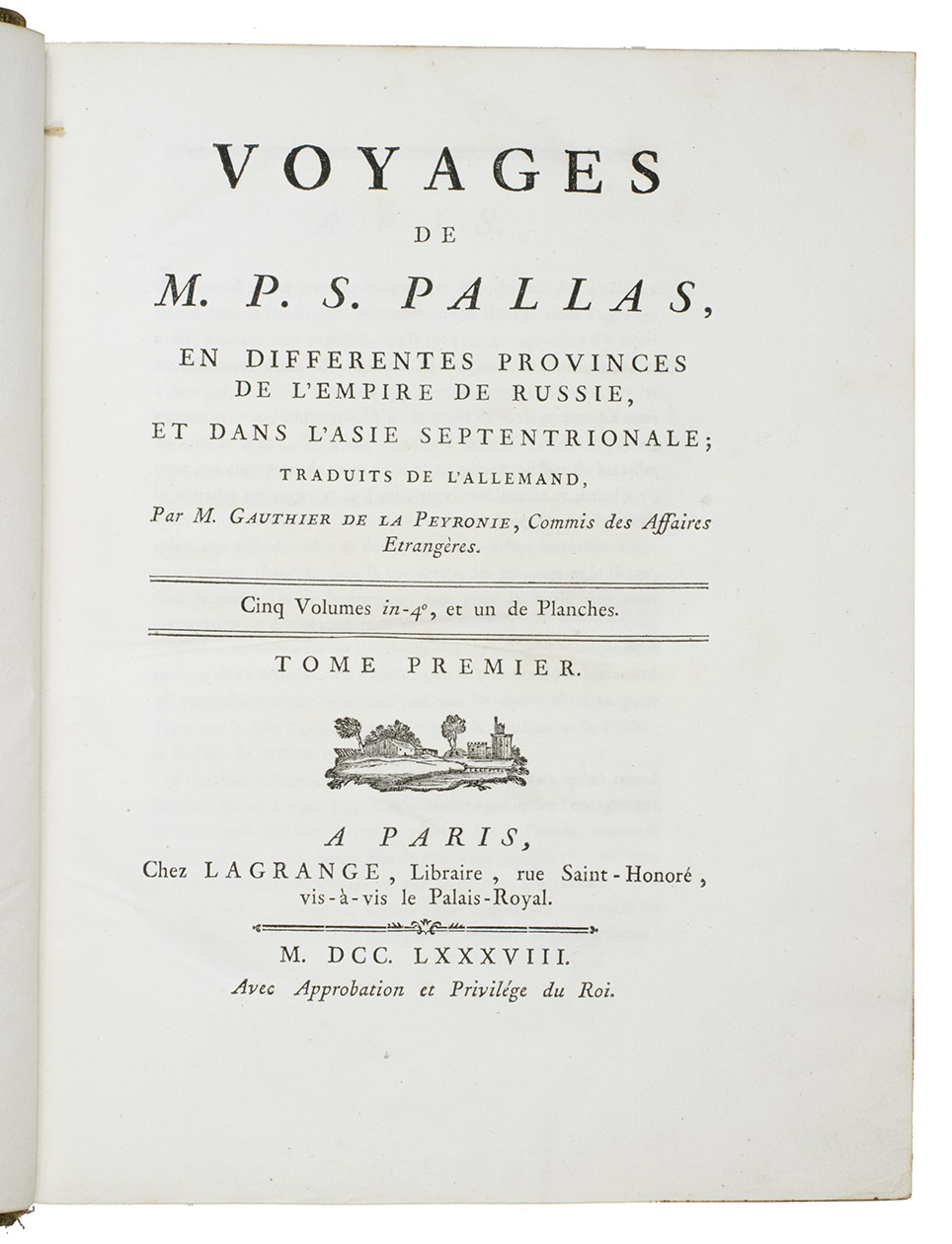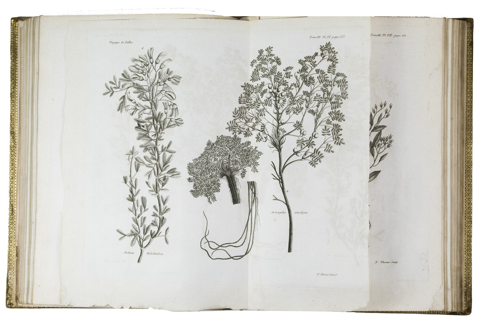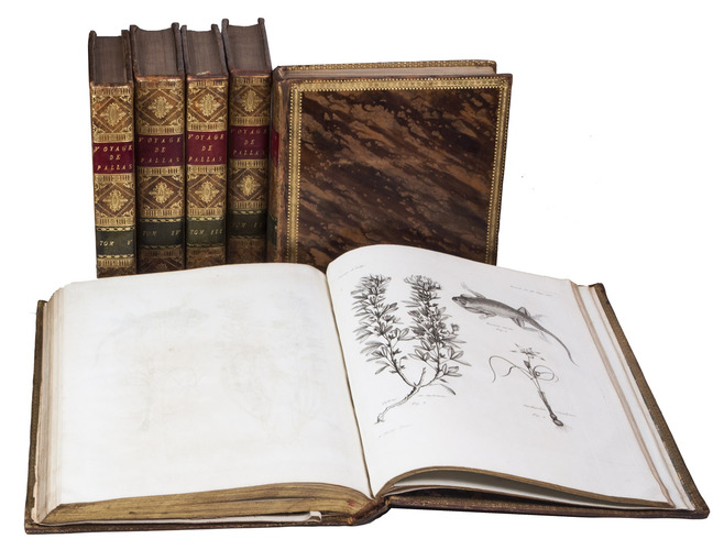 First edition of the French translation of Peter Simon Pallas's (1741-1811) famous account of his first expedition to Russia and Siberia, one of the "academic expeditions" undertaken by the Academy of Sciences in St Petersburg (1768-1774). One of Pallas's chief geological contributions from the expedition was "the recognition of temporal sequence of rocks from the centre to the flanks of a range" (DSB), mainly based on his study of the Ural and Altai Mountains. He describes numerous Russian plants, many depicted in the 123 plates, along with some birds and other animals living in the Russian areas he visited.