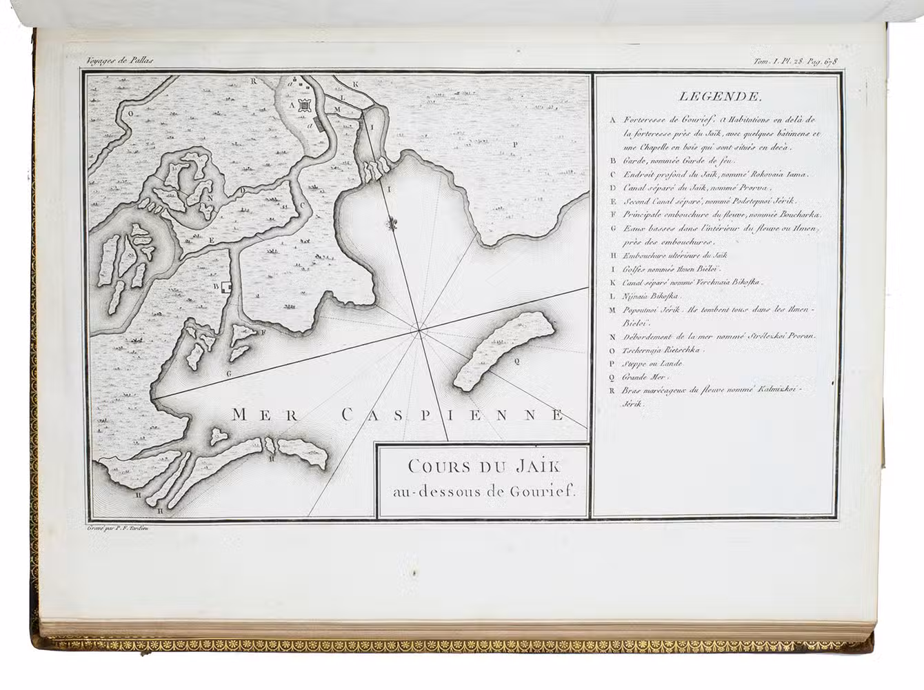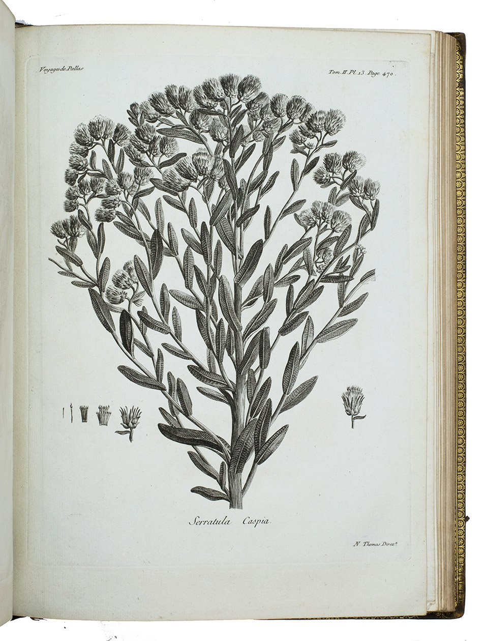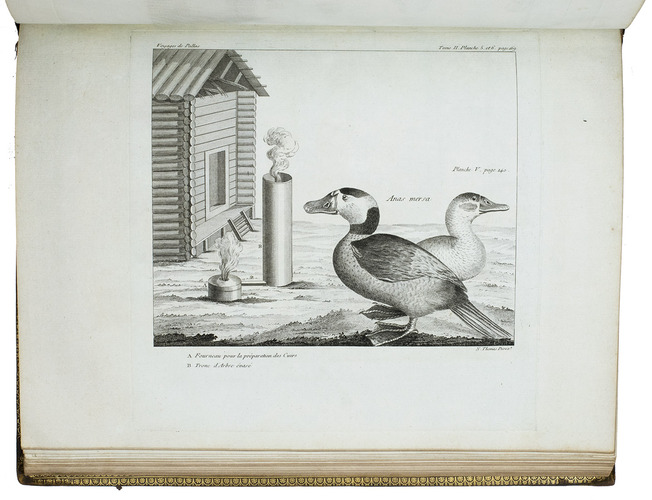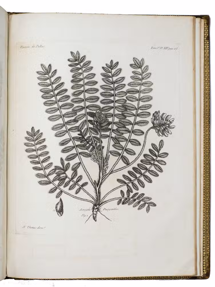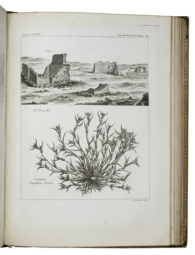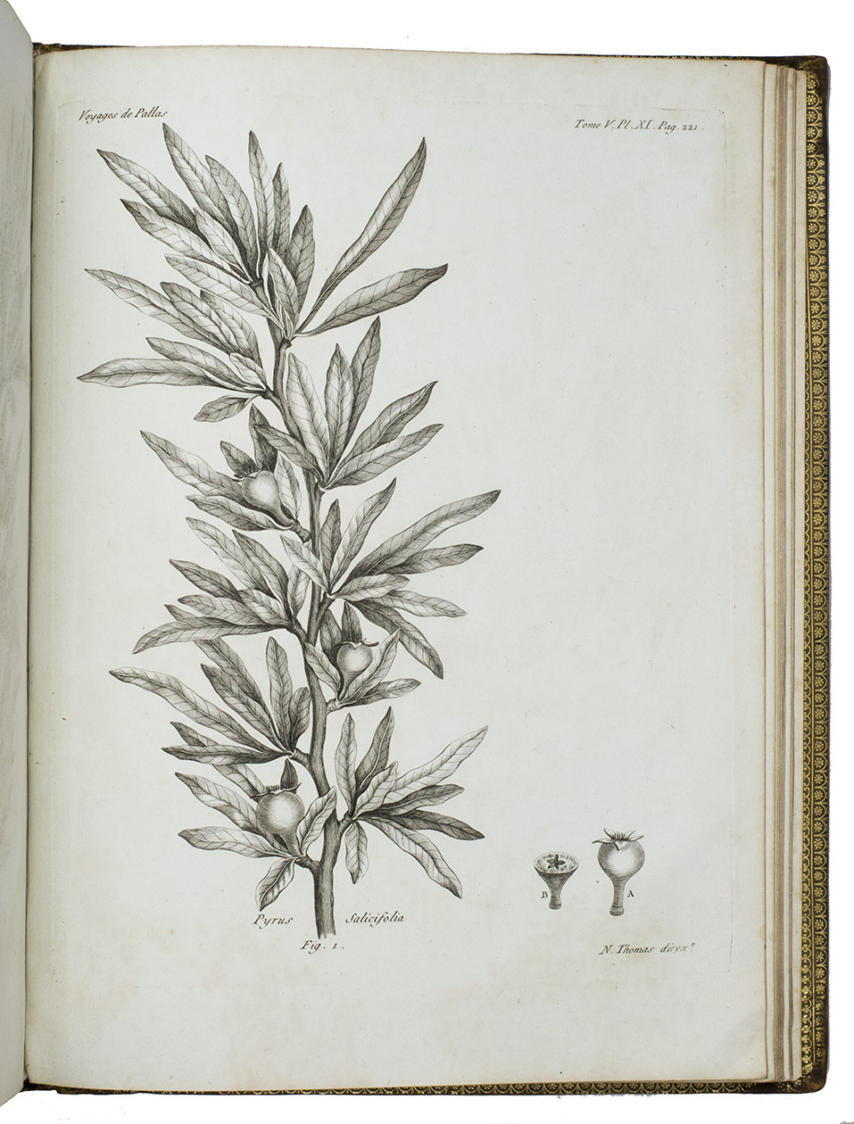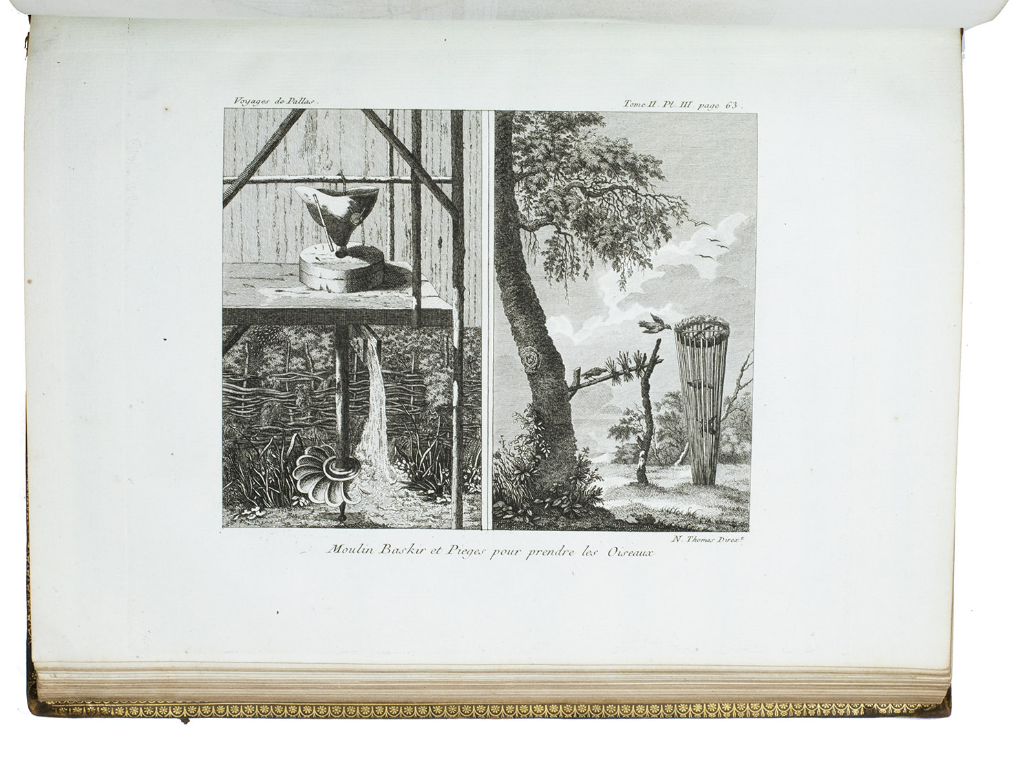 First edition of the French translation of Peter Simon Pallas's (1741-1811) famous account of his first expedition to Russia and Siberia, one of the "academic expeditions" undertaken by the Academy of Sciences in St Petersburg (1768-1774). One of Pallas's chief geological contributions from the expedition was "the recognition of temporal sequence of rocks from the centre to the flanks of a range" (DSB), mainly based on his study of the Ural and Altai Mountains. He describes numerous Russian plants, many depicted in the 123 plates, along with some birds and other animals living in the Russian areas he visited.