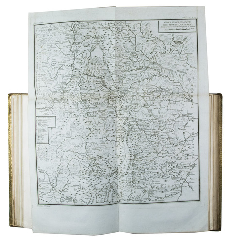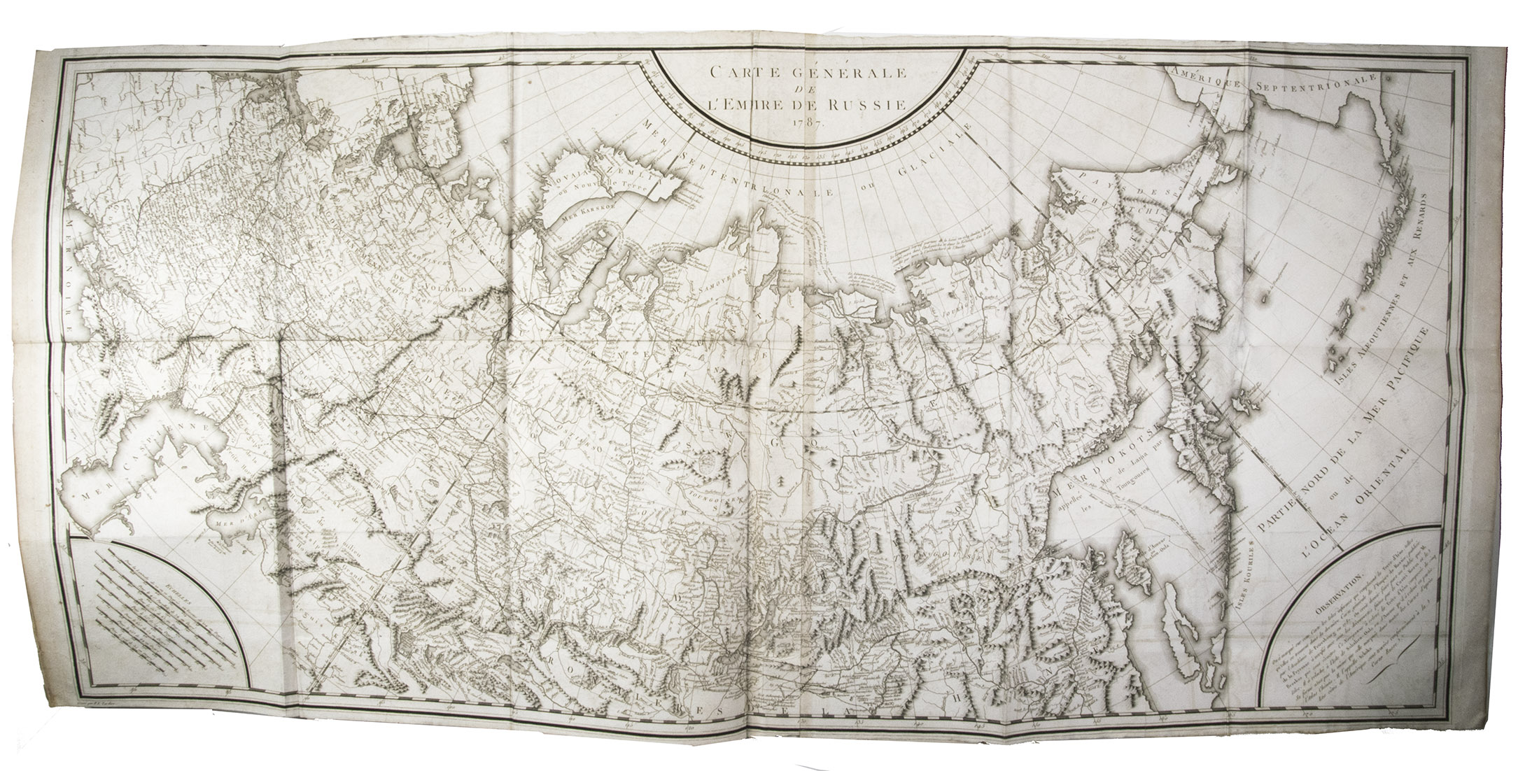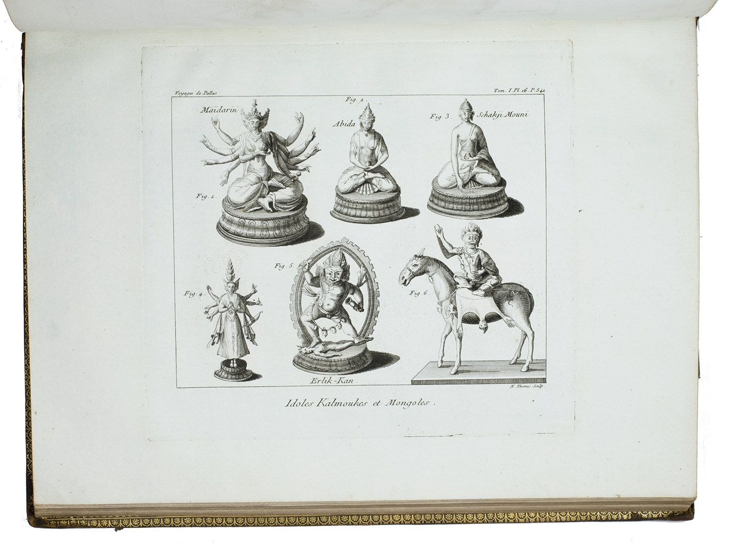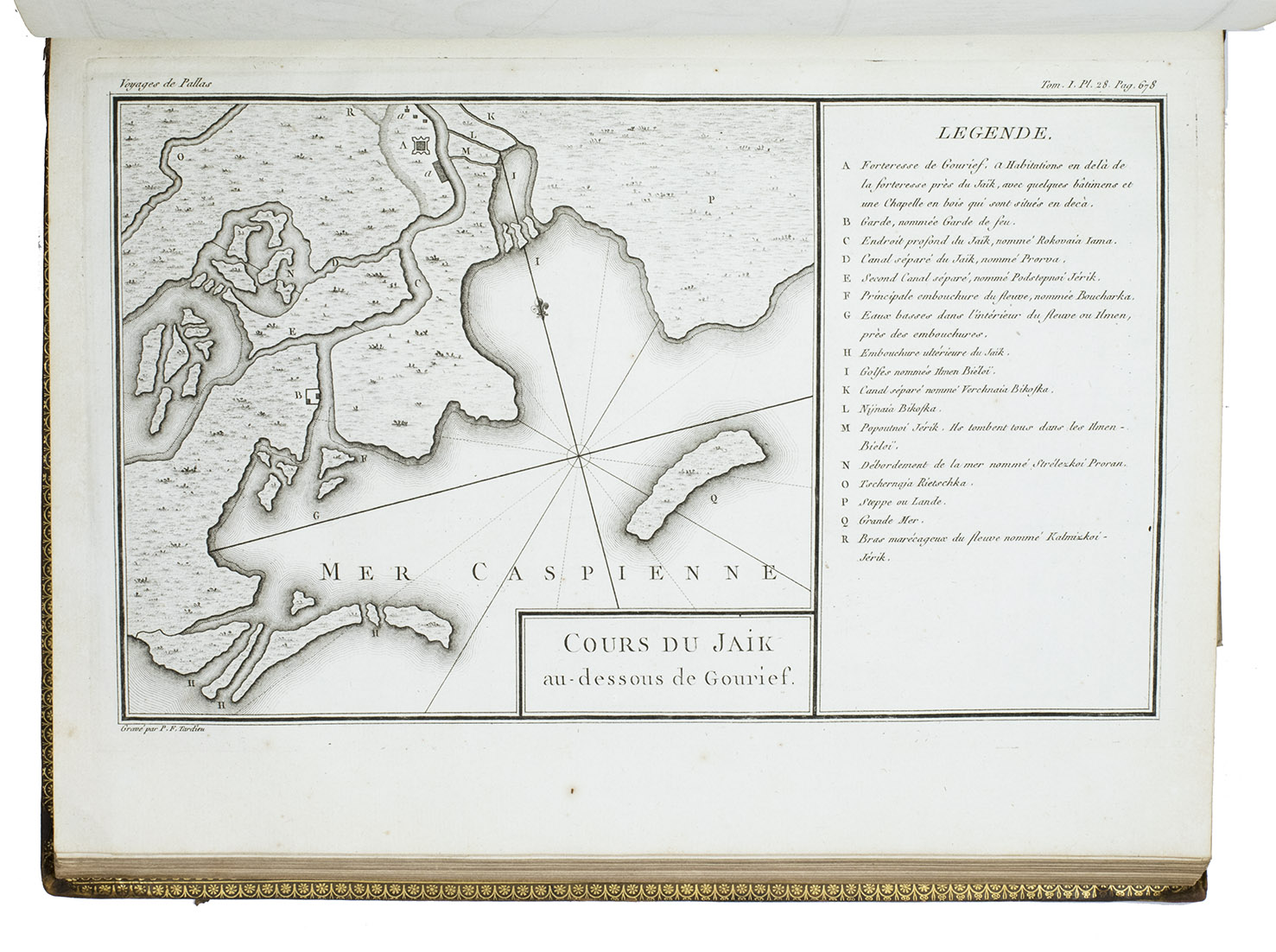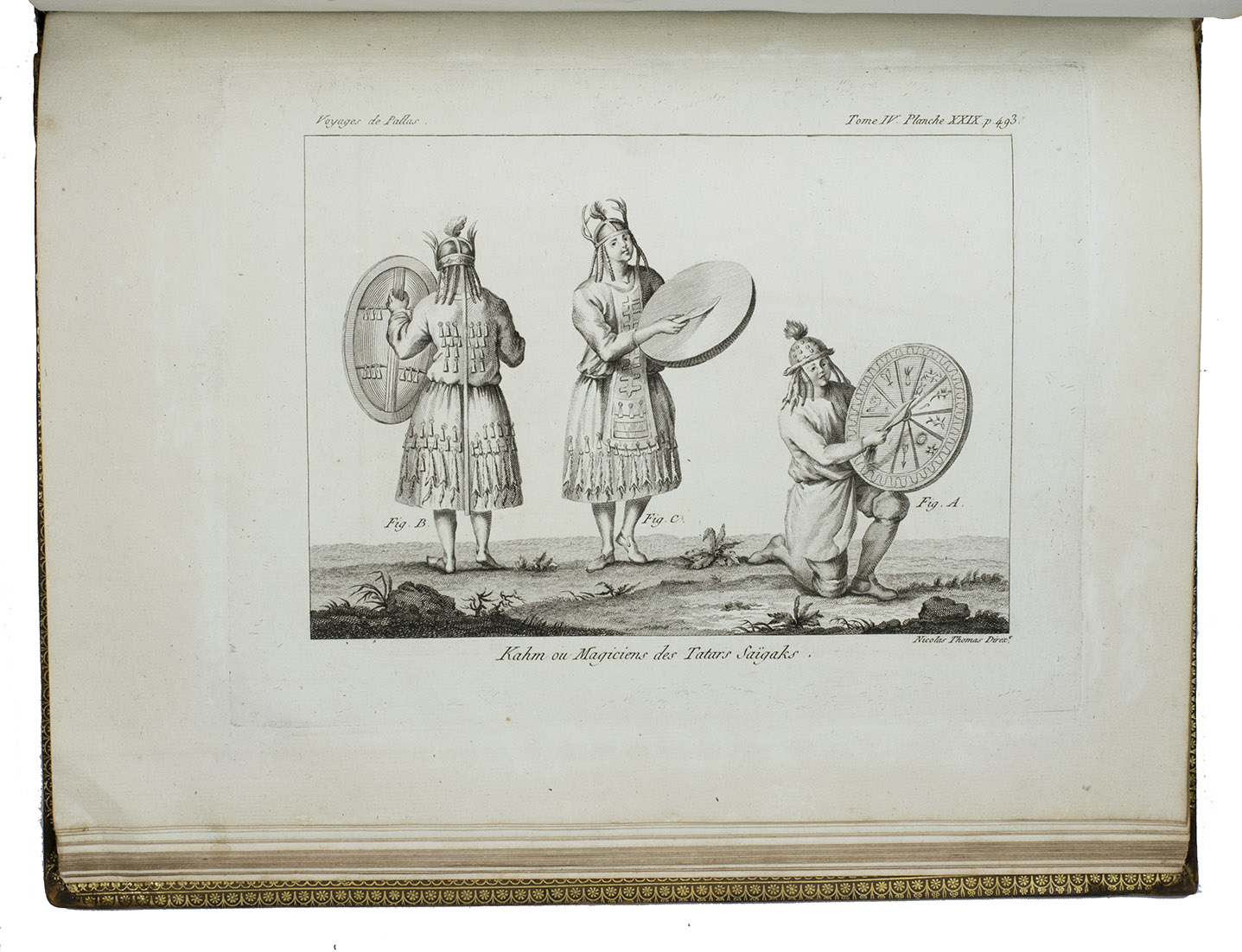 Paris, Lagrange (vol. 1), Maradan (vol. 2-5; colophon of vol. 5: printed by Demonville), 1788-1793. 5 text volumes (4to) and 1 atlas volume (Imperial 4to: 33.5 x 25 cm). With 123 engraved plates and maps (27 folding), including a large folding map of the Russian Empire. Uniform gold-tooled tree calf, gilt edges. [3], [1 blank], XXXII, 773, [5]; [4], 550, [1], [1 blank]; [3], [1 blank], 492; [3], [1 blank], 722, [2]; [3], [1 blank], 559, [1] pp; atlas volume with 123 plates on 108 leaves.